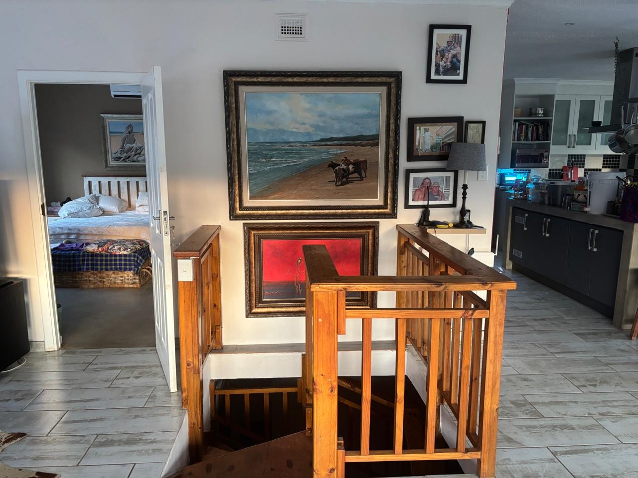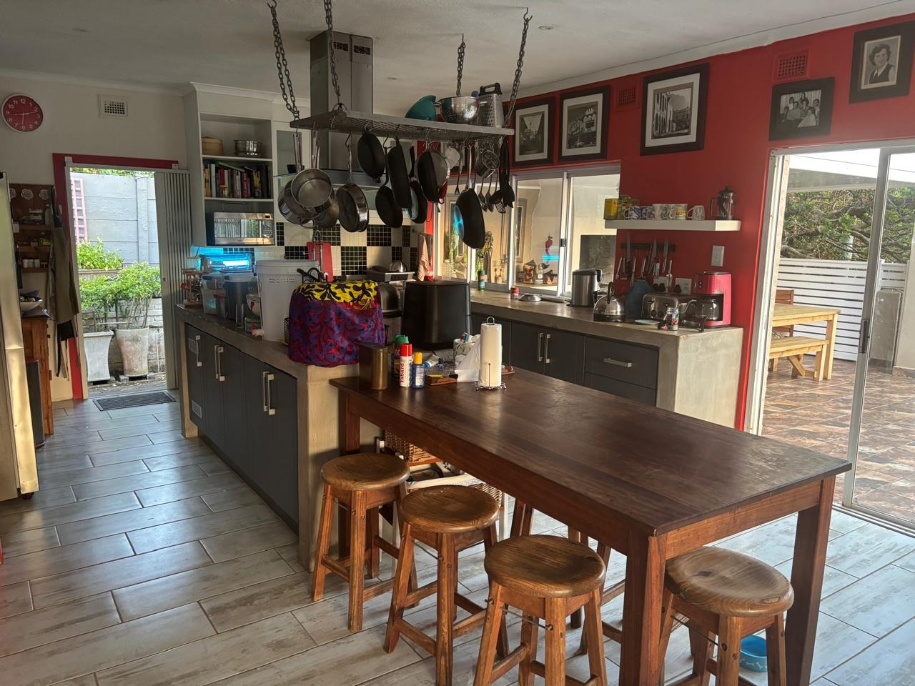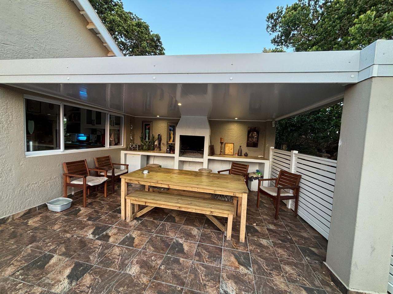 The functional kitchen is equipped with a large island, gas hob, and ample concrete counter space, perfect for culinary enthusiasts. The residence comprises three comfortable bedrooms and two bathrooms, including one ensuite, providing ample space for family living. Enjoy outdoor leisure with a sparkling swimming pool set amidst the private garden, complemented by a built-in braai for entertaining. A balcony offers sea views, enhancing the coastal experience.