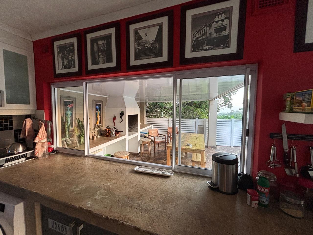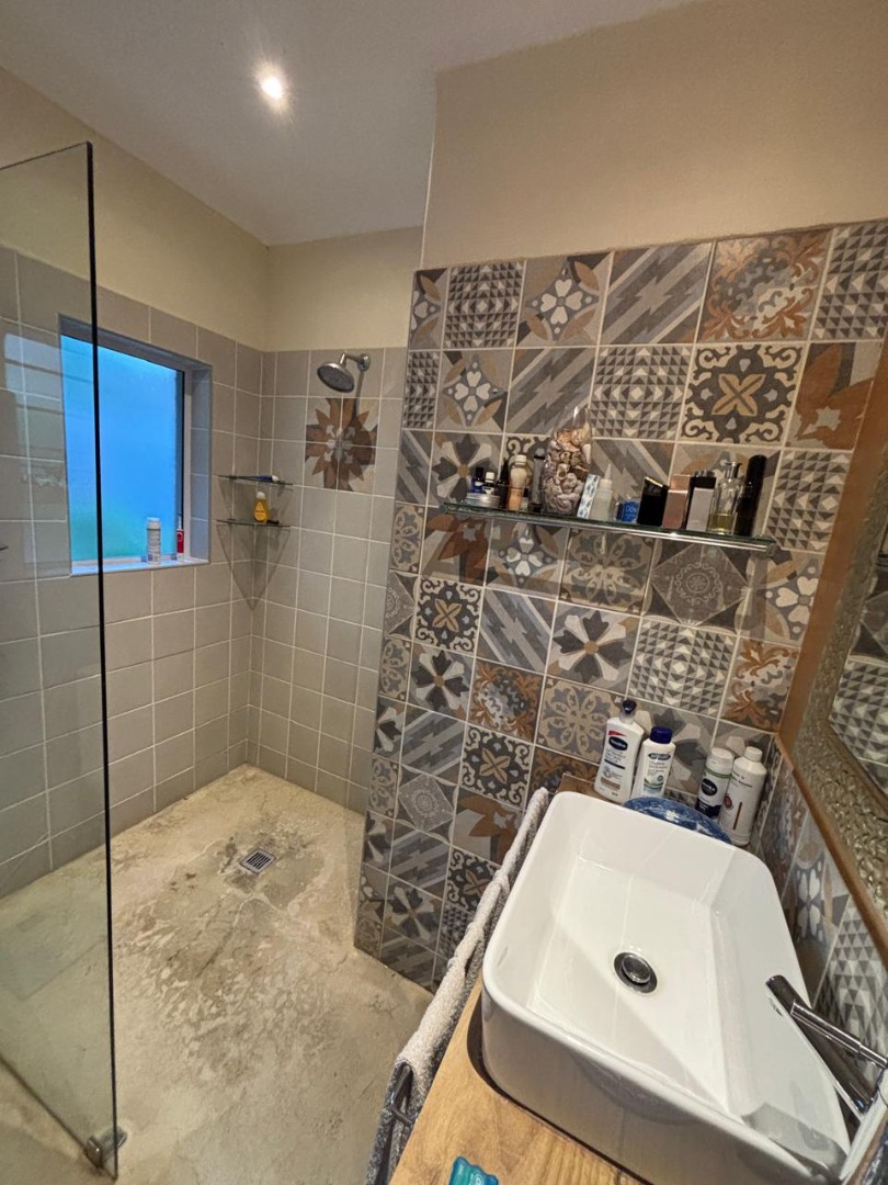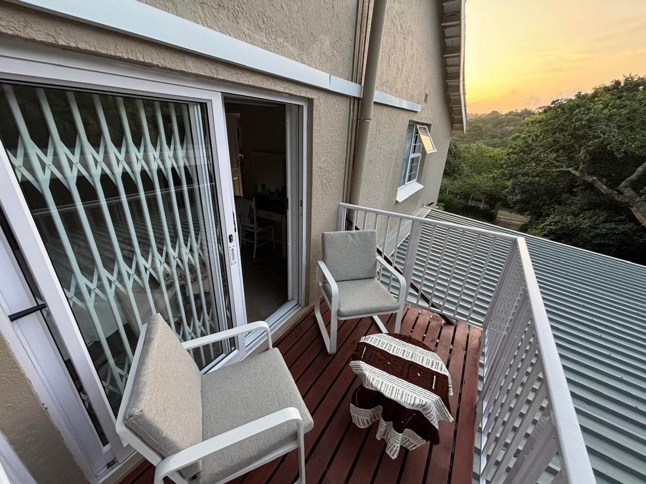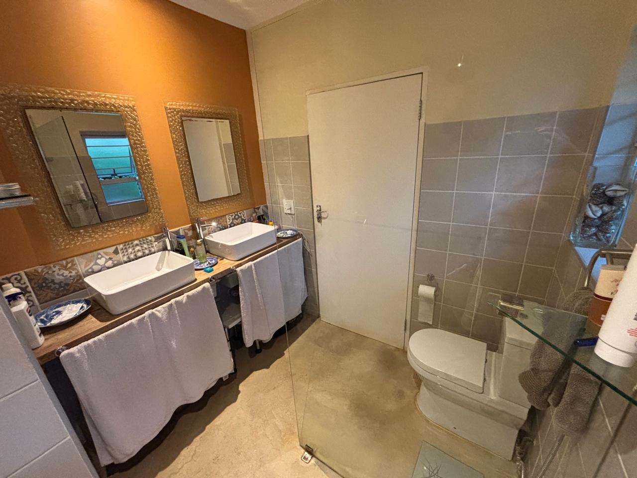 The functional kitchen is equipped with a large island, gas hob, and ample concrete counter space, perfect for culinary enthusiasts. The residence comprises three comfortable bedrooms and two bathrooms, including one ensuite, providing ample space for family living. Enjoy outdoor leisure with a sparkling swimming pool set amidst the private garden, complemented by a built-in braai for entertaining. A balcony offers sea views, enhancing the coastal experience.