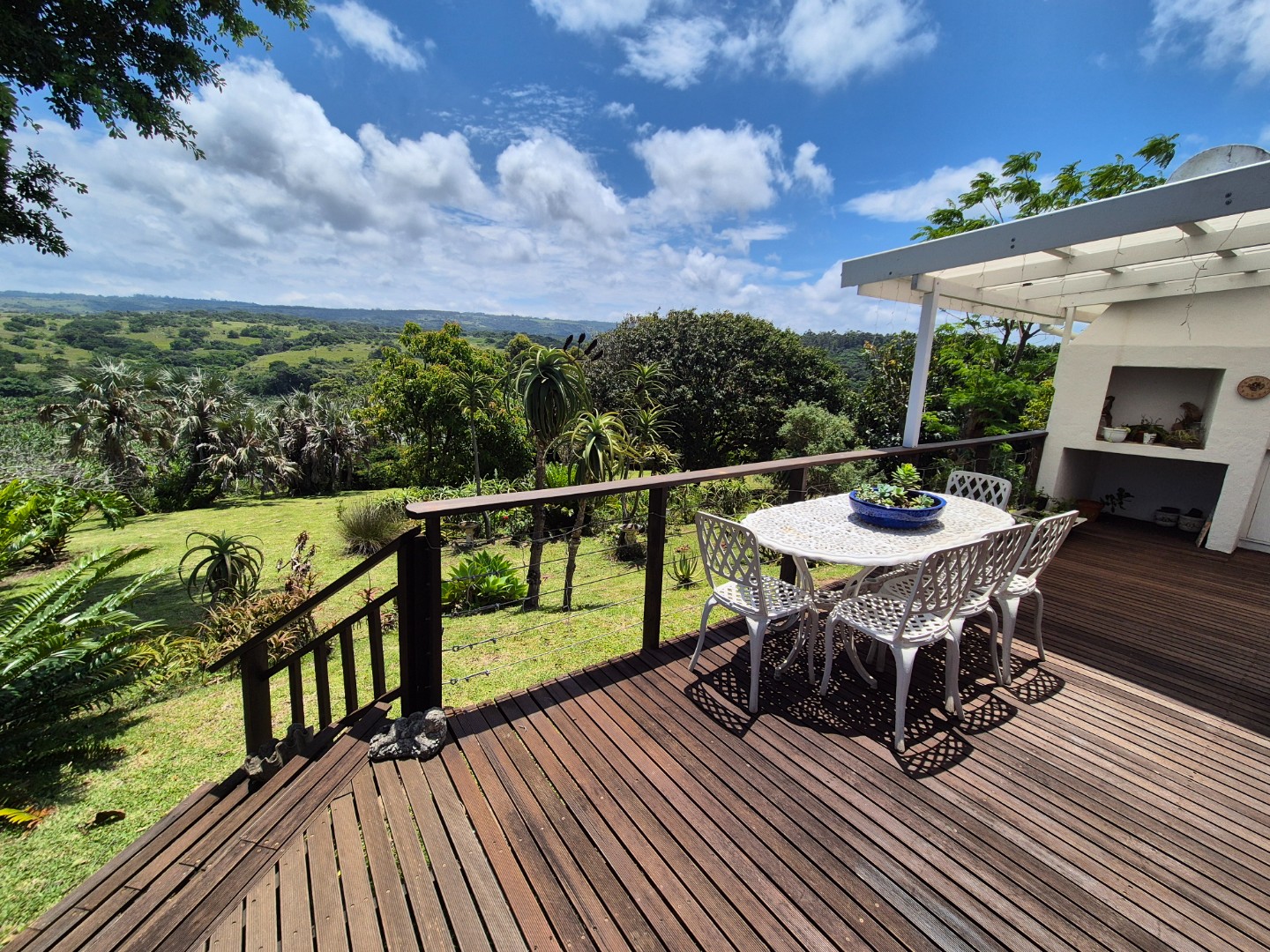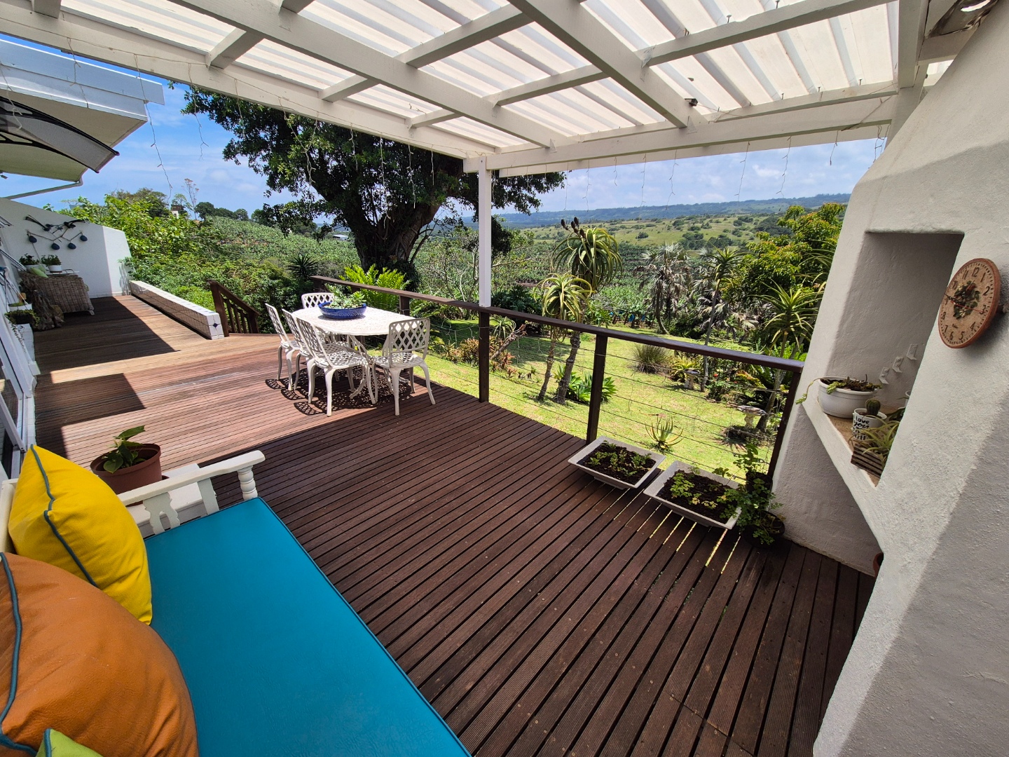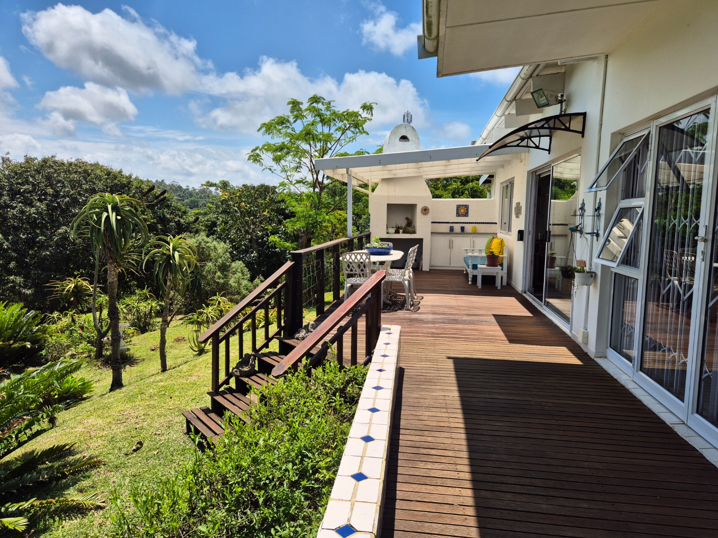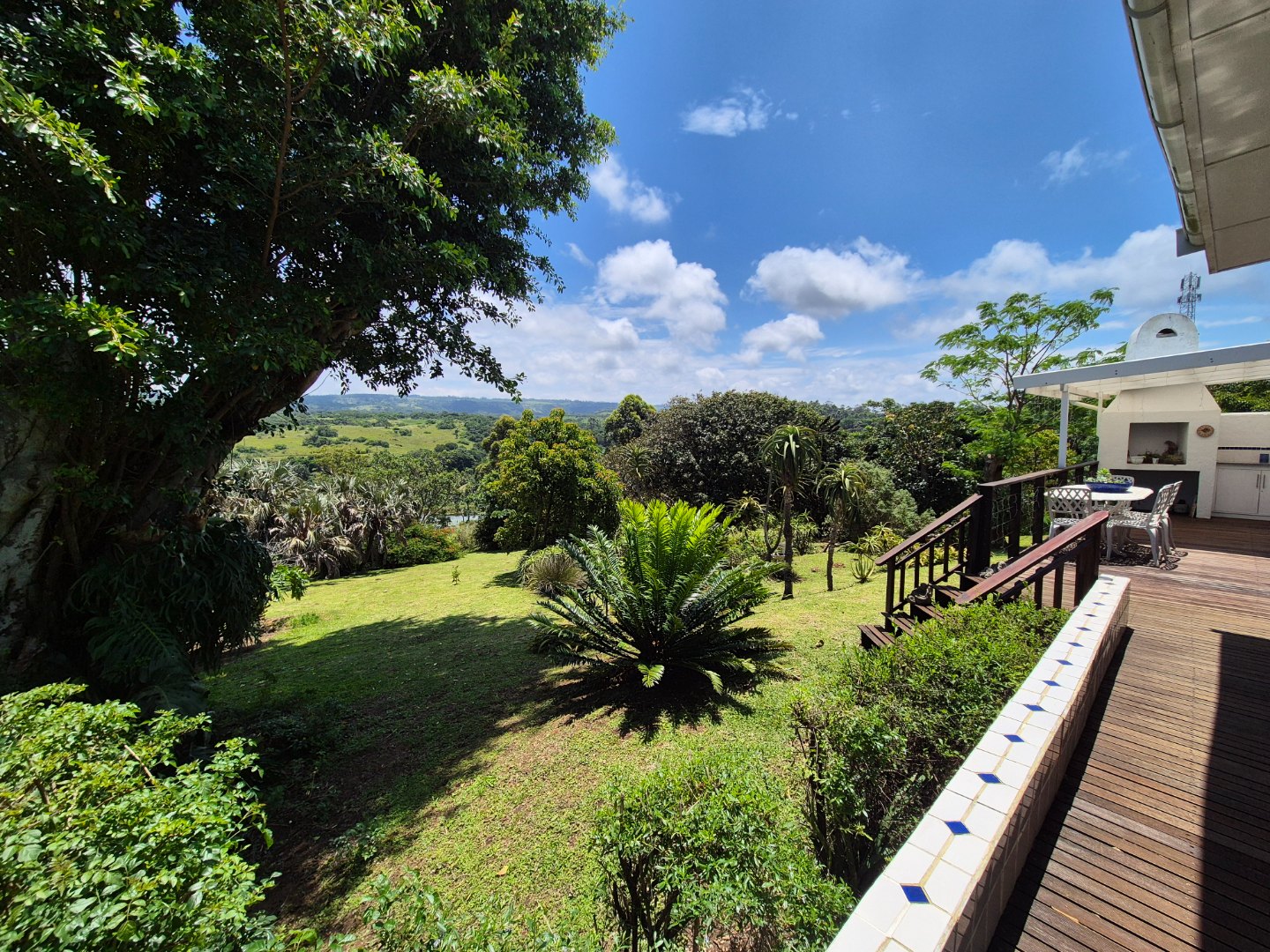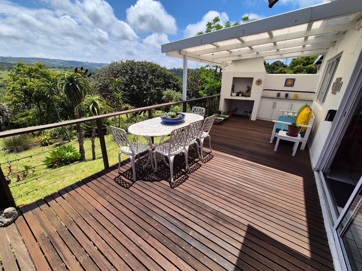 Outdoor living is a key highlight, with a built-in braai, multiple patios and decks perfect for al fresco dining and relaxation. The expansive garden is meticulously maintained and planted with mature avo, litchi and mango trees, while scenic valley views, glimpses of a neighbouring dam and spectacular sunsets enhance the lifestyle appeal.