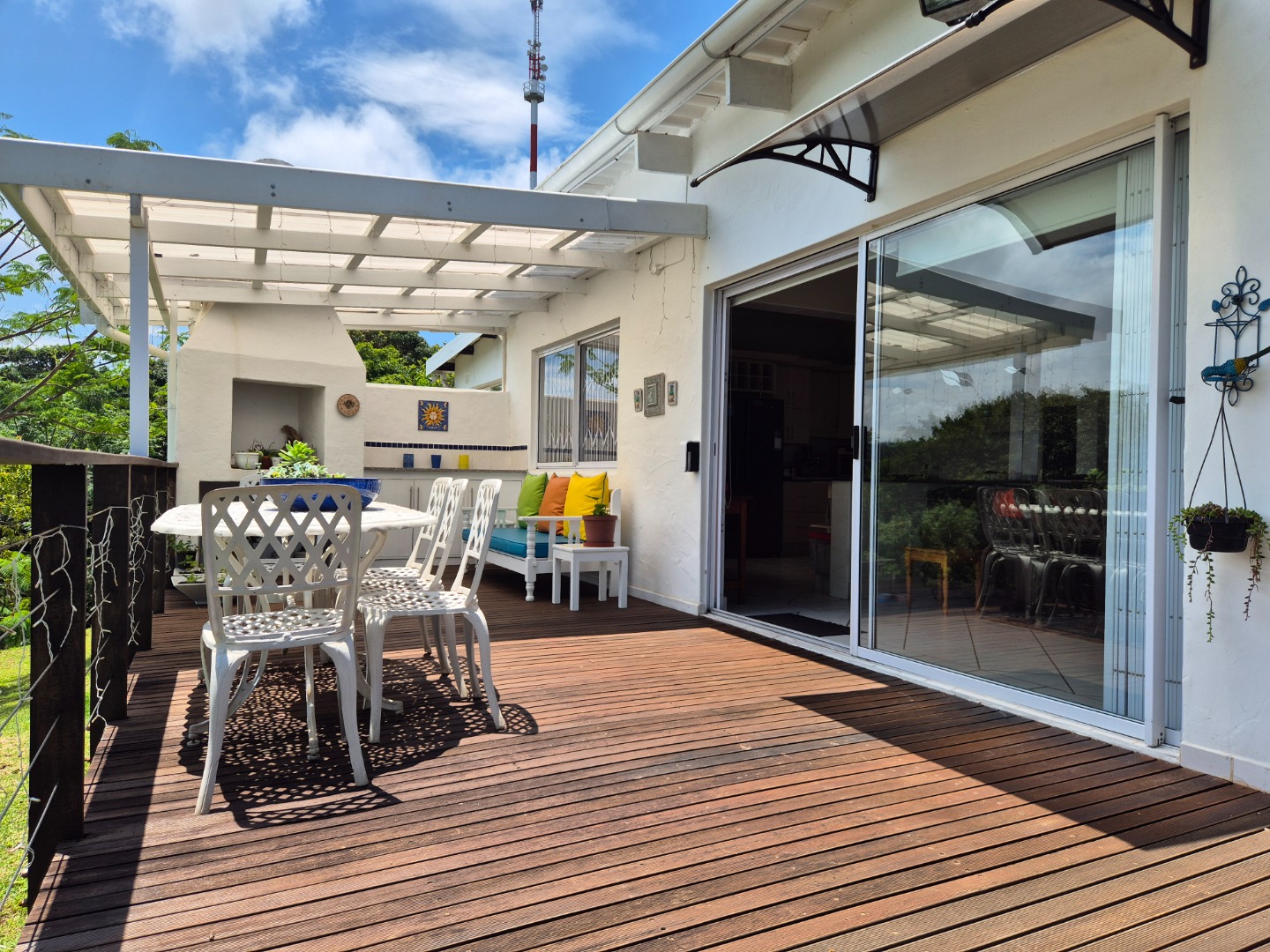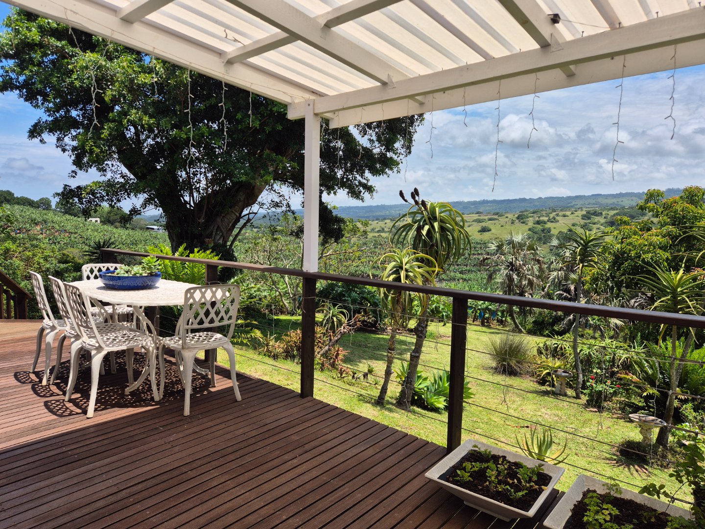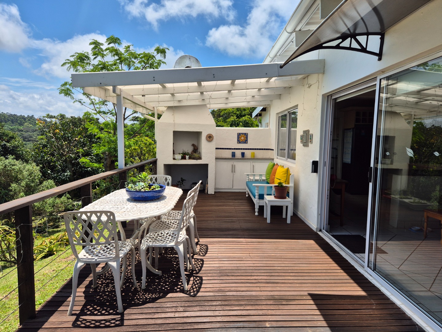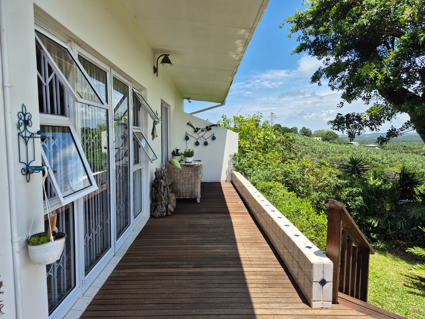 Outdoor living is a key highlight, with a built-in braai, multiple patios and decks perfect for al fresco dining and relaxation. The expansive garden is meticulously maintained and planted with mature avo, litchi and mango trees, while scenic valley views, glimpses of a neighbouring dam and spectacular sunsets enhance the lifestyle appeal.