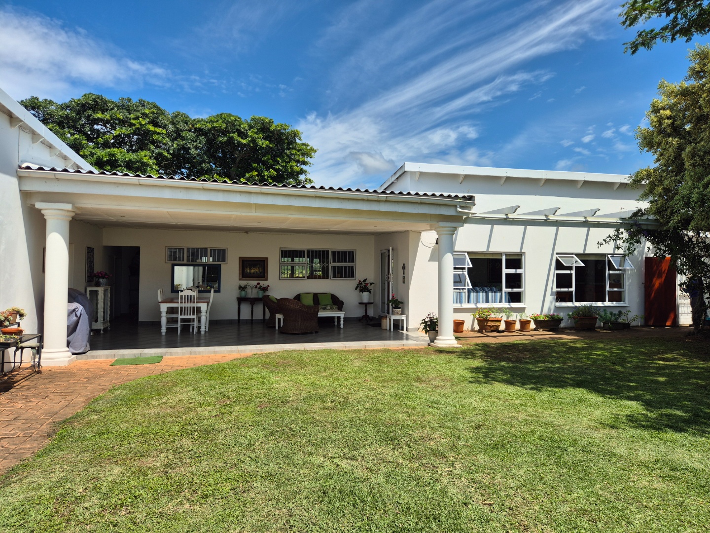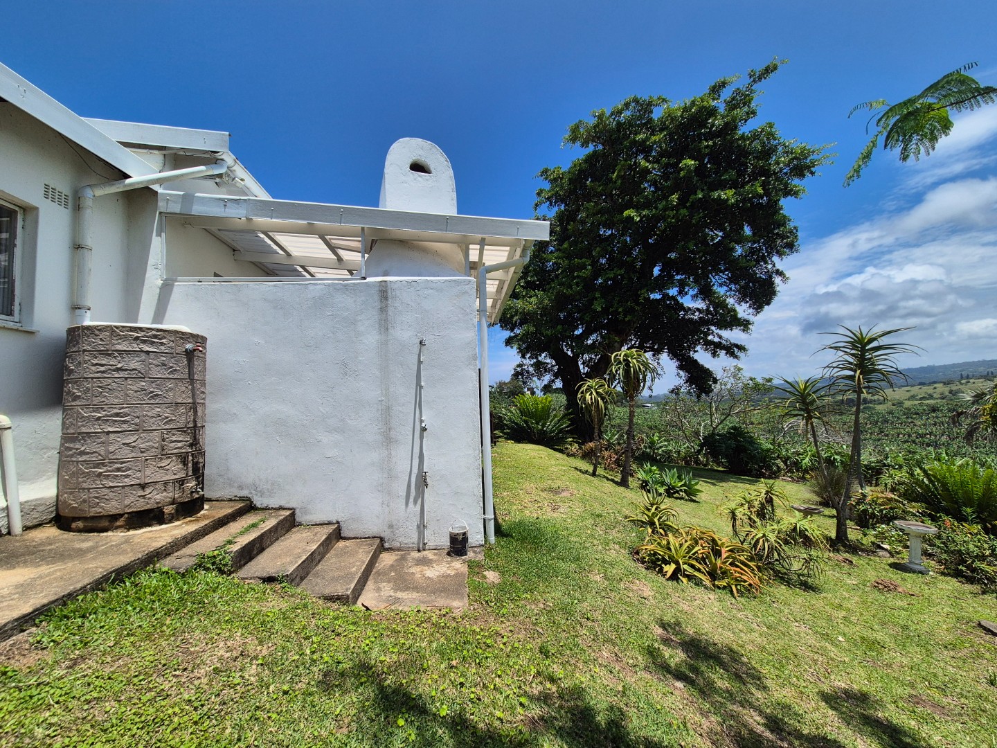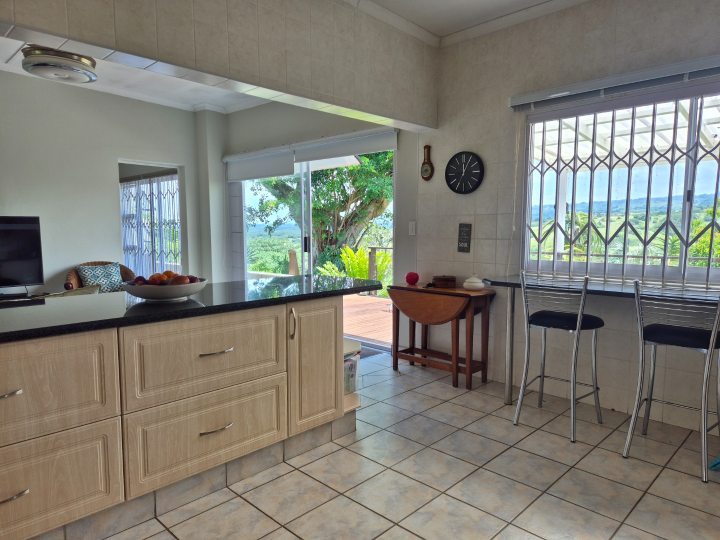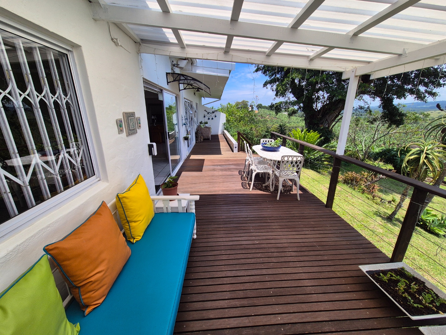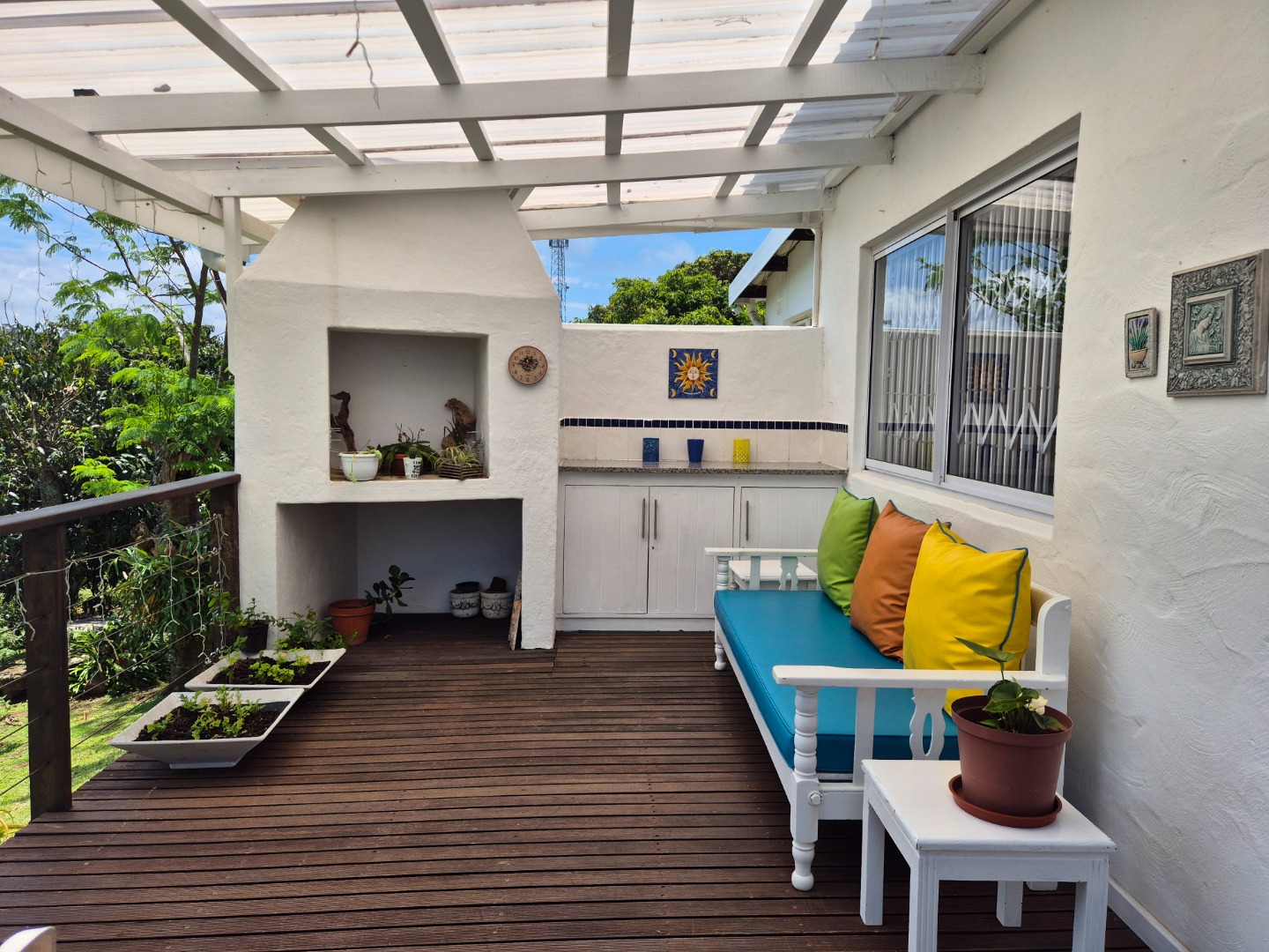 Outdoor living is a key highlight, with a built-in braai, multiple patios and decks perfect for al fresco dining and relaxation. The expansive garden is meticulously maintained and planted with mature avo, litchi and mango trees, while scenic valley views, glimpses of a neighbouring dam and spectacular sunsets enhance the lifestyle appeal.