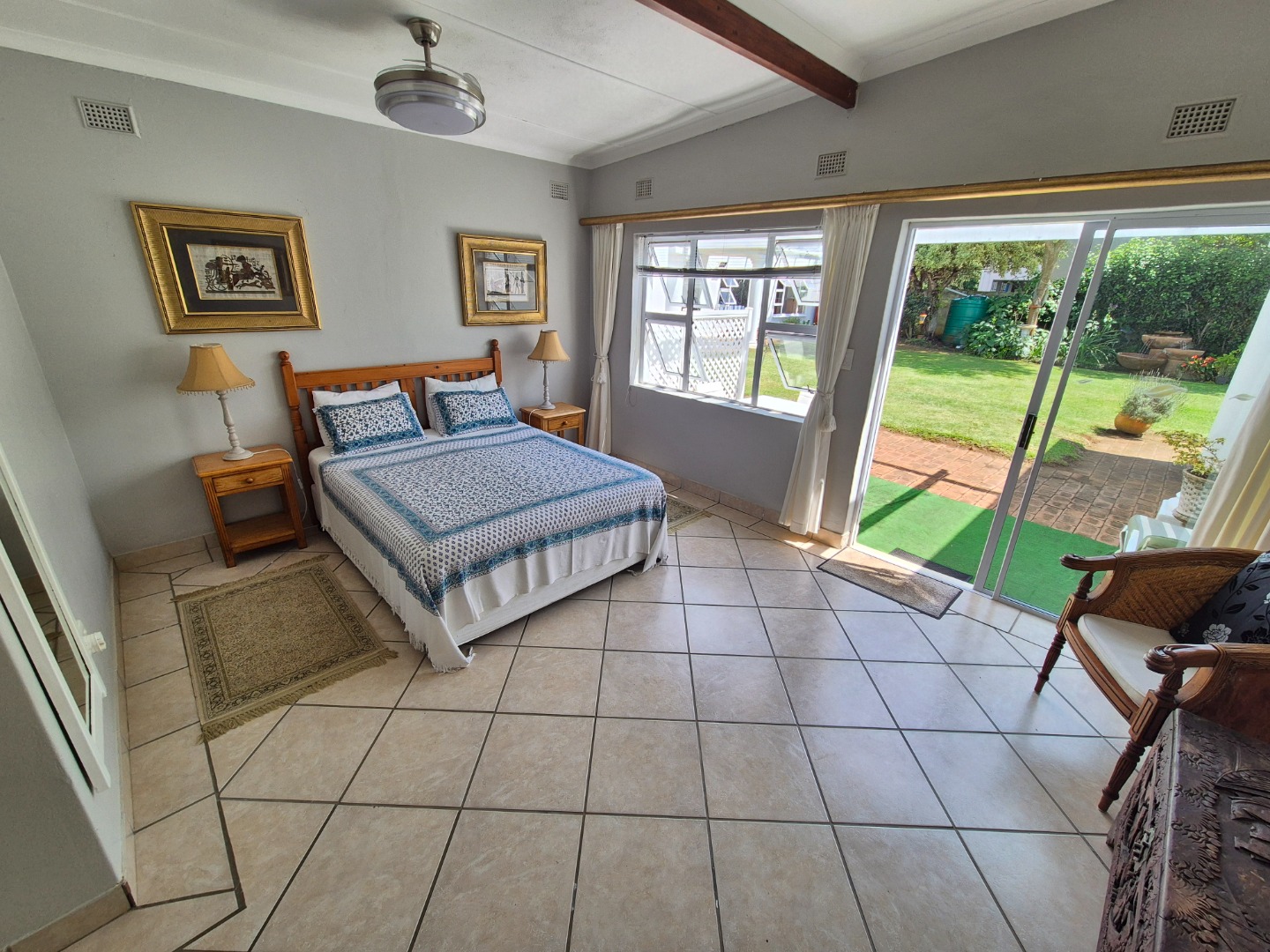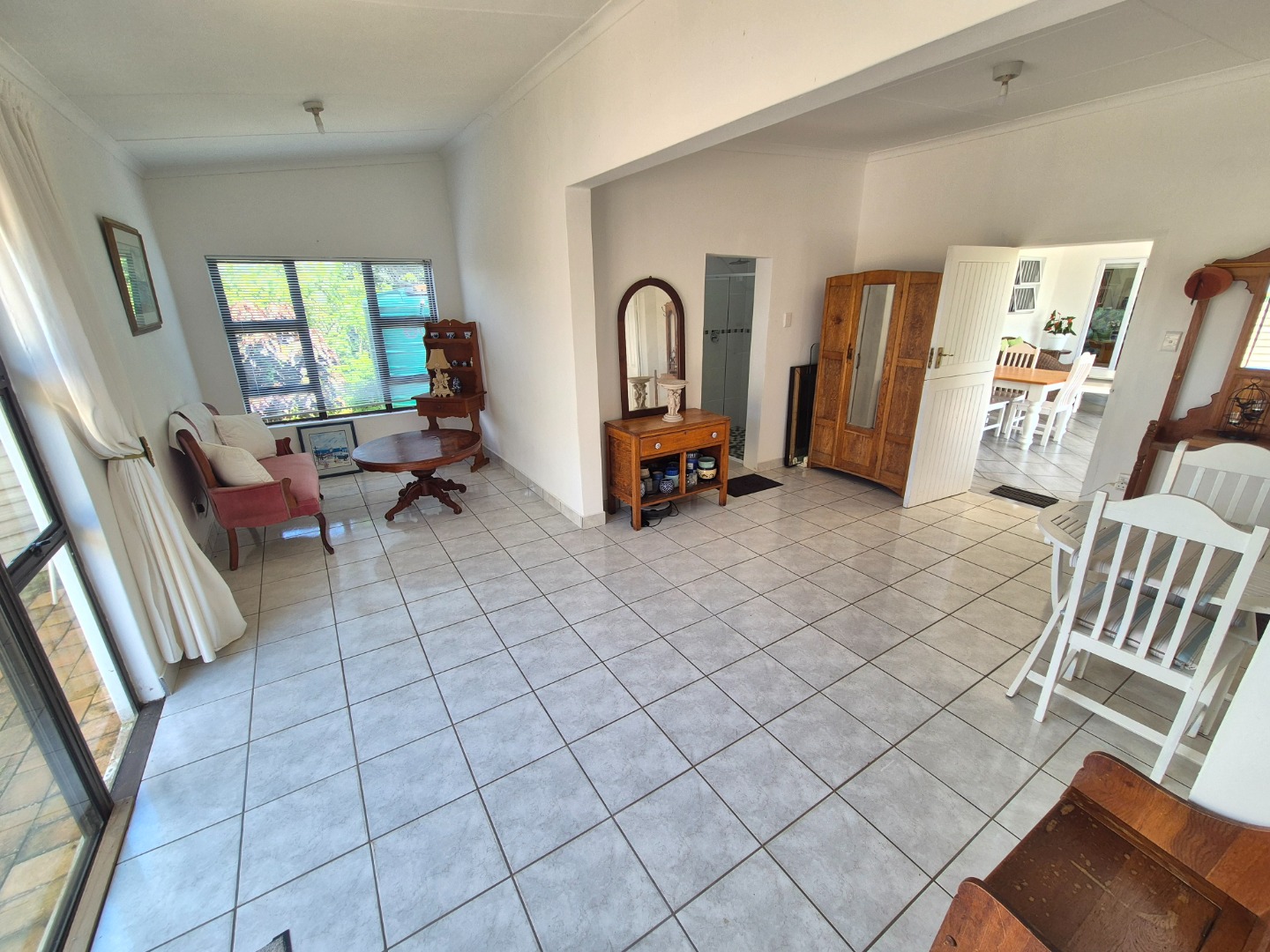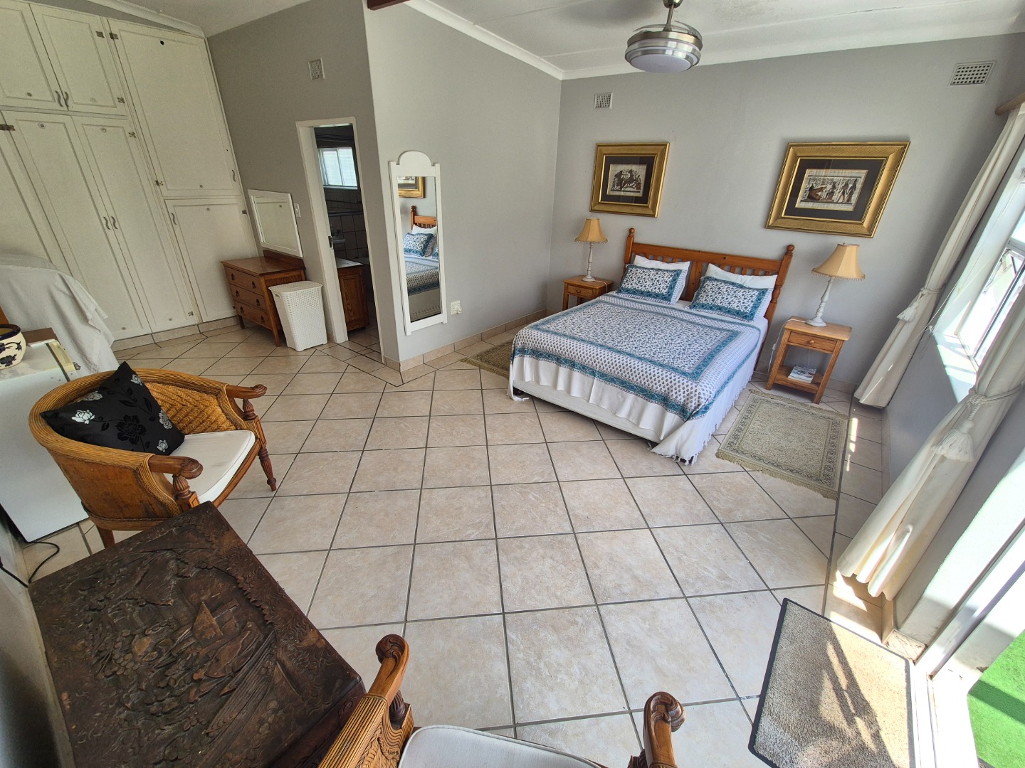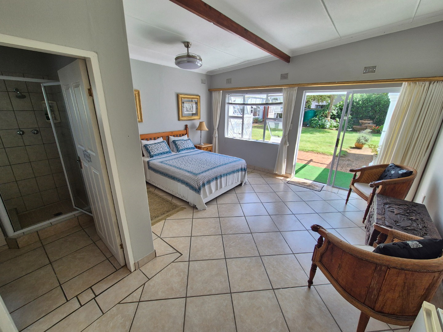 Adjacent to the garage is a spacious guest suite featuring floor-to-ceiling built-in cupboards, a large bathroom with bath and shower, space for a queen-sized bed and lounge area, plus access to an outdoor patio. A separate guest toilet is conveniently positioned nearby. An expansive tiled veranda connects this wing to the one-bedroom flatlet, storeroom and main residence.