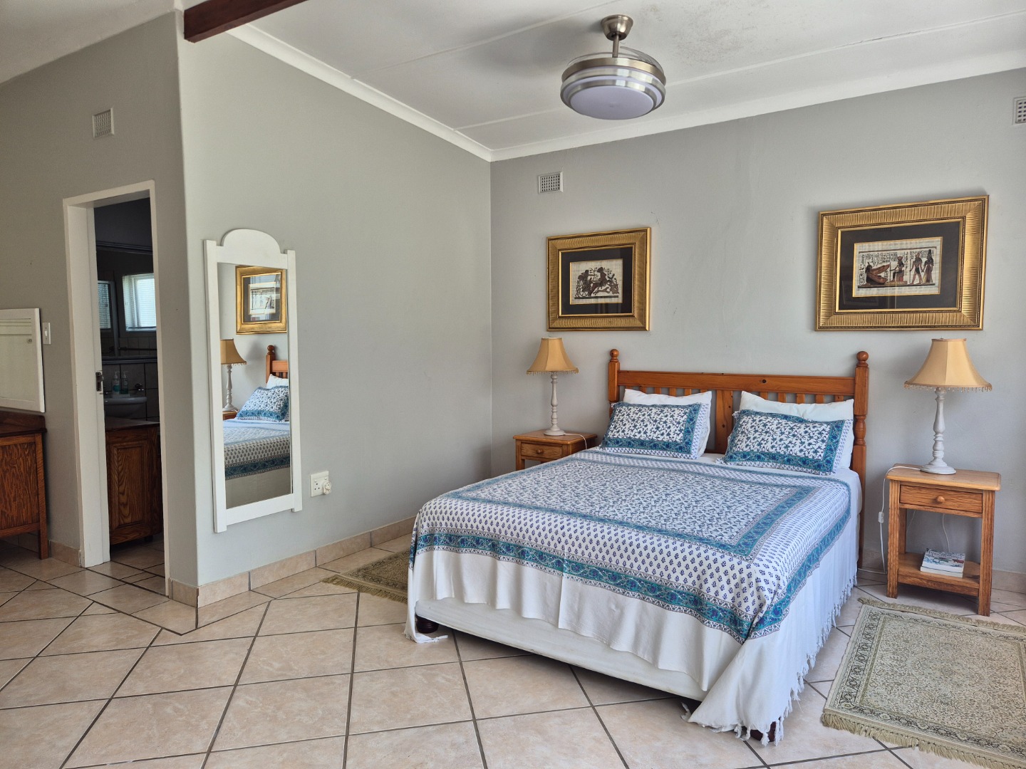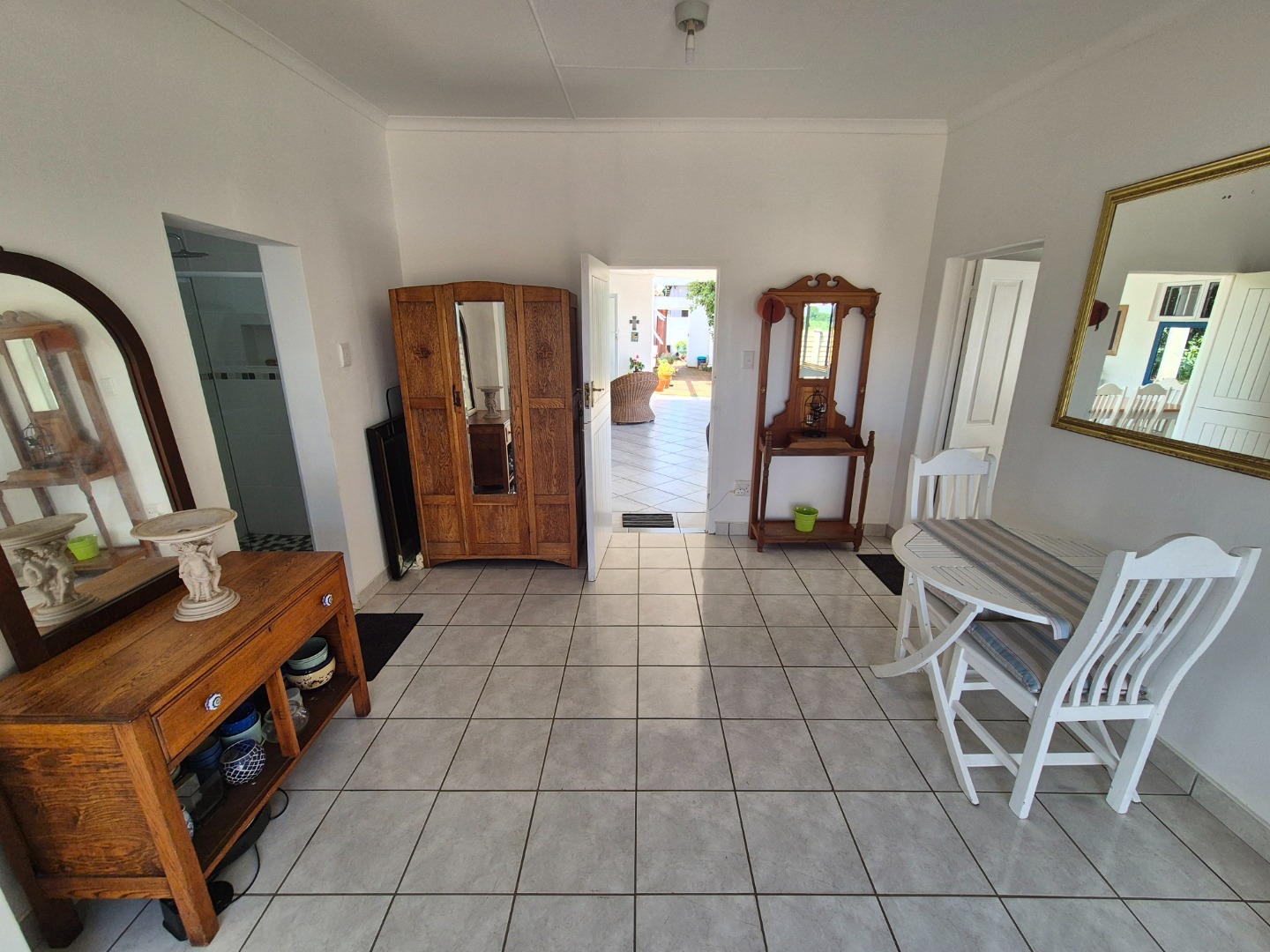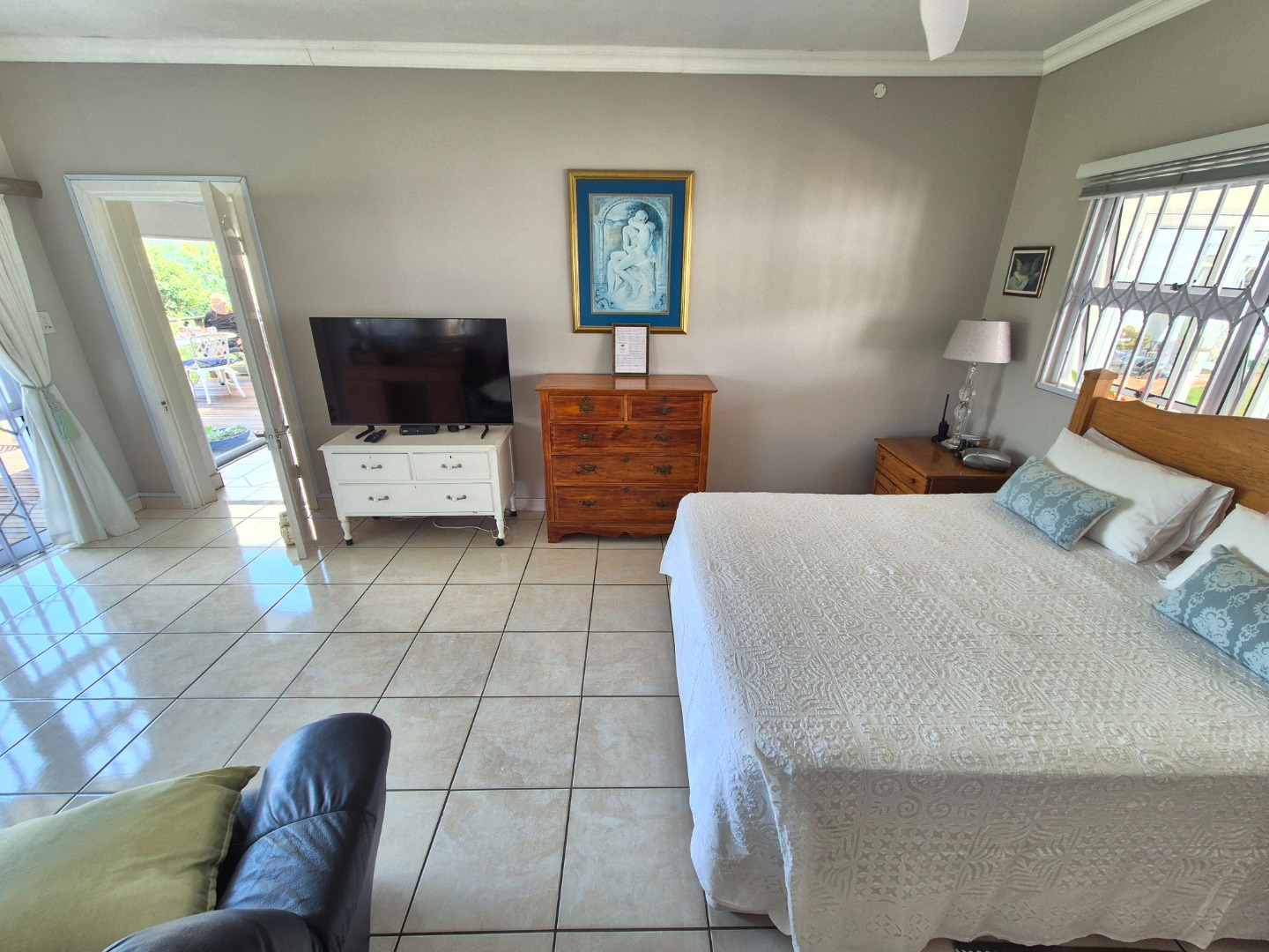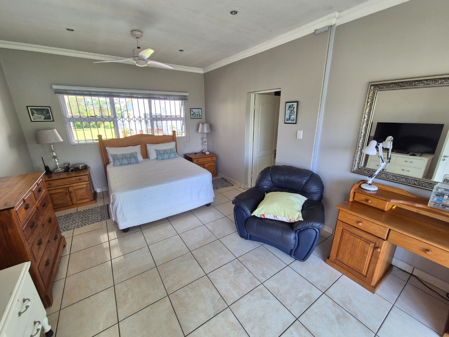 Adjacent to the garage is a spacious guest suite featuring floor-to-ceiling built-in cupboards, a large bathroom with bath and shower, space for a queen-sized bed and lounge area, plus access to an outdoor patio. A separate guest toilet is conveniently positioned nearby. An expansive tiled veranda connects this wing to the one-bedroom flatlet, storeroom and main residence.