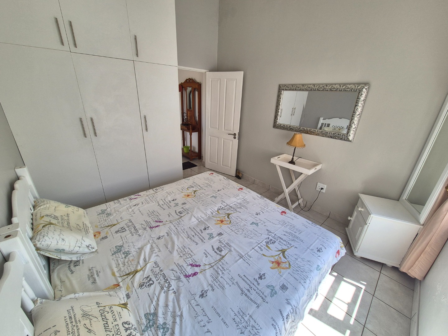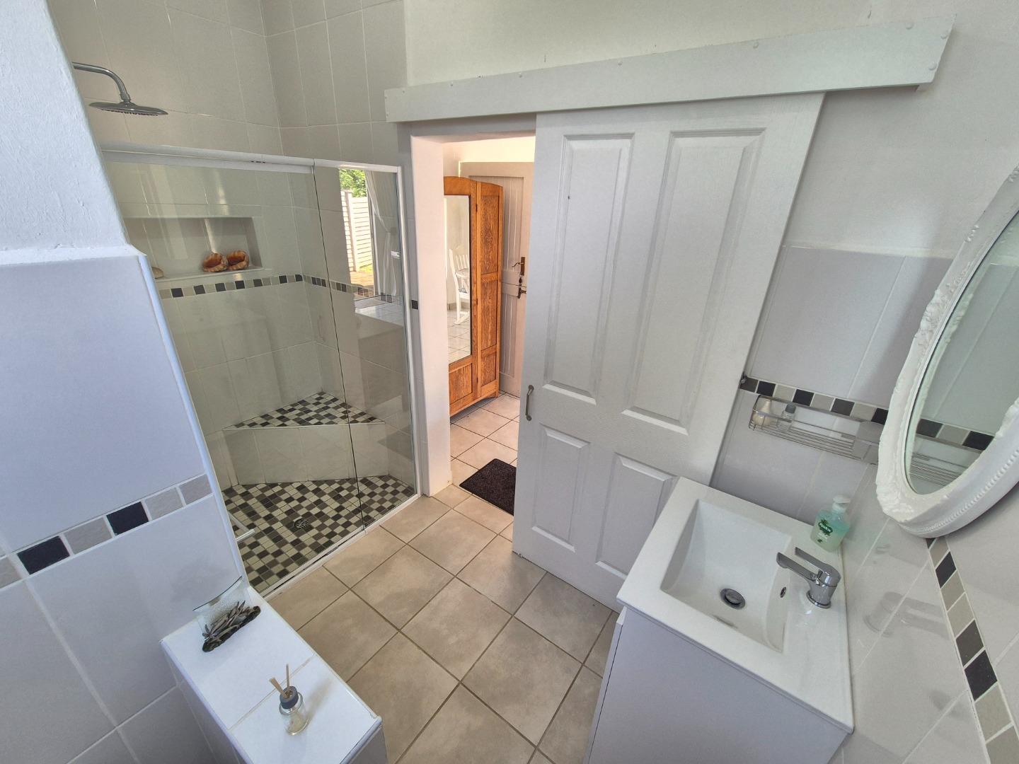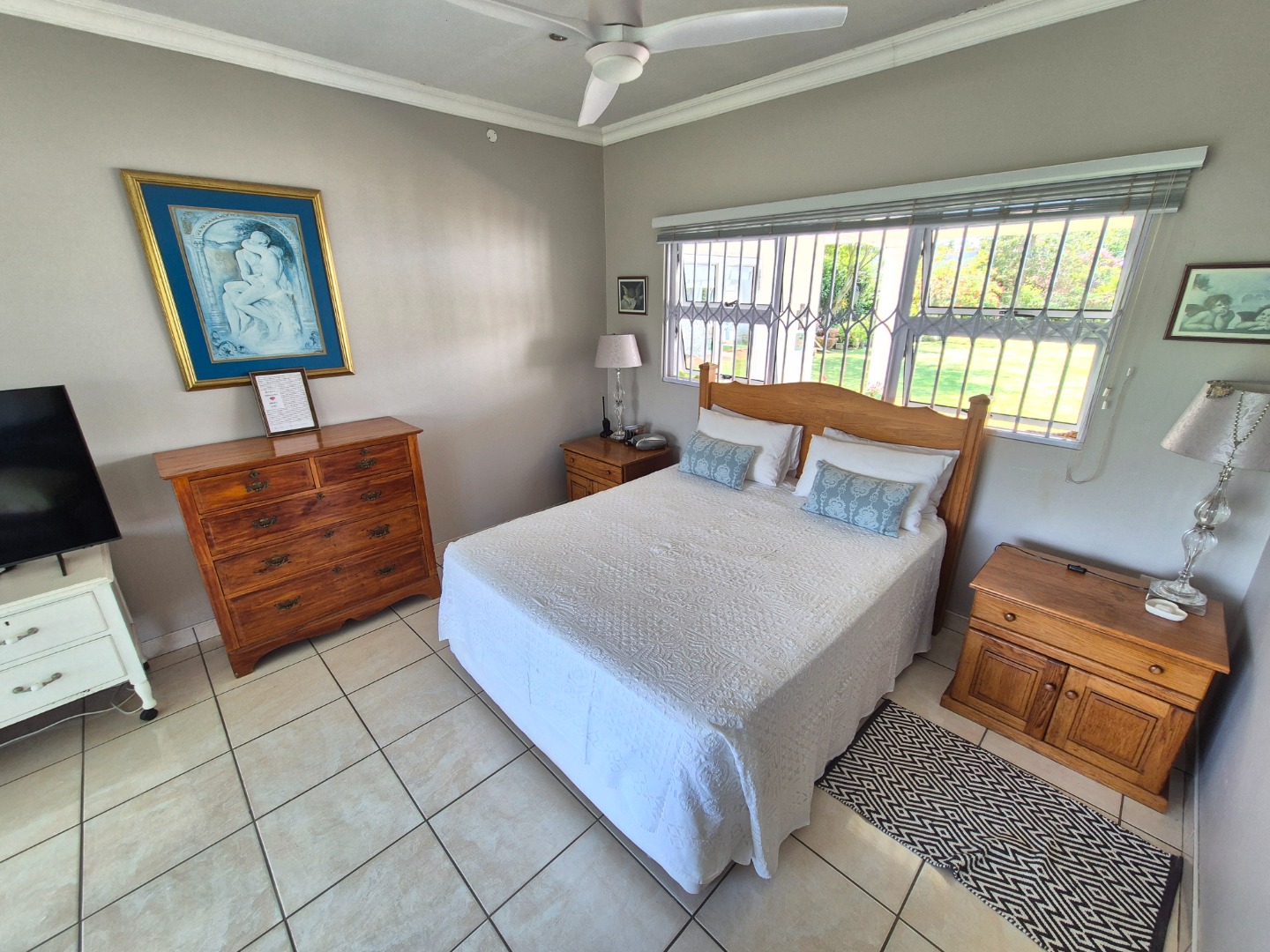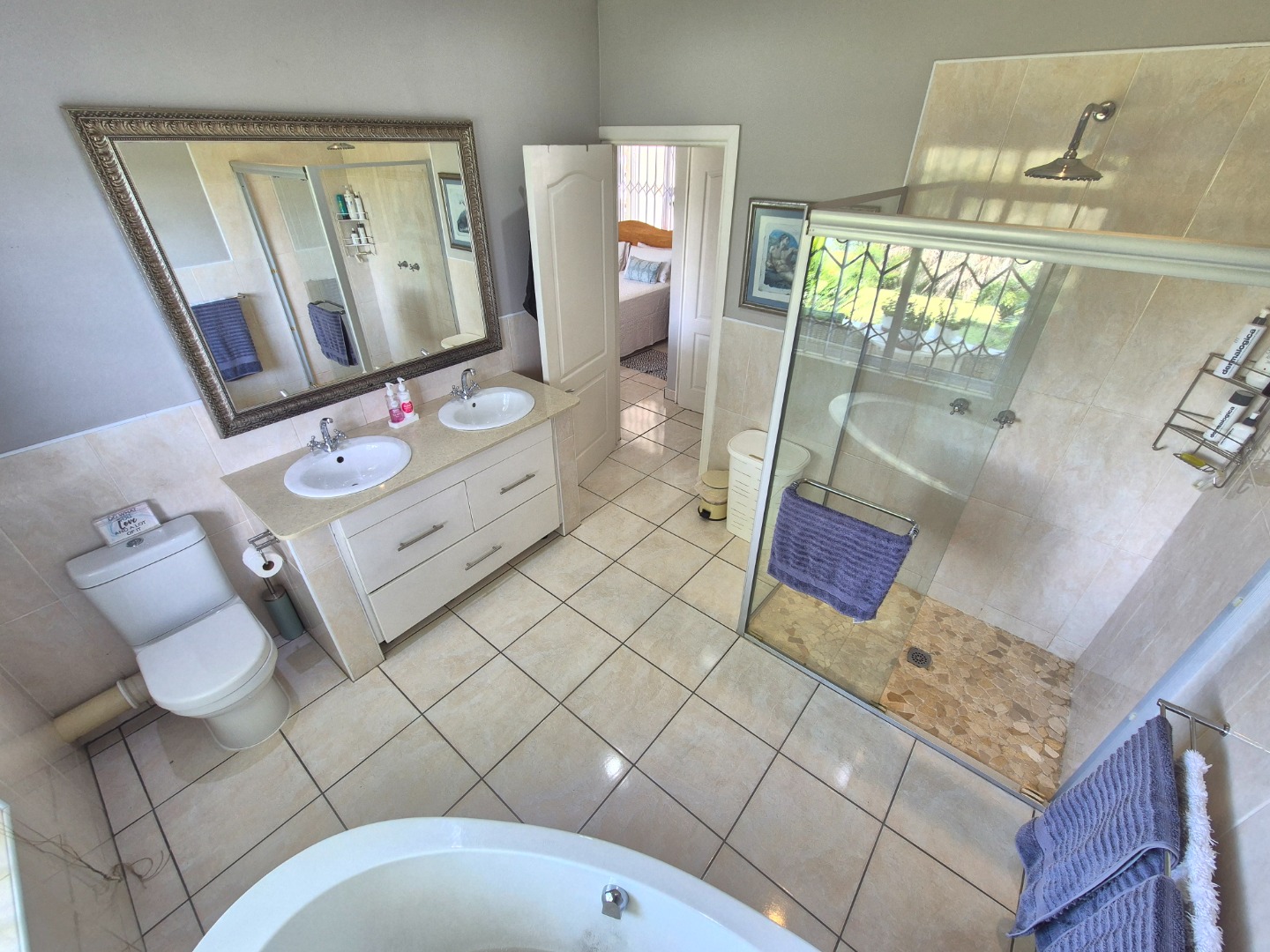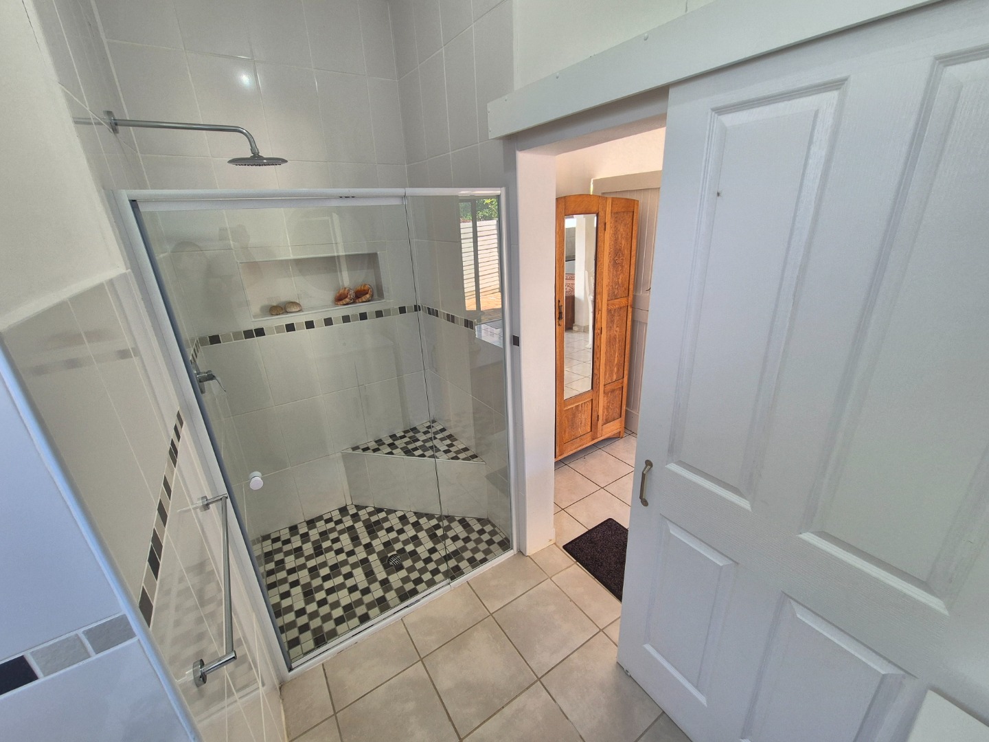 Adjacent to the garage is a spacious guest suite featuring floor-to-ceiling built-in cupboards, a large bathroom with bath and shower, space for a queen-sized bed and lounge area, plus access to an outdoor patio. A separate guest toilet is conveniently positioned nearby. An expansive tiled veranda connects this wing to the one-bedroom flatlet, storeroom and main residence.