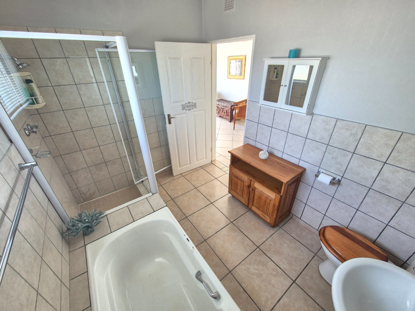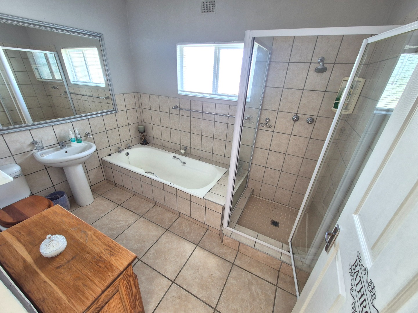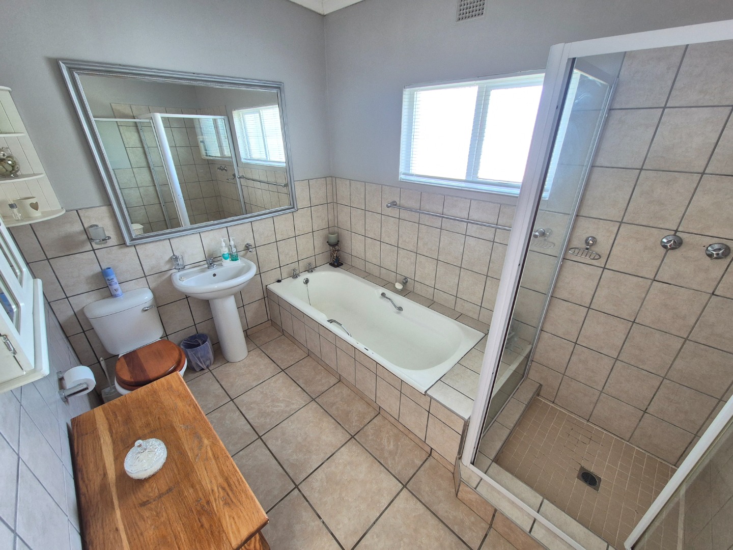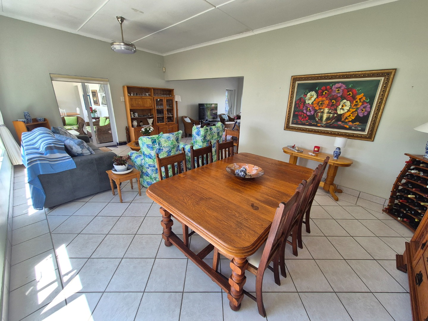 Adjacent to the garage is a spacious guest suite featuring floor-to-ceiling built-in cupboards, a large bathroom with bath and shower, space for a queen-sized bed and lounge area, plus access to an outdoor patio. A separate guest toilet is conveniently positioned nearby. An expansive tiled veranda connects this wing to the one-bedroom flatlet, storeroom and main residence.