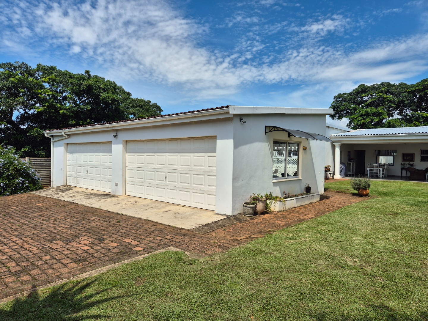 Accessed via a remote-controlled gate, a short driveway leads to a double garage with electric doors, comfortably accommodating up to four vehicles. The buildings are arranged in an attractive L-shaped configuration around a beautifully maintained garden, seamlessly linking the main residence, guest wing, flatlet and garage.