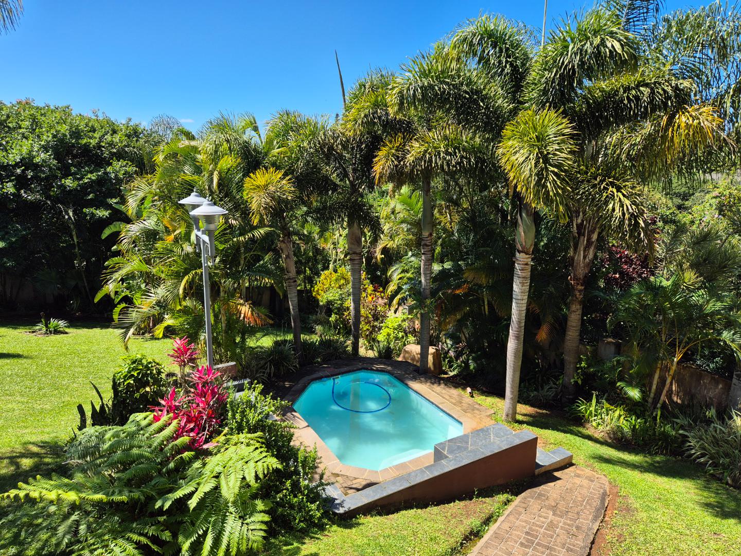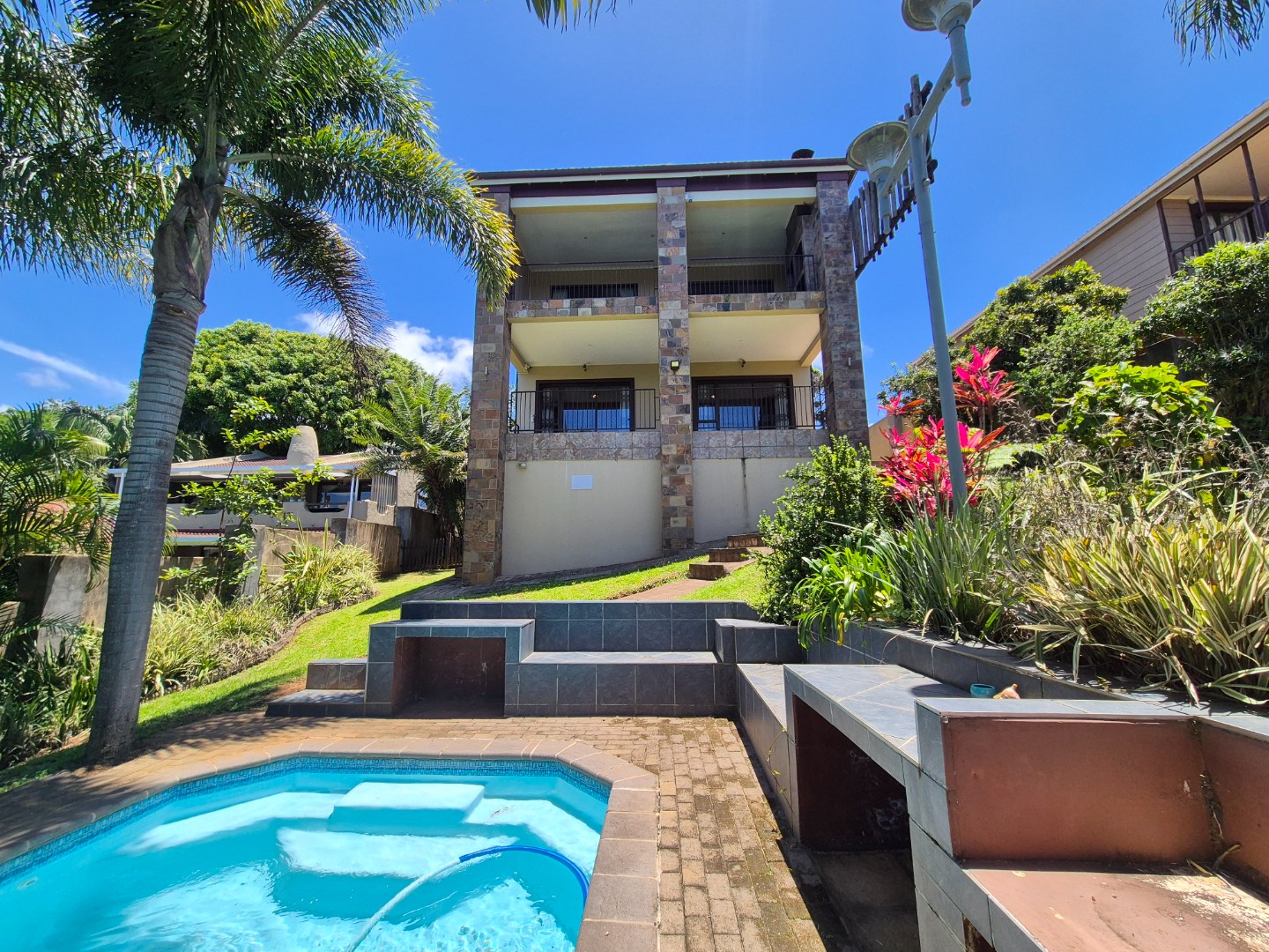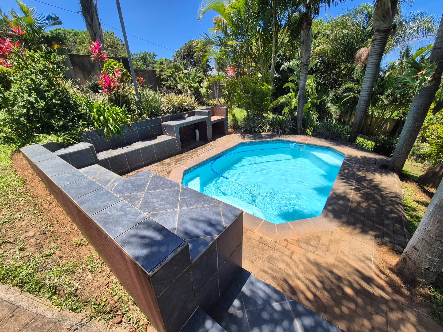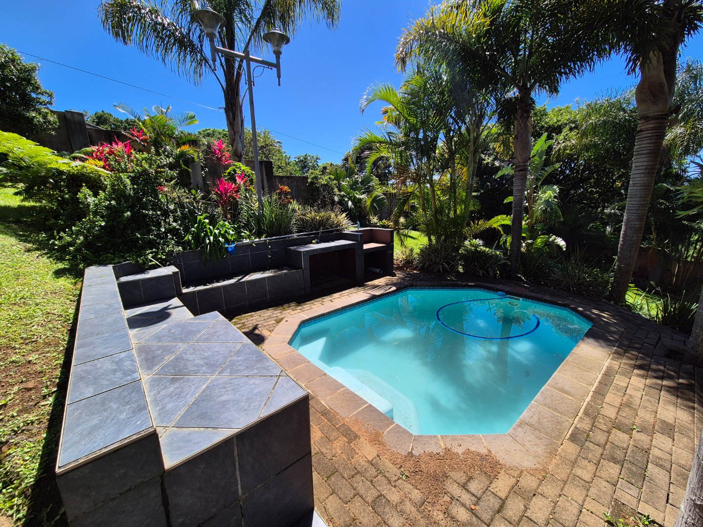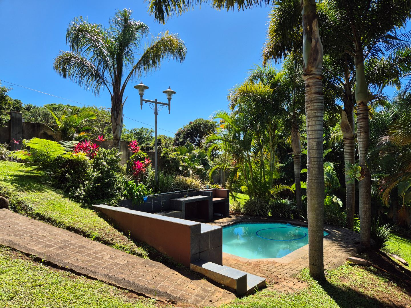 Step outside to embrace the quintessential South African lifestyle. The property boasts a private swimming pool, perfect for cooling off on warm days, complemented by a built-in braai area and tiled seating for effortless outdoor entertaining. Lush tropical landscaping, mature palm trees, and a well-maintained garden create a serene and private oasis. Multiple balconies provide elevated positions to enjoy the scenic and distant sea views, enhancing the home's appeal.