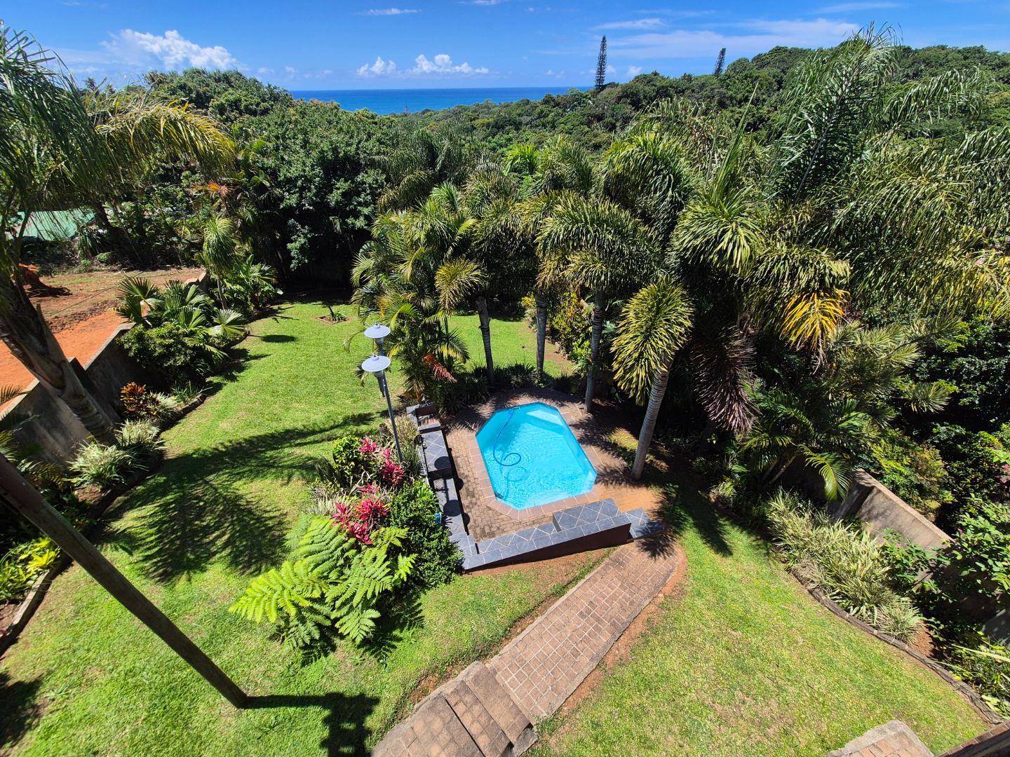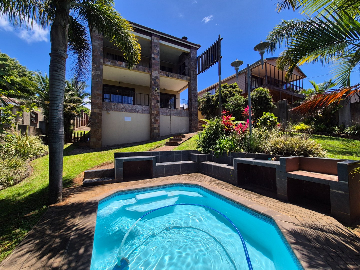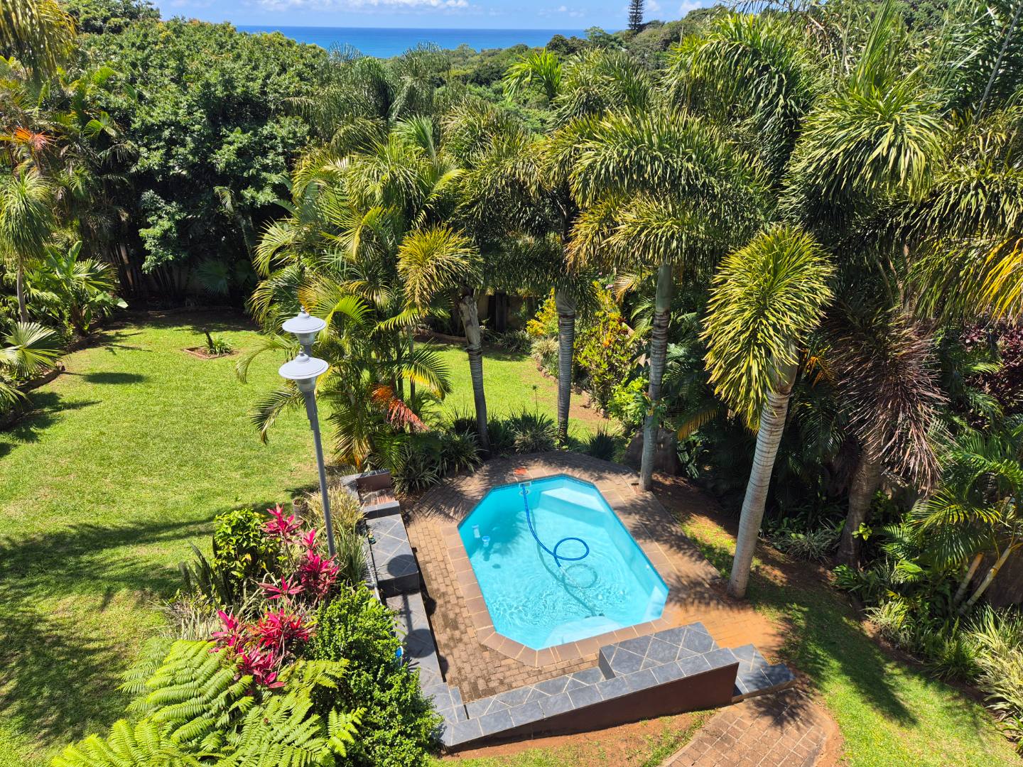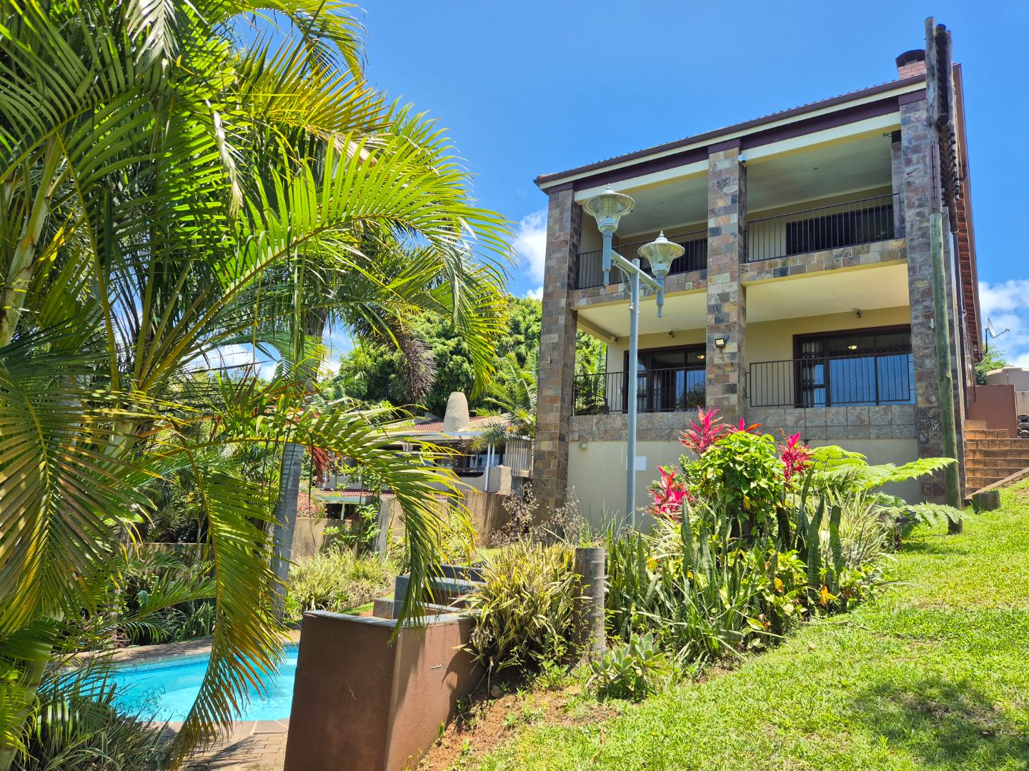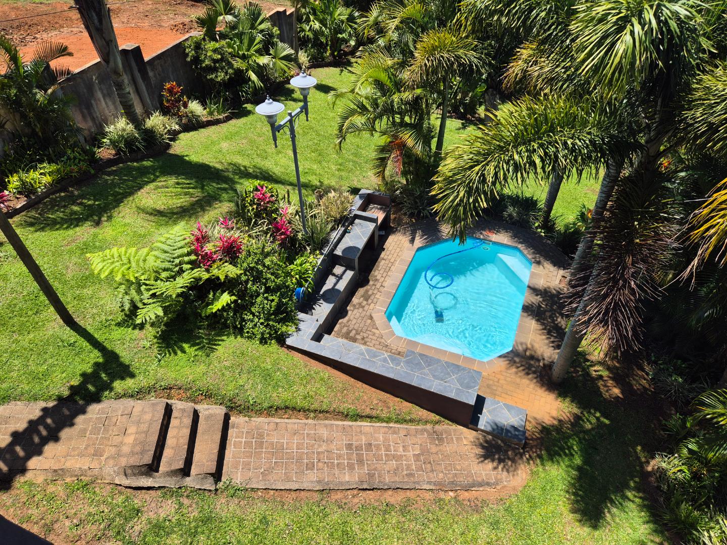 Step outside to embrace the quintessential South African lifestyle. The property boasts a private swimming pool, perfect for cooling off on warm days, complemented by a built-in braai area and tiled seating for effortless outdoor entertaining. Lush tropical landscaping, mature palm trees, and a well-maintained garden create a serene and private oasis. Multiple balconies provide elevated positions to enjoy the scenic and distant sea views, enhancing the home's appeal.