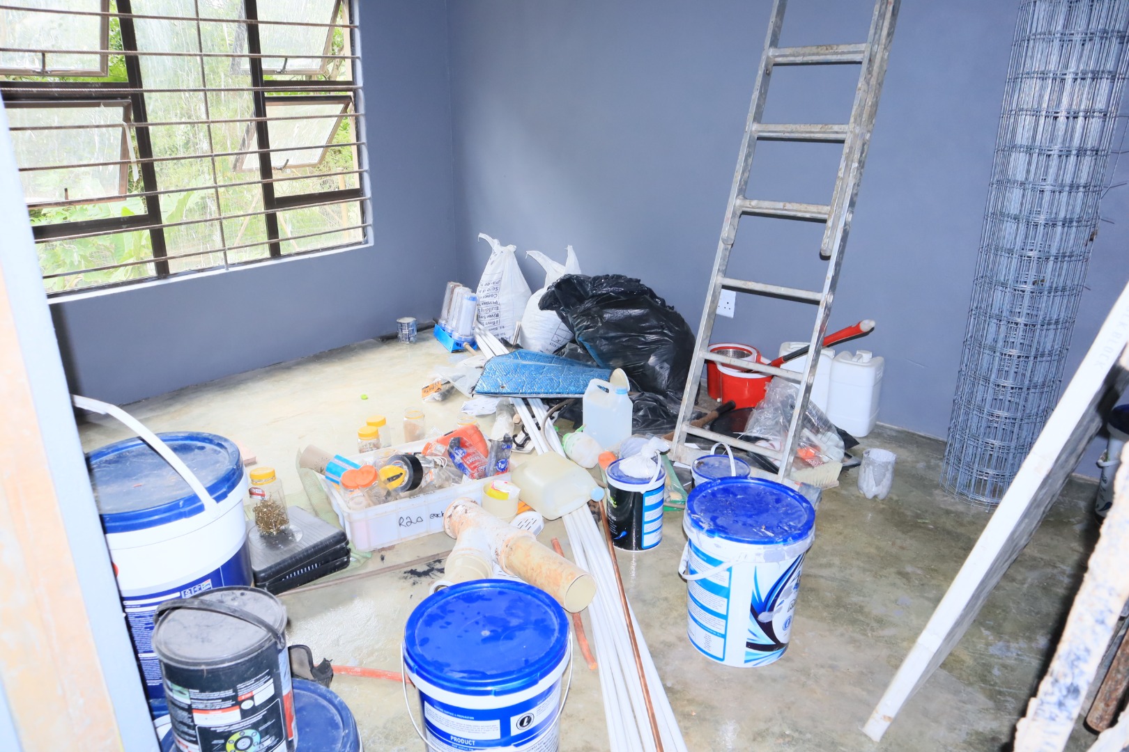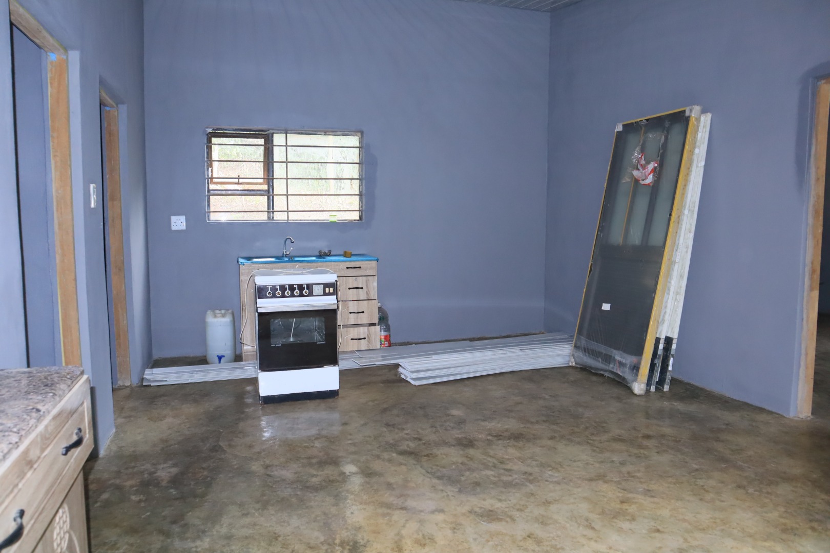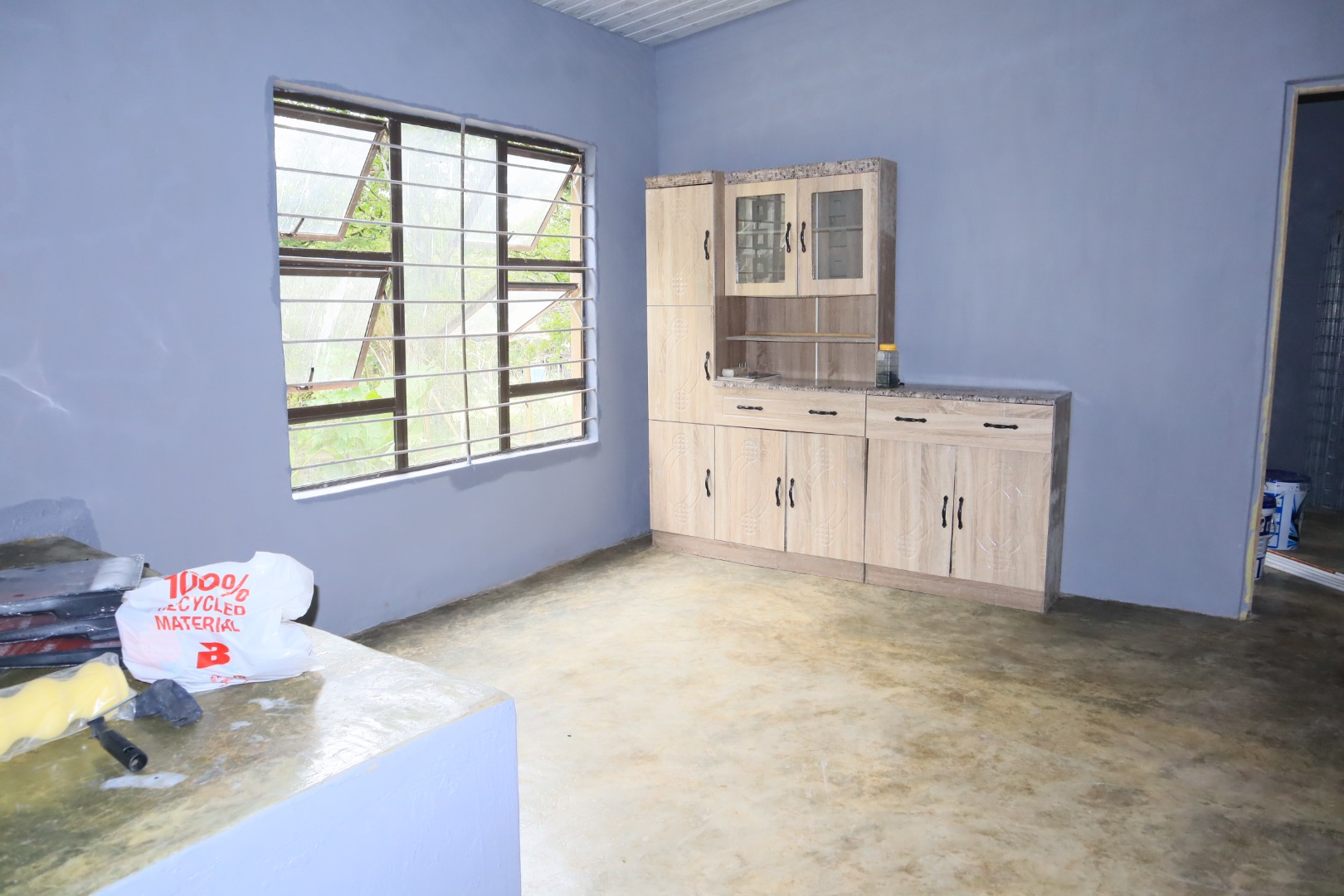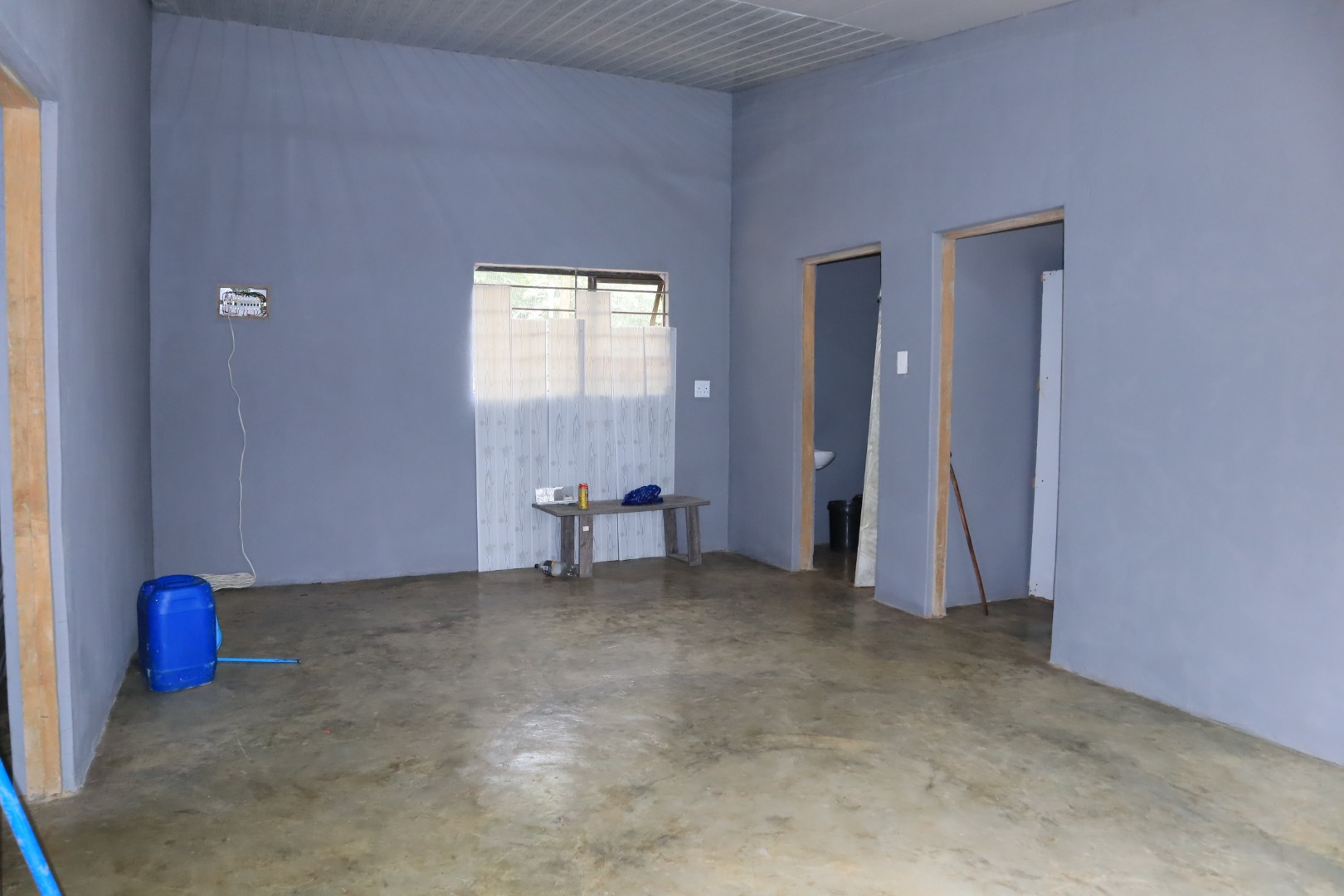 The existing structure features a 2-bedroom, 2-bathroom residence that serves as a blank canvas for renovation. With freshly painted walls, the interior provides a clean slate, ready for your personal design touches. The property's layout features a cosy lounge and a kitchen equipped with stylish, light-wood freestanding cabinets, providing ample storage solutions. The unfinished concrete floors and visible construction elements reflect the ongoing preparations, inviting the new owner to customise every detail—from finishes to fittings—creating your own living space. For added peace of mind, security bars are fitted on the windows.