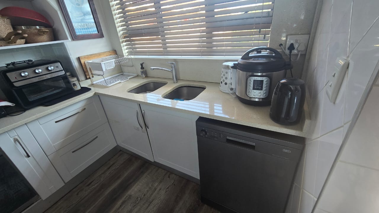The sleek, fully tiled interior features a stylish kitchen with granite countertops, a central island and cozy eating nook, and clever inner cupboard lighting is fabulous. There’s space for all your appliances, and the
