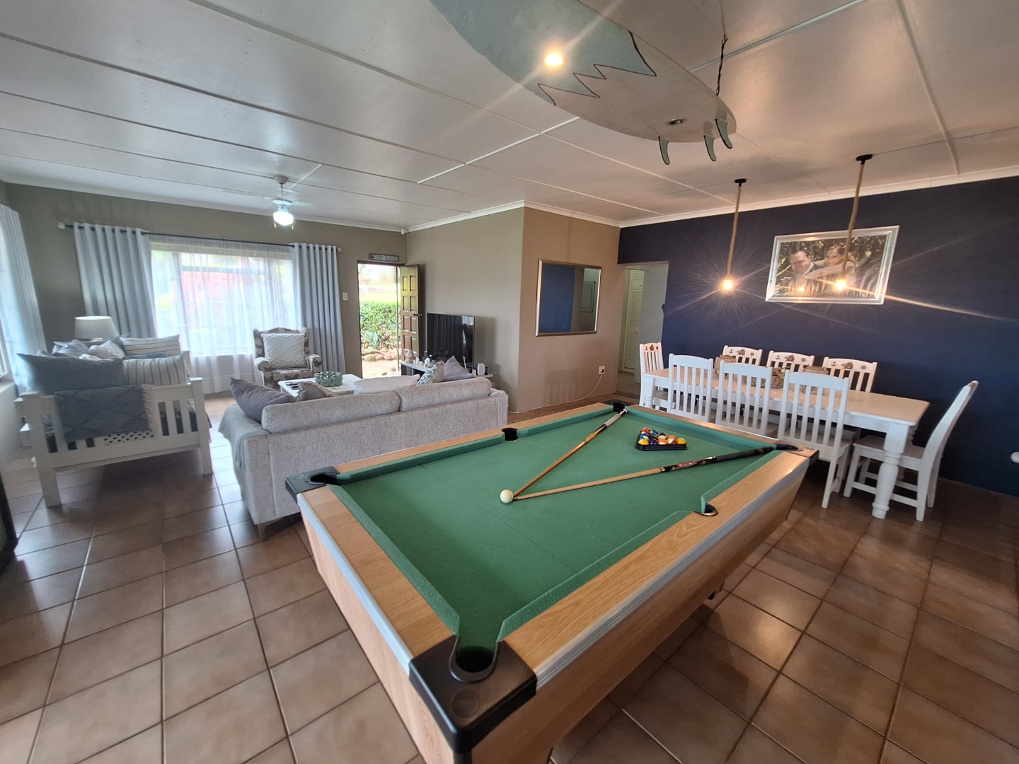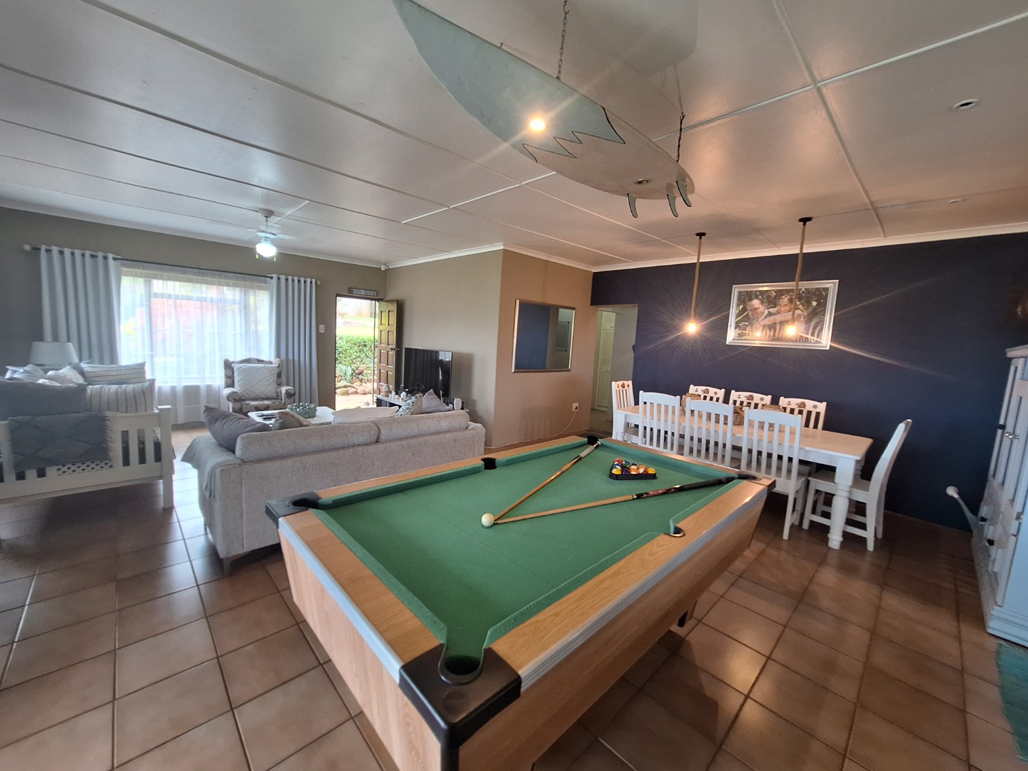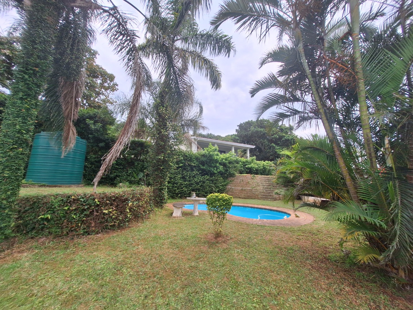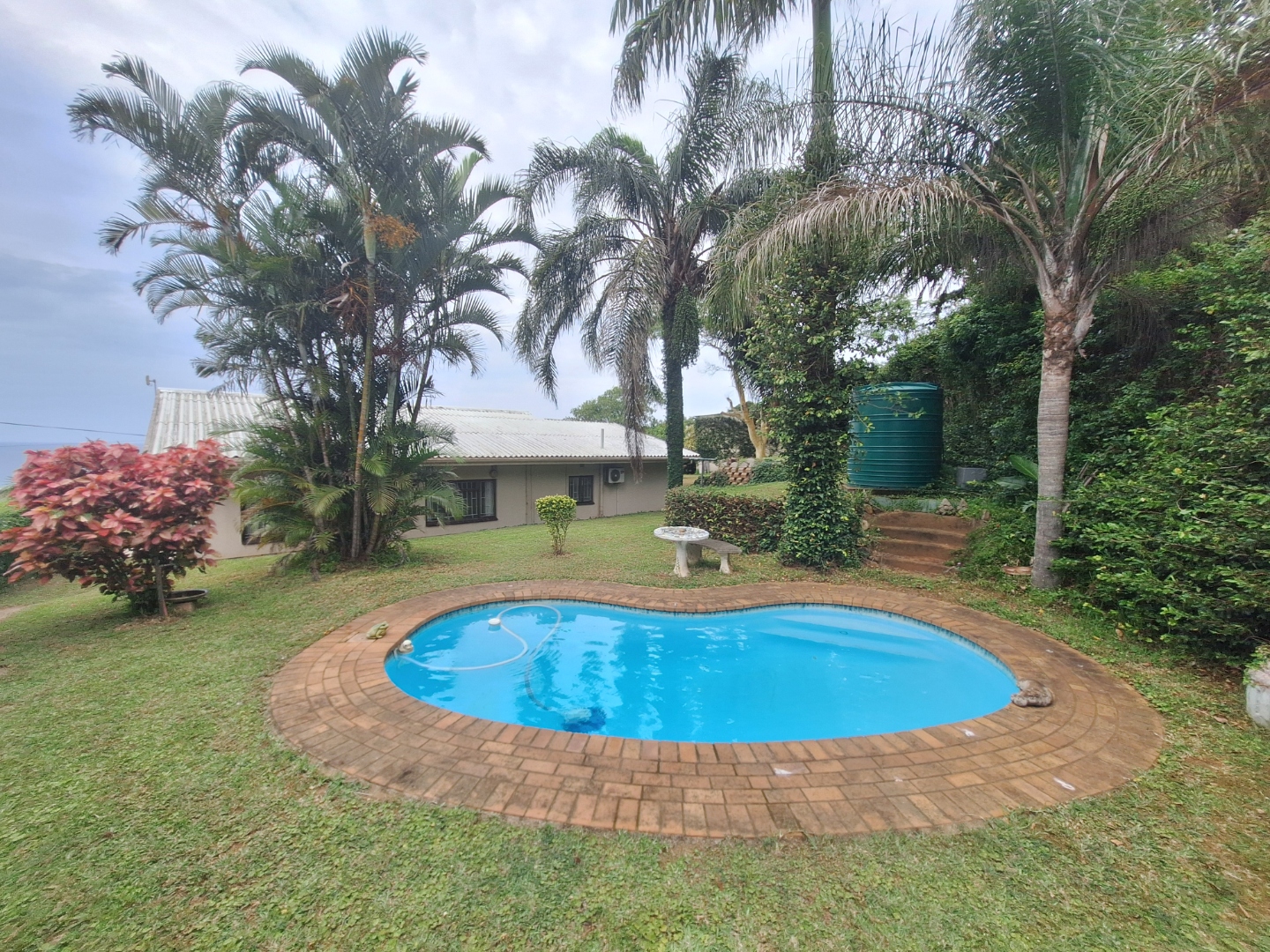 Outside, a sparkling swimming pool is nestled among lush palm trees, creating a tranquil, tropical beach-inspired atmosphere that makes every day feel like a holiday.
