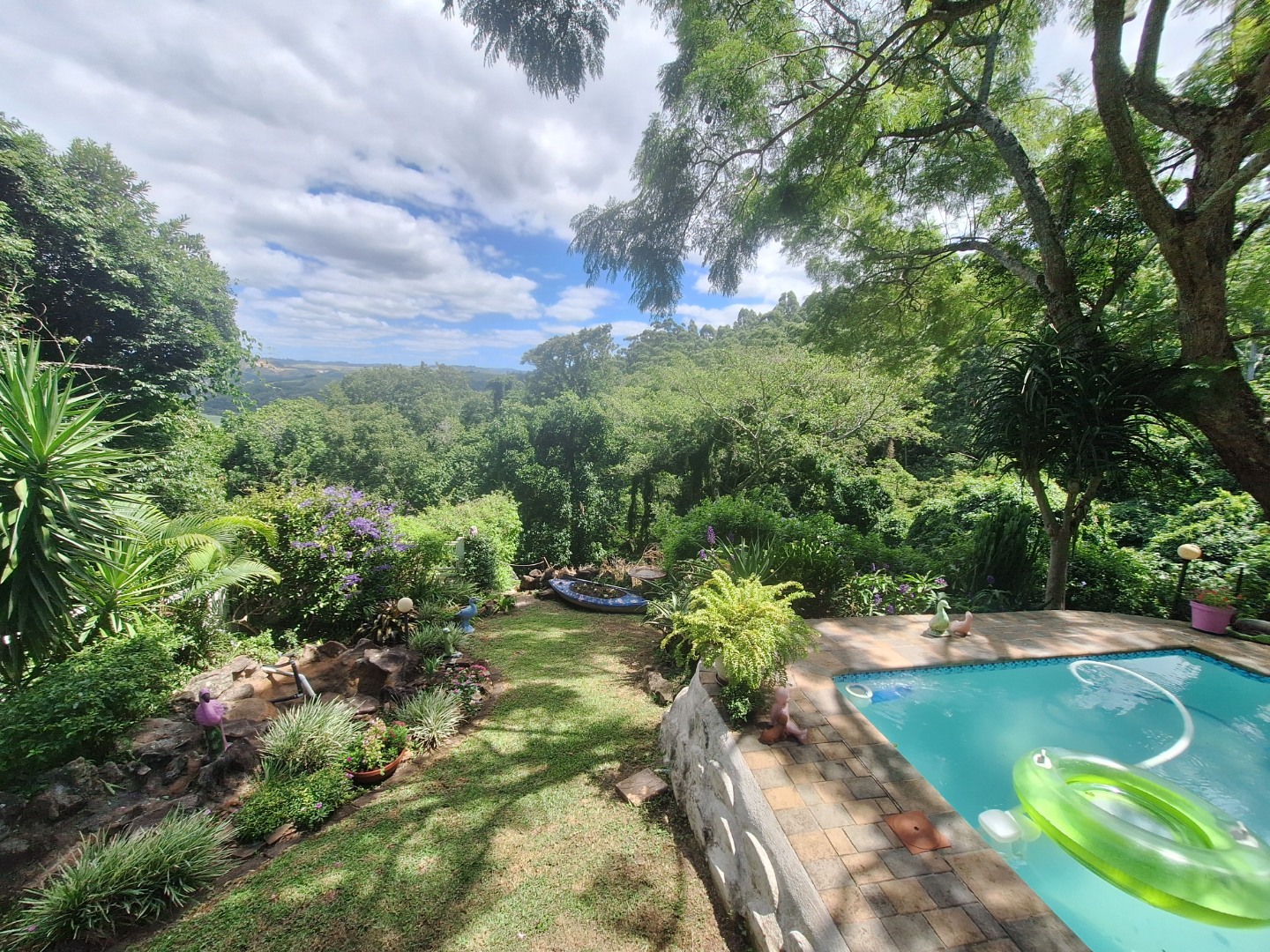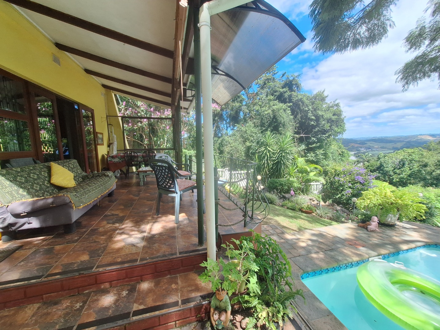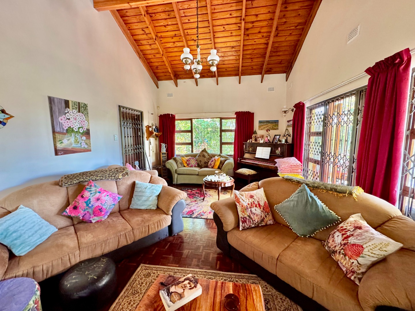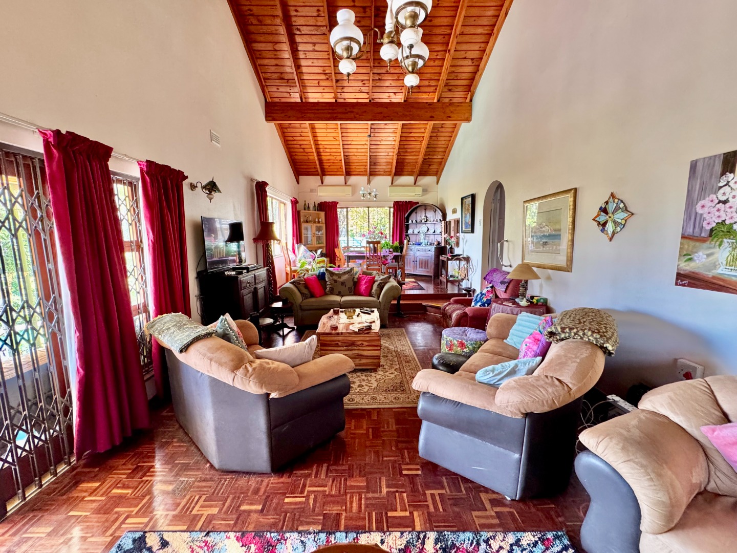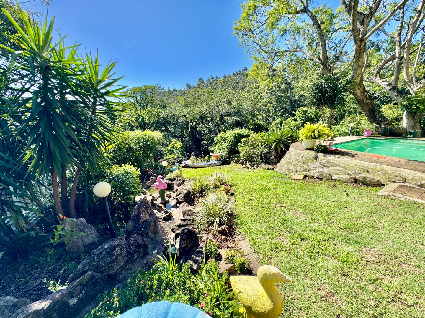 The garden is a nature lover’s dream, filled with natural rock features, mature trees, and shaded corners perfect for relaxation. The cosy lounge opens onto a serene patio overlooking the swimming pool, the valley, and the river below, creating the ideal setting for quiet mornings or sunset gatherings. With air-conditioning and a spacious farm-style side patio, this home offers comfort, charm, and tranquillity. Don’t miss out on this one-of-a-kind property.