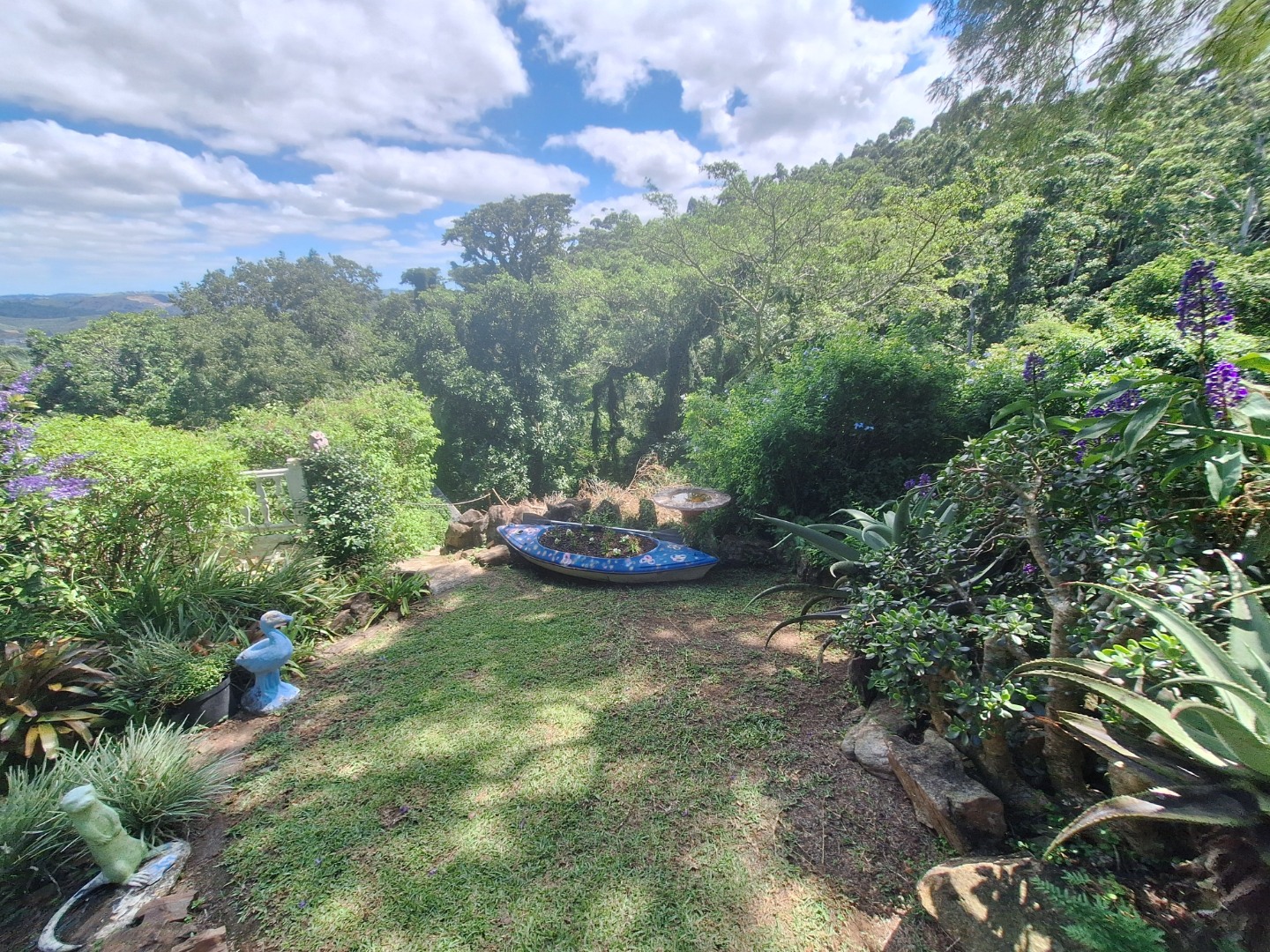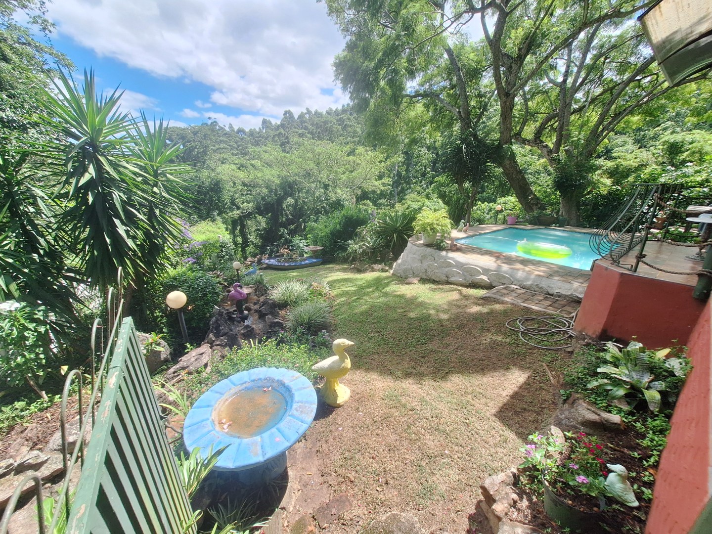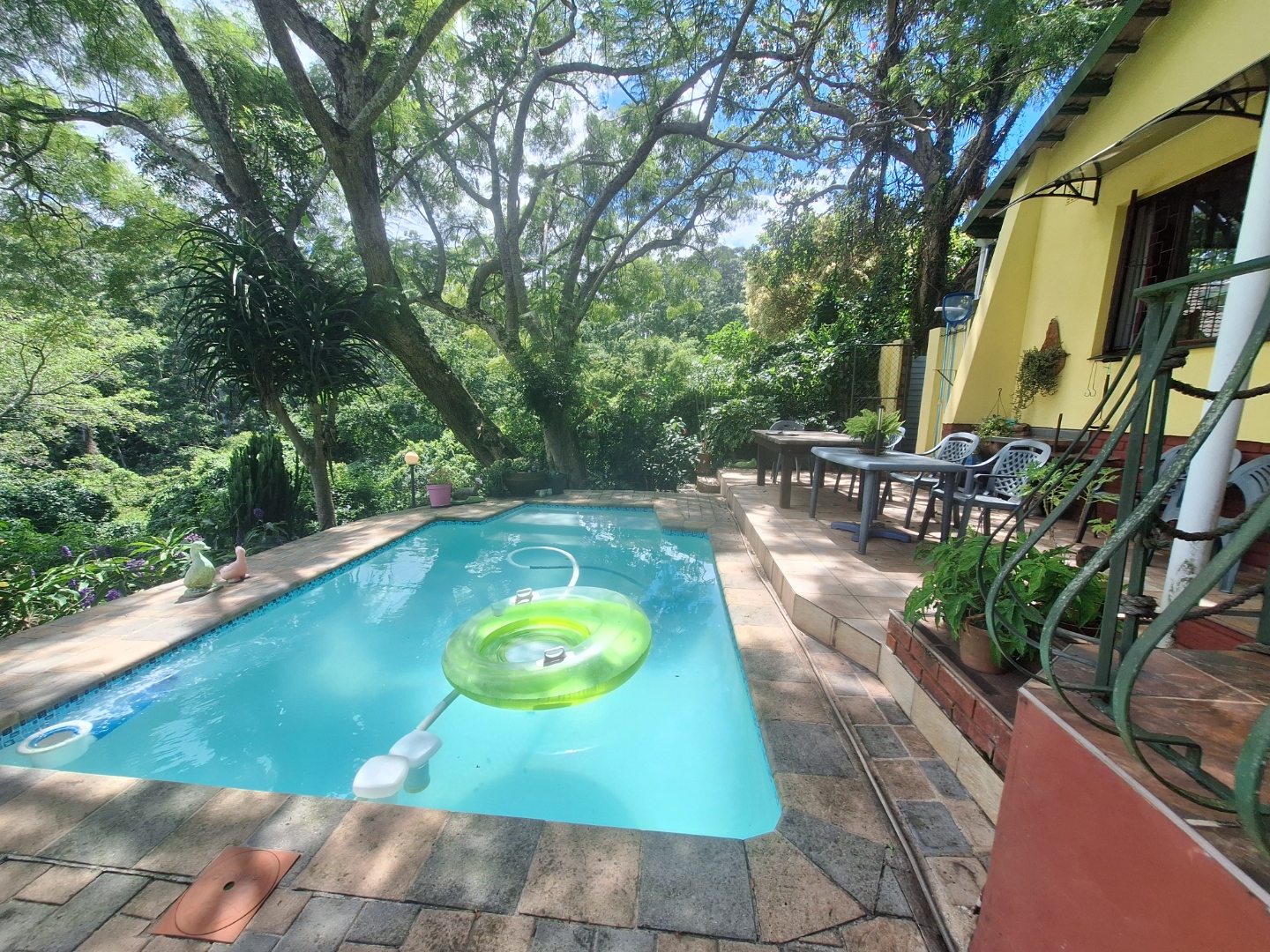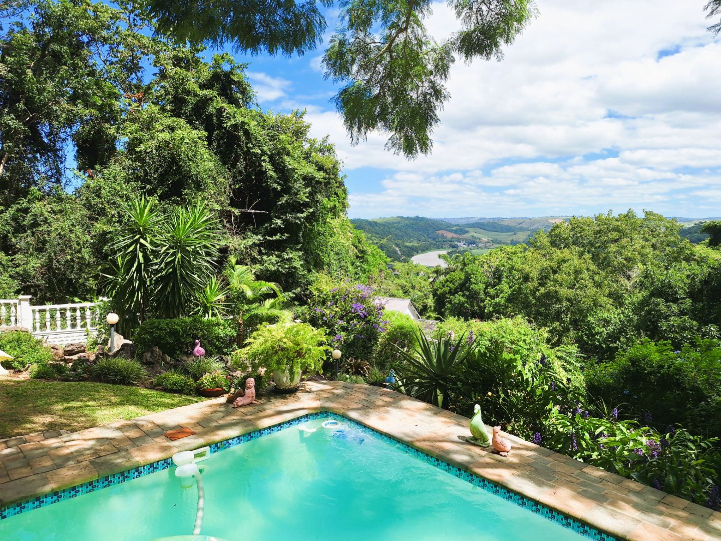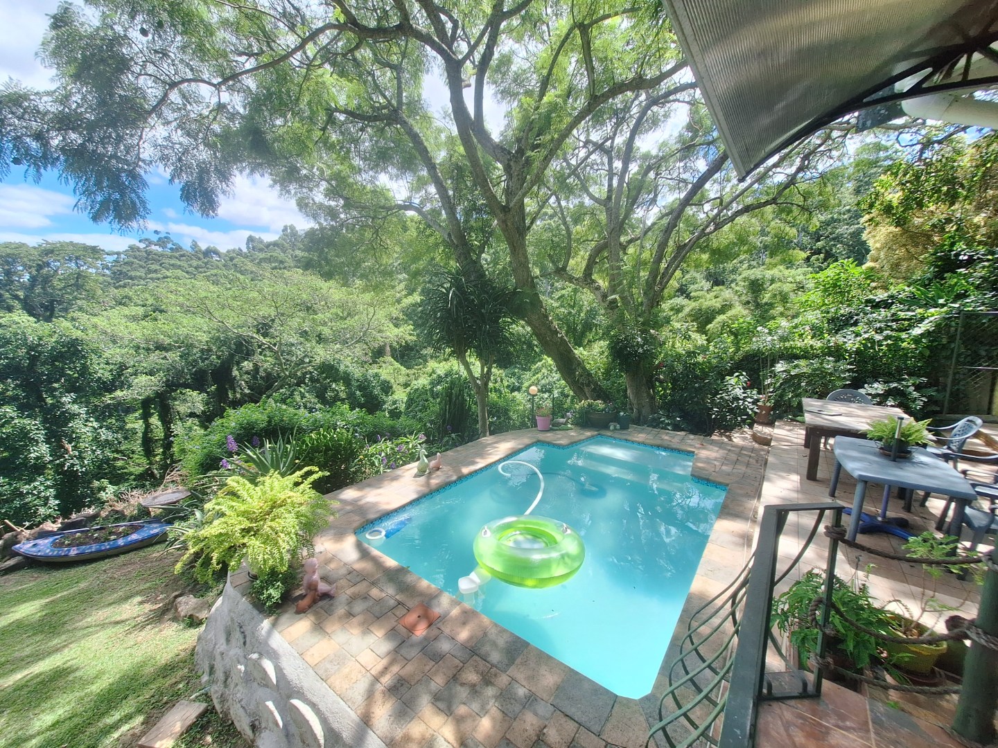 The garden is a nature lover’s dream, filled with natural rock features, mature trees, and shaded corners perfect for relaxation. The cosy lounge opens onto a serene patio overlooking the swimming pool, the valley, and the river below, creating the ideal setting for quiet mornings or sunset gatherings. With air-conditioning and a spacious farm-style side patio, this home offers comfort, charm, and tranquillity. Don’t miss out on this one-of-a-kind property.