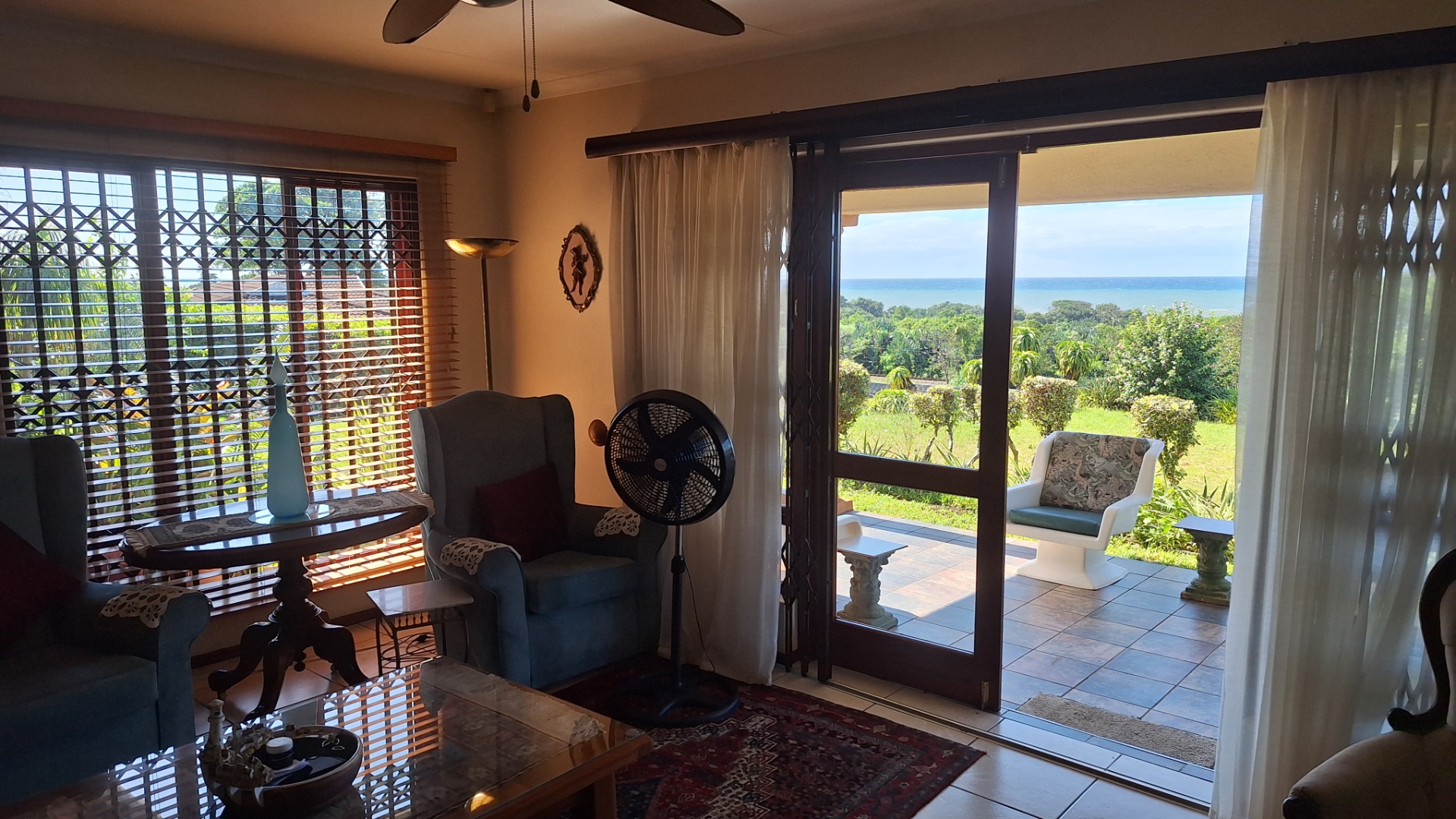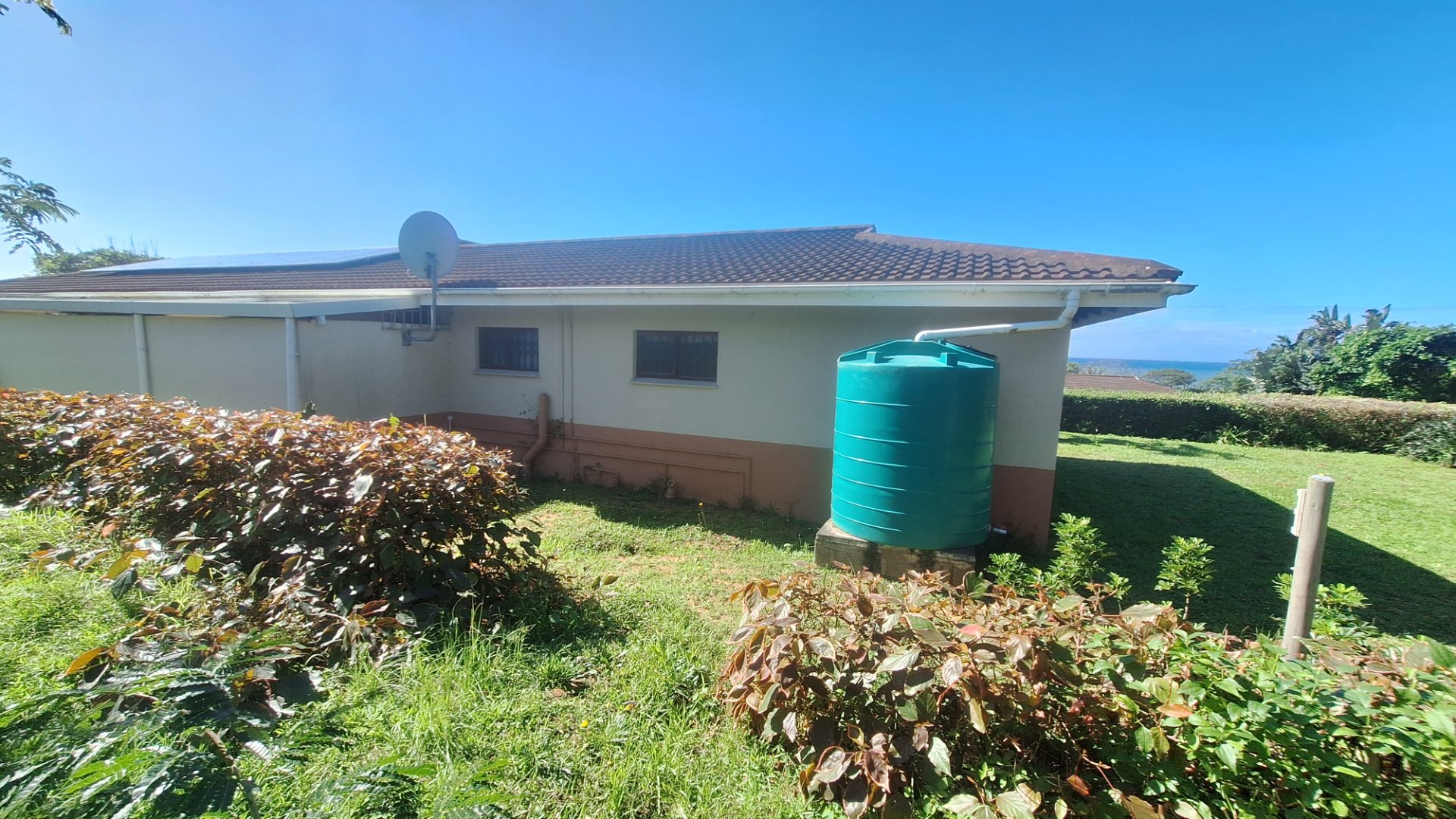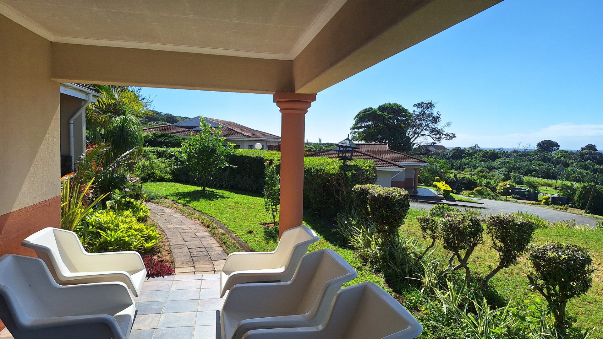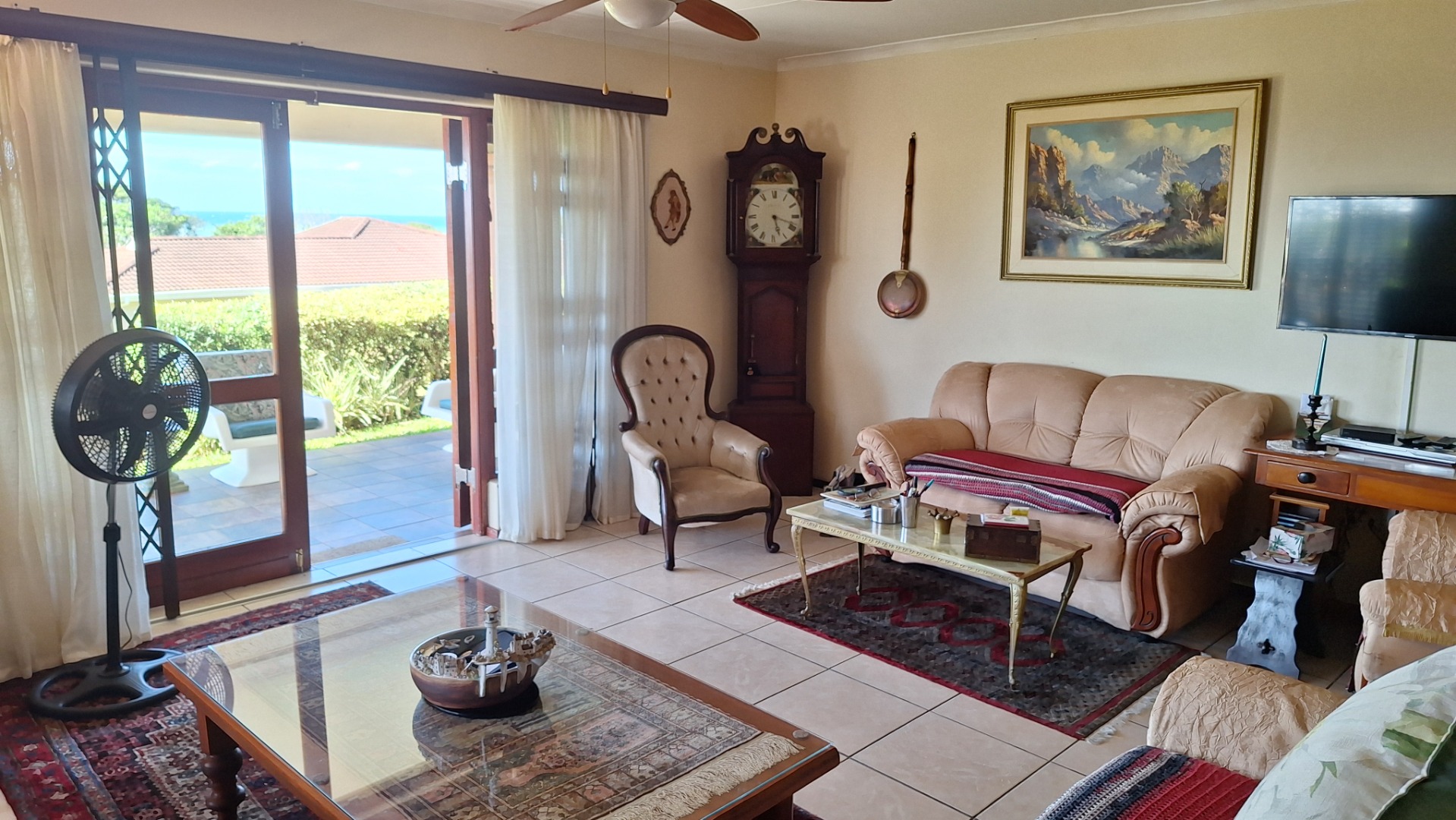 This 3 bedroom townhouse is situated a short distance from the Umtentweni beach, close to shops and a 4km drive to the nearest hospital and schools. Tiled throughout, with a lovely seaview from the patio and lounge area. Open plan concept with kitchen and lounge area, the kitchen has granit tops, eye level oven and plenty of cupboard space. The garage has direct access into the lounge, all three bedrooms are tiled have built in cupboards and aircon in 2 of them. The main bedroom is large and has an en-suite bathoom. There is a covered back patio that is currentl a small oasis with plants and a water feature.