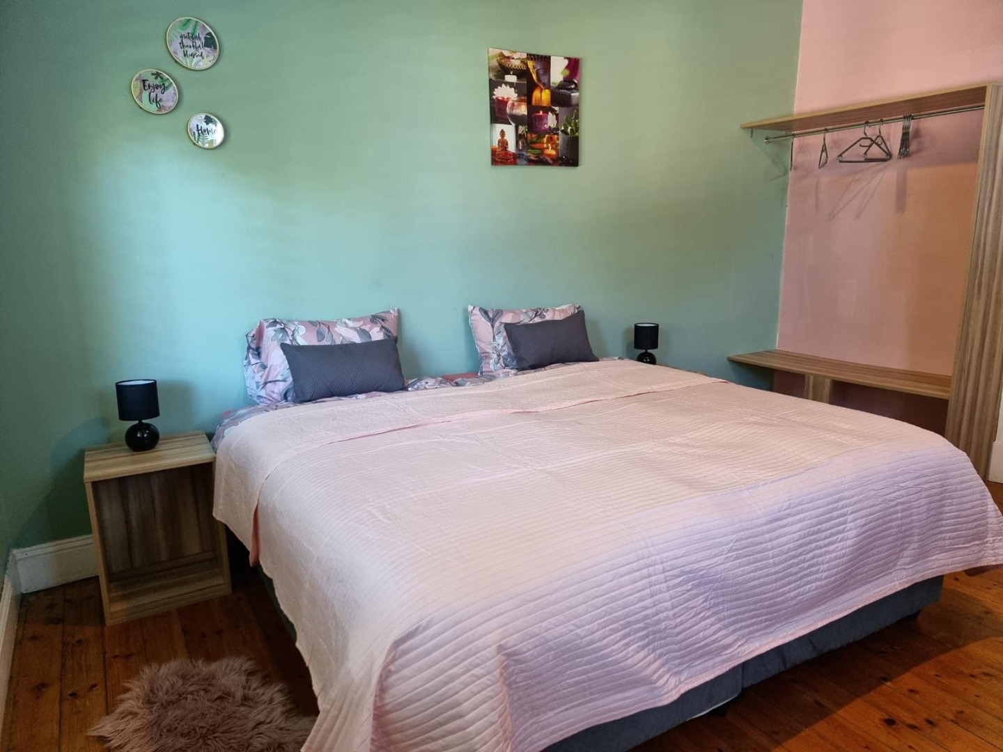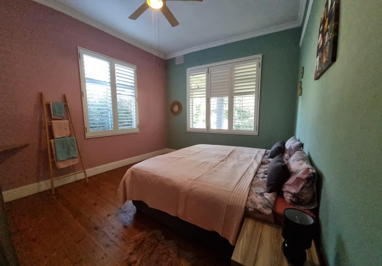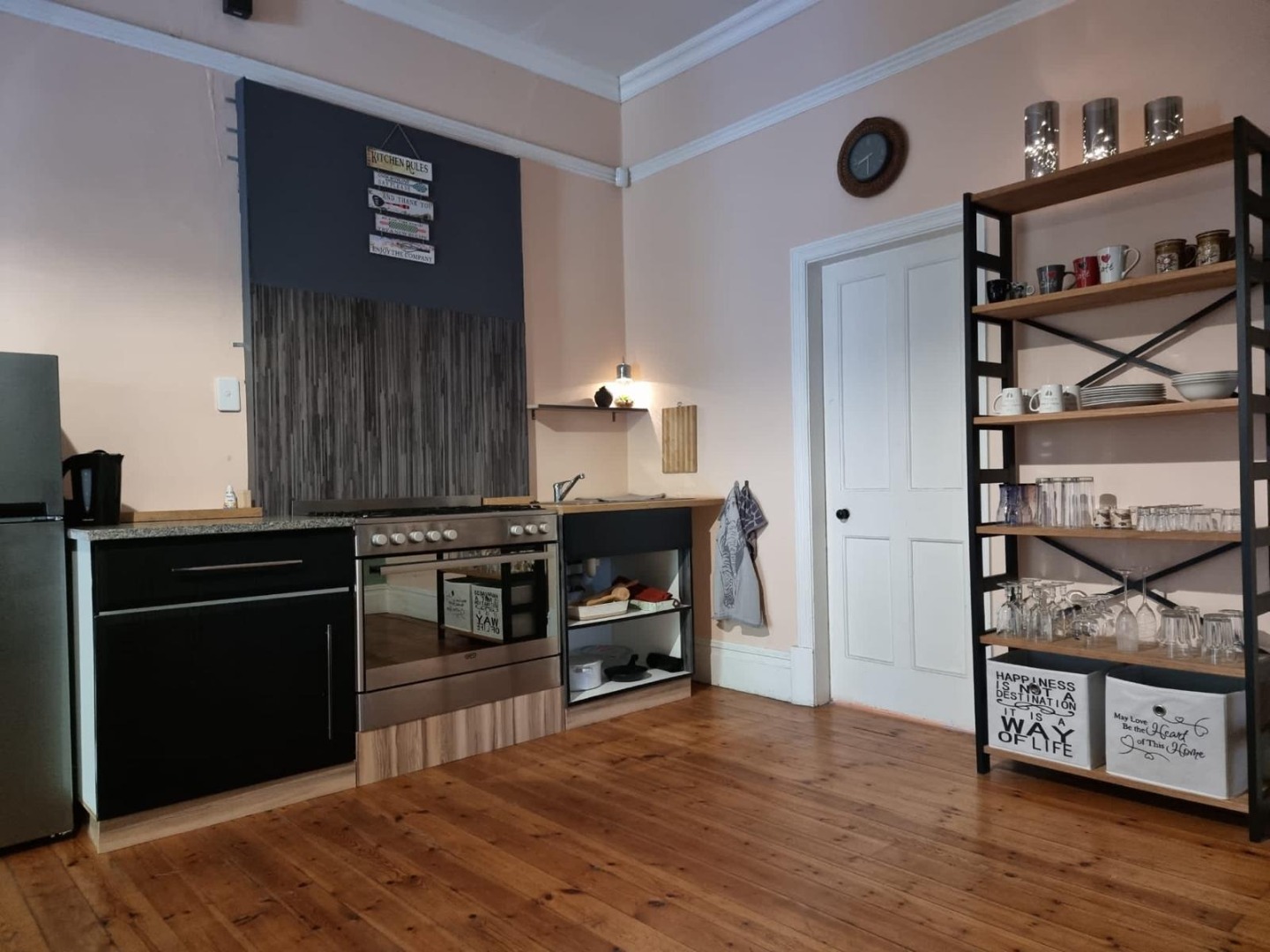 The interior features a versatile layout designed for comfortable living. The main kitchen is spacious and open-plan, equipped with a modern stainless steel oven/stove, black and wood-look cabinetry, and ample open shelving, all complemented by high ceilings and polished wooden floors. A secondary, compact kitchen area or bar space offers a built-in breakfast bar, wood-look countertops, and dark tiled backsplashes, ideal for casual dining or entertaining. The property includes a dedicated dining room and a spacious lounge, featuring warm hardwood floors, high ceilings with crown molding, and an attractive arched doorway, creating an elegant flow.