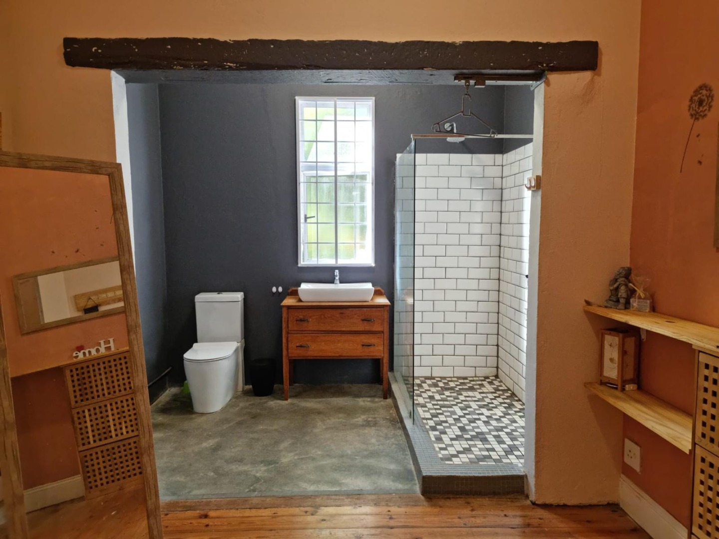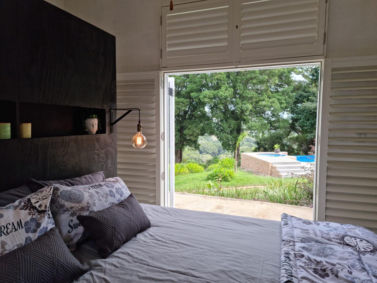 Accommodation comprises four well-appointed bedrooms, two of which are ensuites, offering comfort and style. Bedrooms showcase unique designs, from a modern space with a dark wood headboard and industrial lighting opening directly to the garden and pool area, to rooms with high vaulted ceilings, integrated shelving, and contemporary finishes. The three bathrooms include a luxurious freestanding bathtub with elegant plantation shutters, providing a serene retreat. Outdoor living is a highlight, with a covered patio featuring modern bi-fold doors, a refreshing swimming pool, and a relaxing jacuzzi, all set within a private garden with scenic views, including glimpses of the