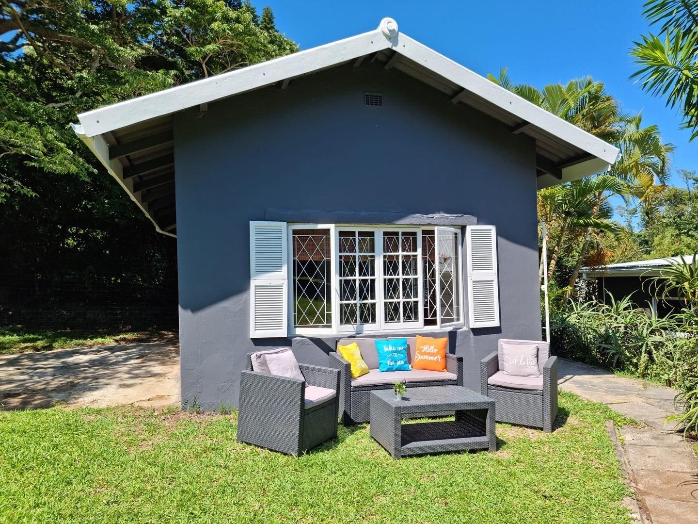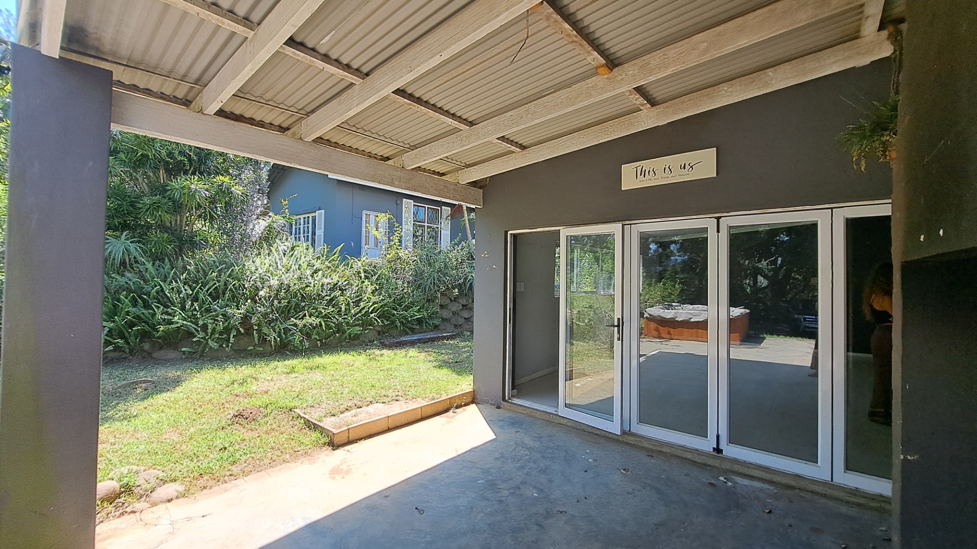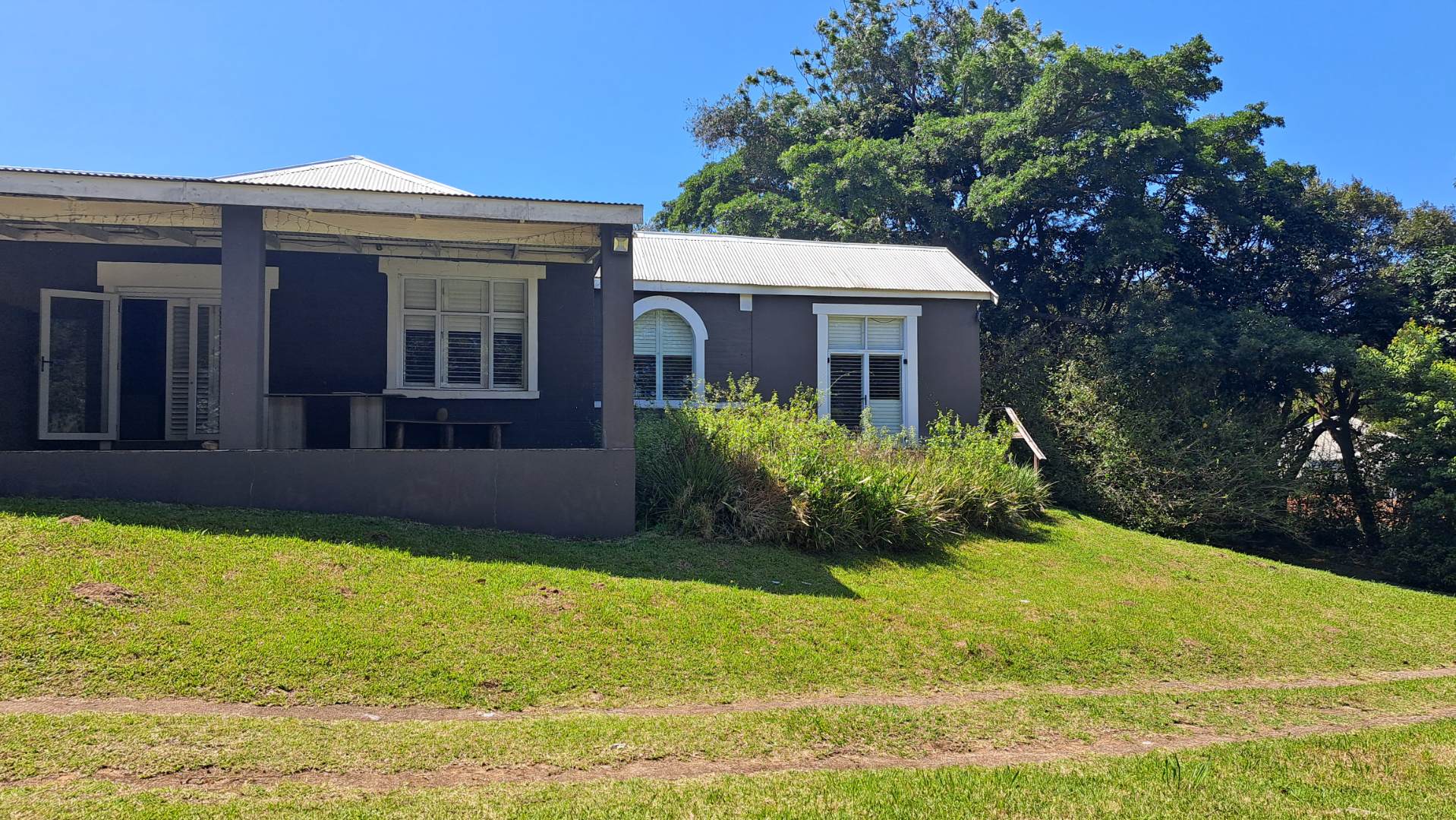 Nestled in the scenic coastal town of Umtentweni, Port Shepstone, this charming 4-bedroom, 3-bathroom residence offers a unique blend of country living and coastal proximity. Set on a generous 4057 sqm erf, the property boasts a dark exterior with white trim, surrounded by lush, mature trees that ensure privacy and a tranquil atmosphere. While the exterior presents an opportunity for aesthetic updates, the expansive grassy yard and covered verandah provide an inviting kerb appeal, hinting at the lifestyle within.