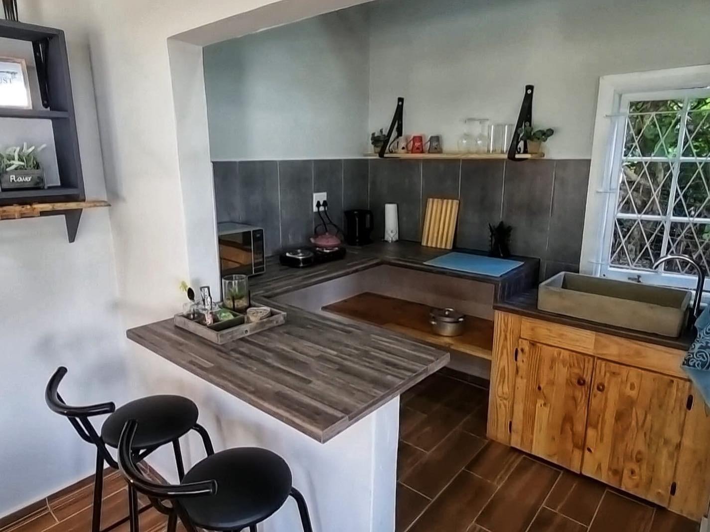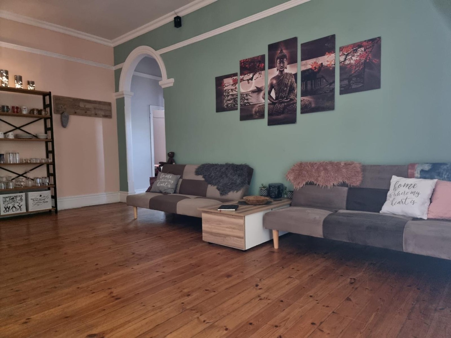 The interior features a versatile layout designed for comfortable living. The main kitchen is spacious and open-plan, equipped with a modern stainless steel oven/stove, black and wood-look cabinetry, and ample open shelving, all complemented by high ceilings and polished wooden floors. A secondary, compact kitchen area or bar space offers a built-in breakfast bar, wood-look countertops, and dark tiled backsplashes, ideal for casual dining or entertaining. The property includes a dedicated dining room and a spacious lounge, featuring warm hardwood floors, high ceilings with crown molding, and an attractive arched doorway, creating an elegant flow.