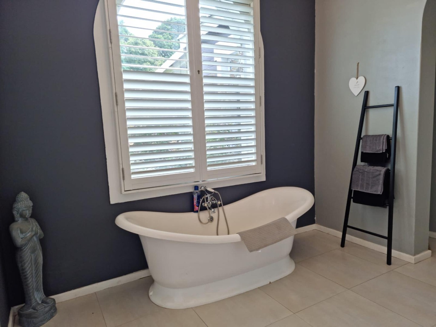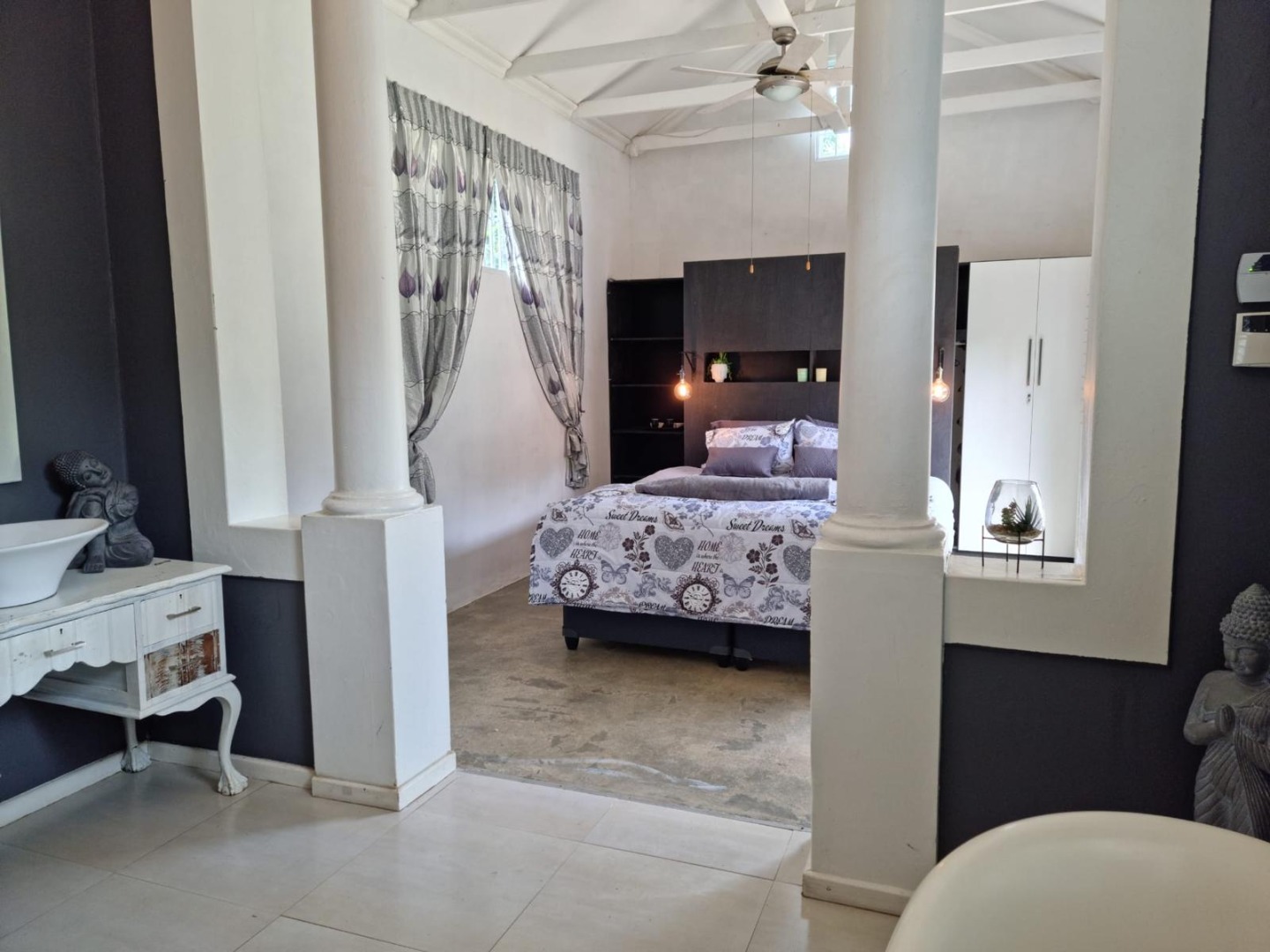 Nestled in the scenic coastal town of Umtentweni, Port Shepstone, this charming 4-bedroom, 3-bathroom residence offers a unique blend of country living and coastal proximity. Set on a generous 4057 sqm erf, the property boasts a dark exterior with white trim, surrounded by lush, mature trees that ensure privacy and a tranquil atmosphere. While the exterior presents an opportunity for aesthetic updates, the expansive grassy yard and covered verandah provide an inviting kerb appeal, hinting at the lifestyle within.