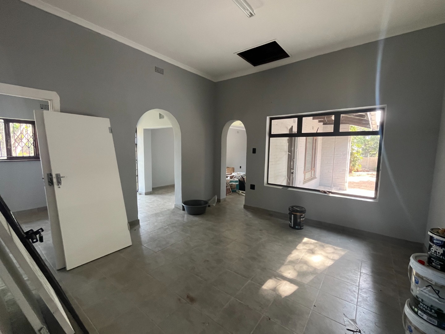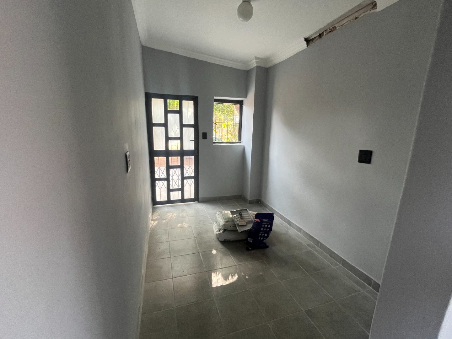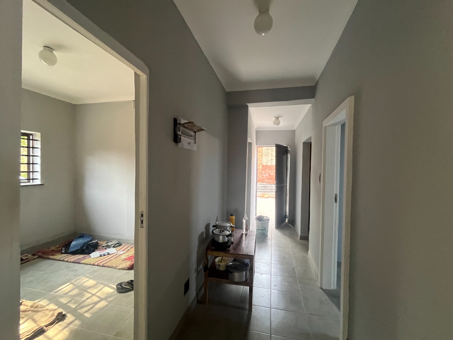 Renovated commercial property that can be used as offices with extra back room with semi-bathroom and store room. Main building with 4 door entrances, 5 rooms and open double reception area, communal bathroom with 2 toilets and 3 pre-paid electricity meters. Extra outside toilet with basin. Internal level parking area, walls and gated. On main road with access. Much potential with commercial rights.