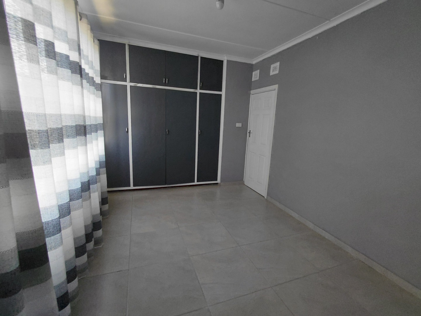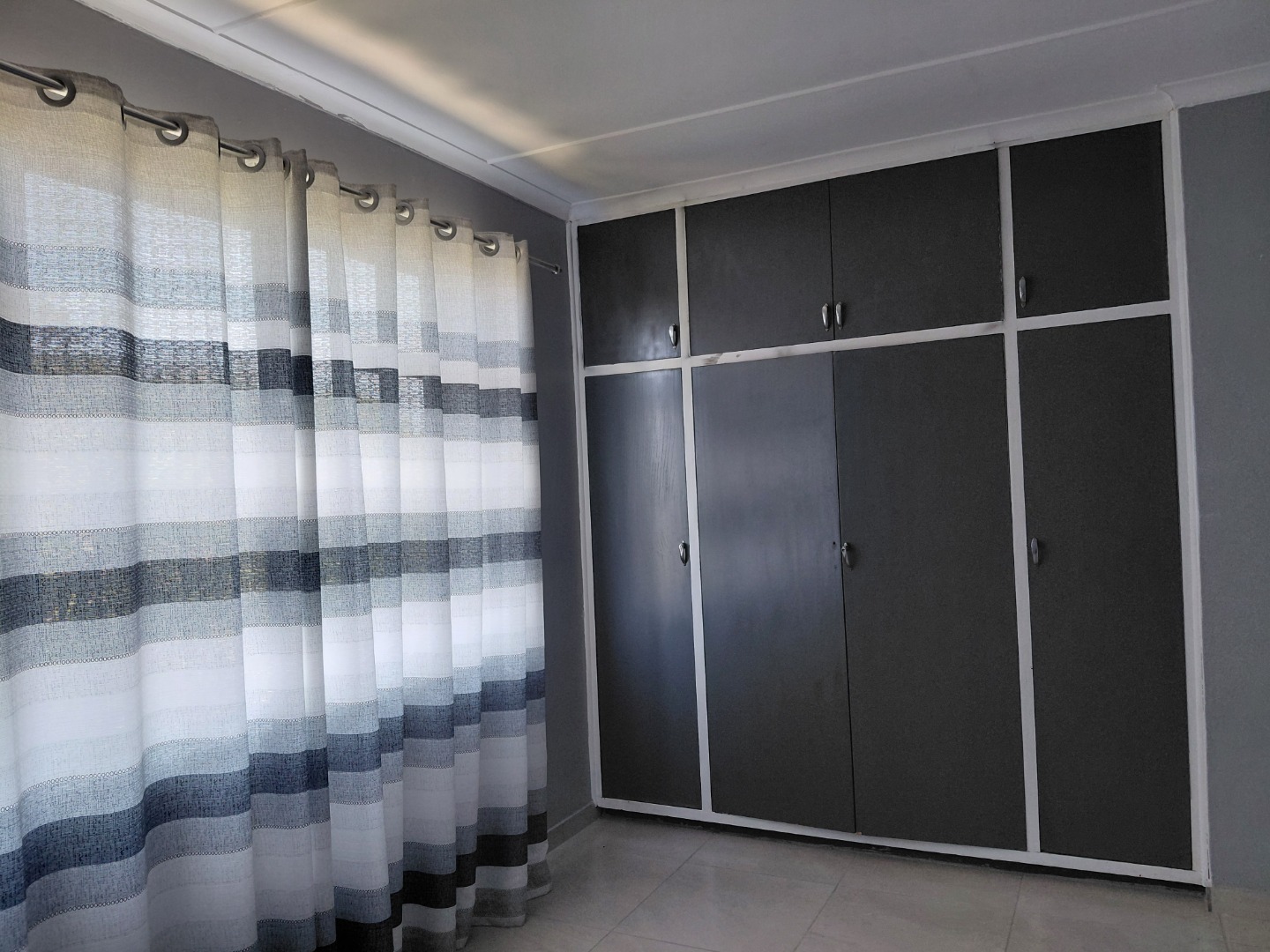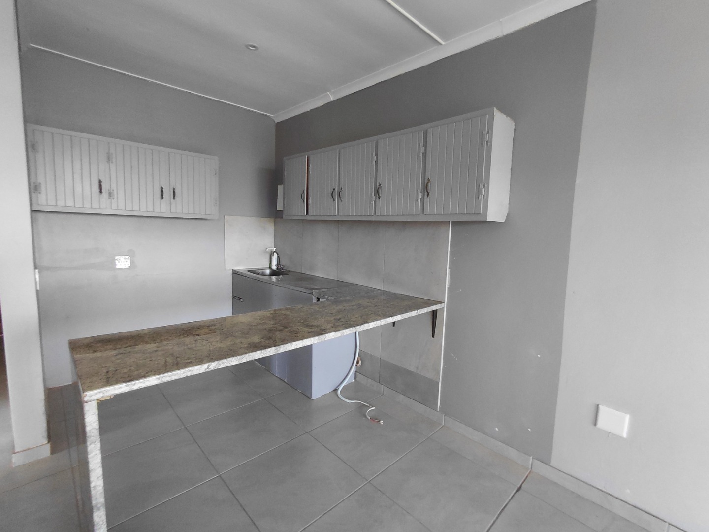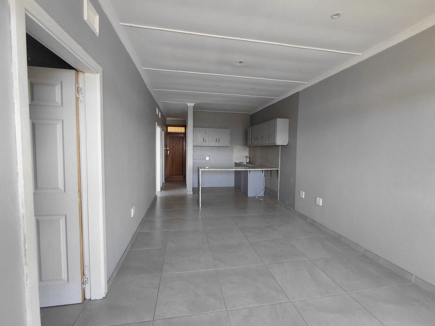 The property features a well-appointed kitchen integrated into the open-plan design, complete with ample cabinetry and an integrated breakfast bar, perfect for casual dining. Throughout, durable tiled flooring ensures easy maintenance and a clean, modern aesthetic, complemented by a neutral grey colour palette.