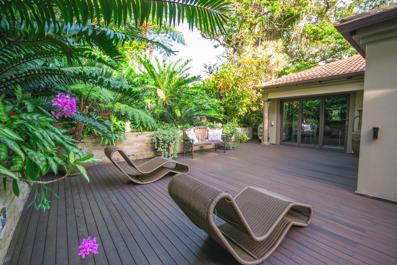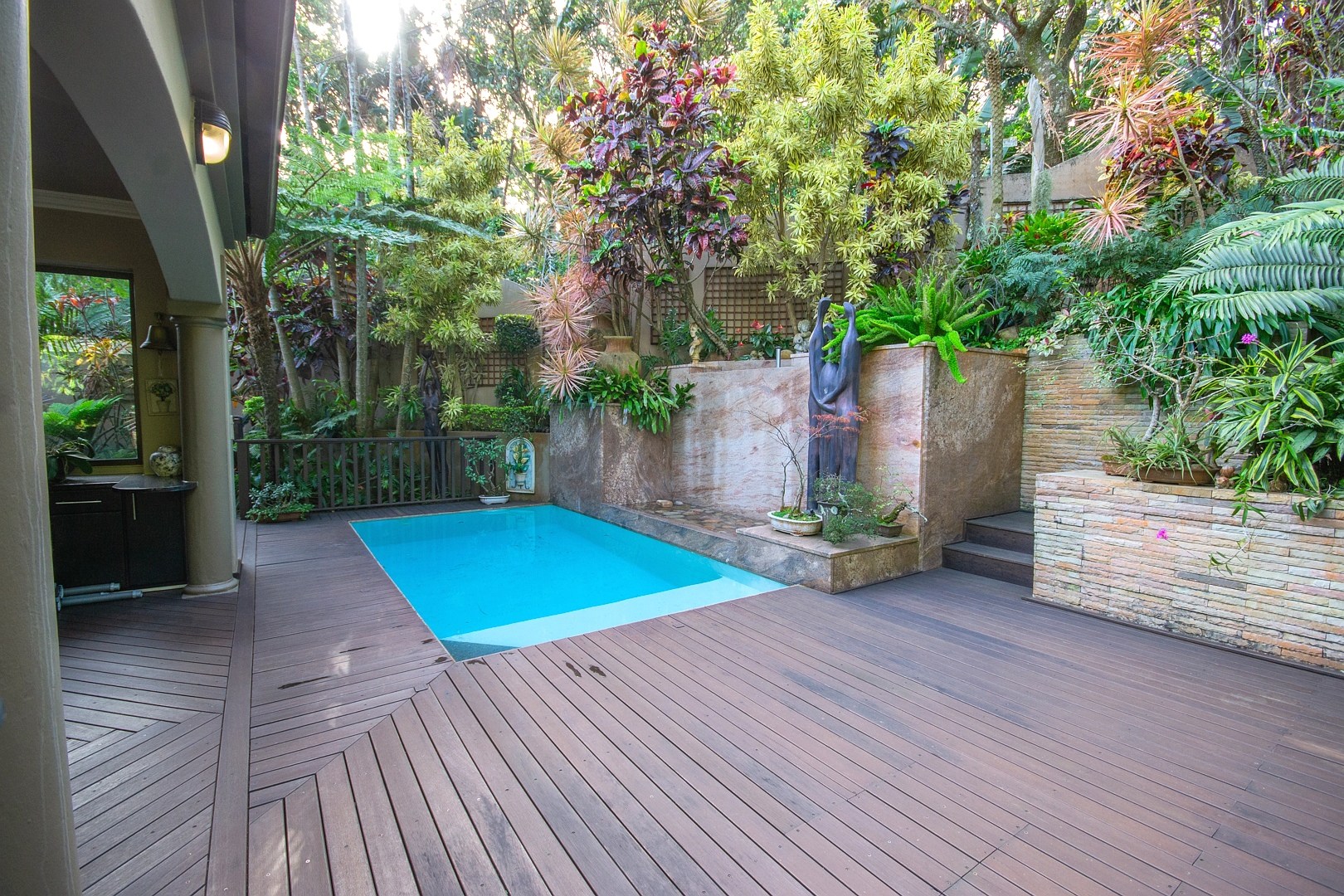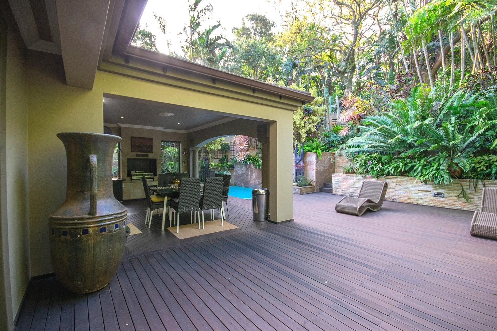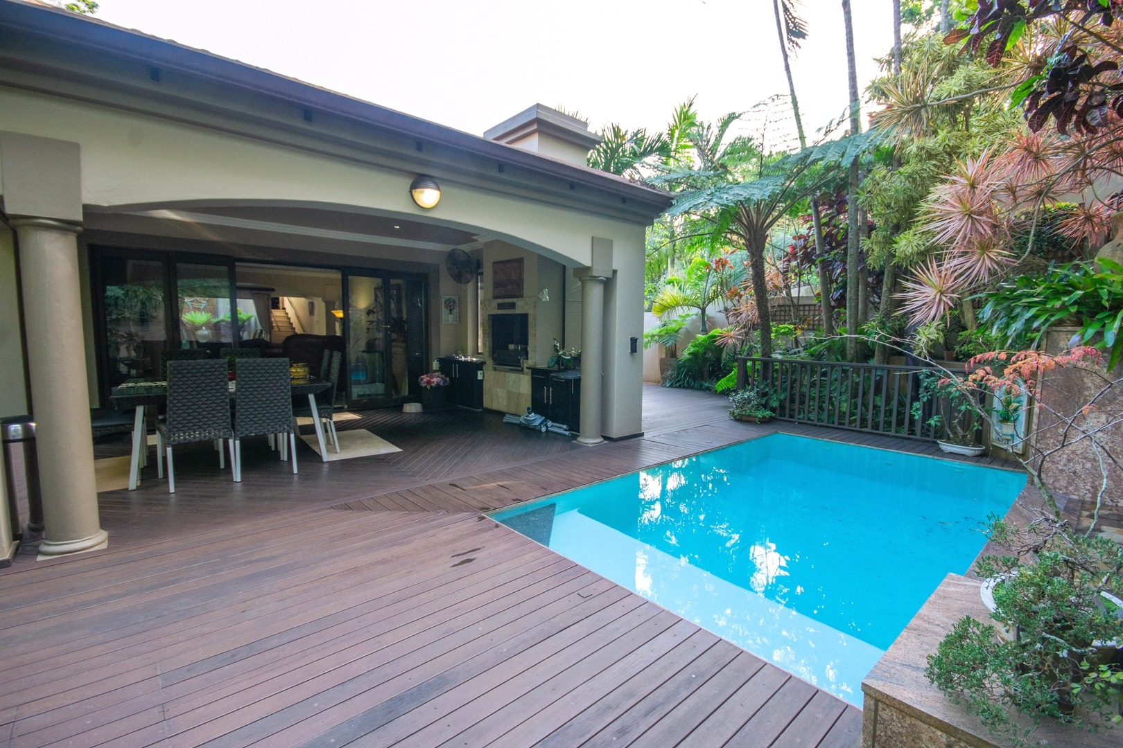 Fabulous freestanding home in a secure complex in upmarket Southbroom now on the market for sale - and WOW - this is stunnng. Welcome to your dream home in the heart of Southbroom – an upmarket, tropical paradise renowned for its elite lifestyle and coastal charm. This luxurious, freestanding townhouse, set in an exclusive, well-maintained complex, offers the perfect blend of privacy, elegance, and modern convenience. From the moment you step inside, you are greeted by seamless flow and exceptional attention to detail. The expansive open-plan design encompasses a chef’s dream kitchen adorned with Caesarstone countertops, concealed lighting, a separate scullery, and an adjoining courtyard – ideal for effortless entertaining. The spacious dining area, lounge, and bespoke bar seamlessly extend to a covered patio with a built-in braai and outdoor cooking station, all overlooking a beautiful wooden deck and rim-flow pool with a tranquil water feature, set amidst an exquisite, lush, mature garden - really so beautiful ! Pool is heated with flexible wooden railings that can be added to secure pool area.