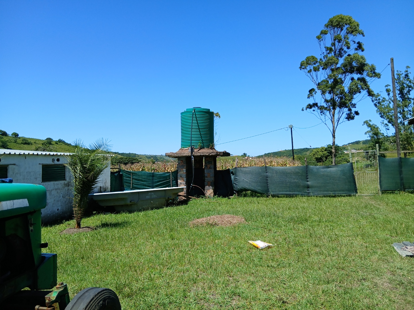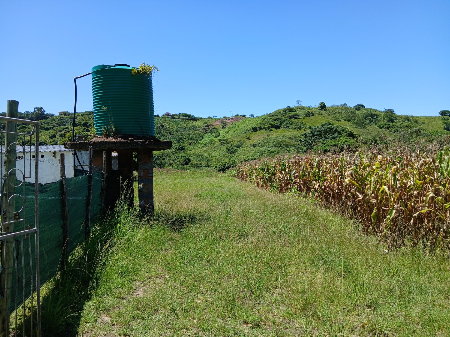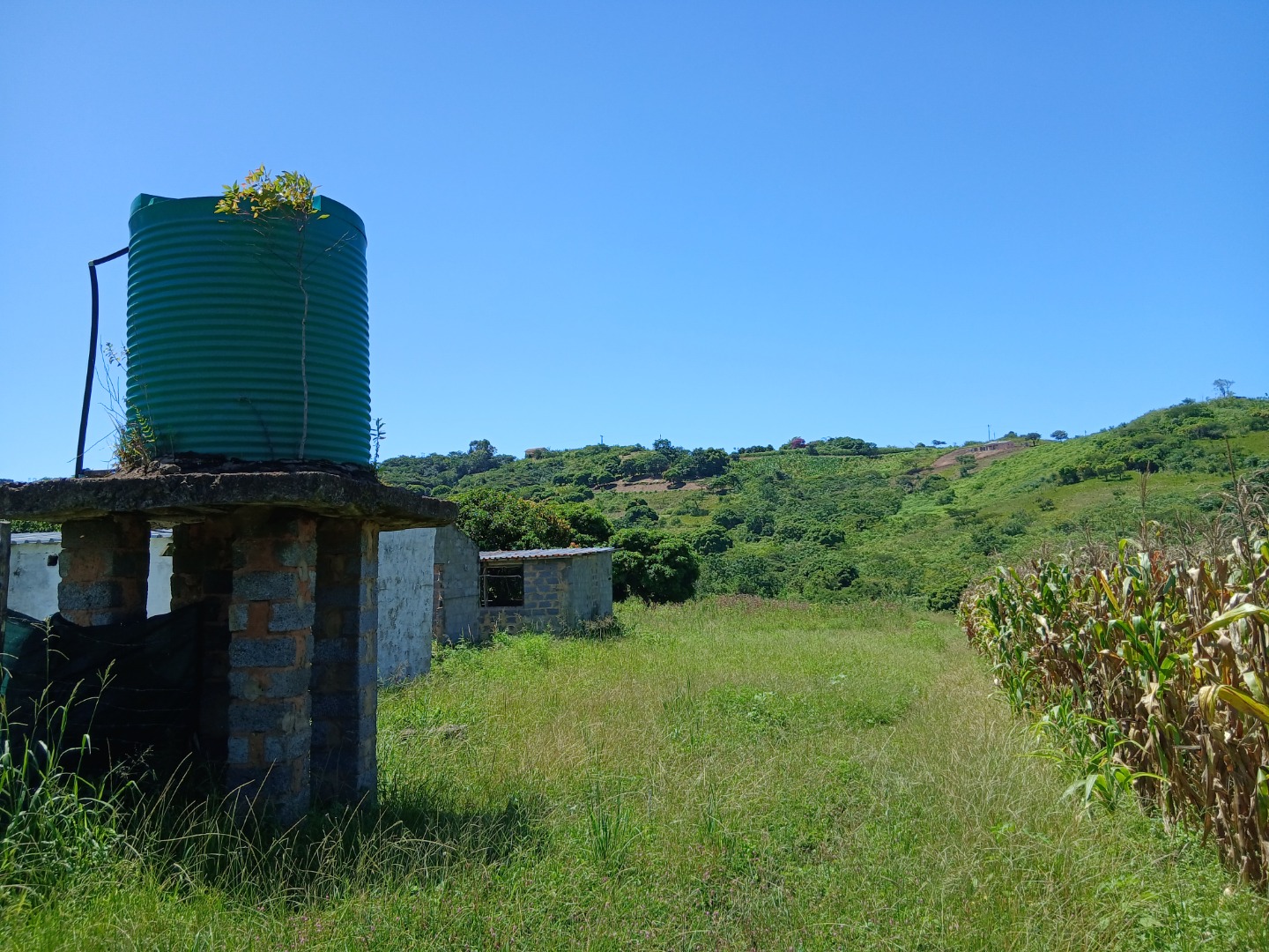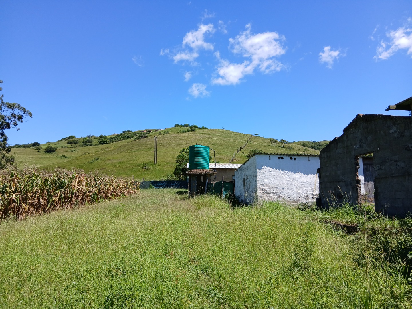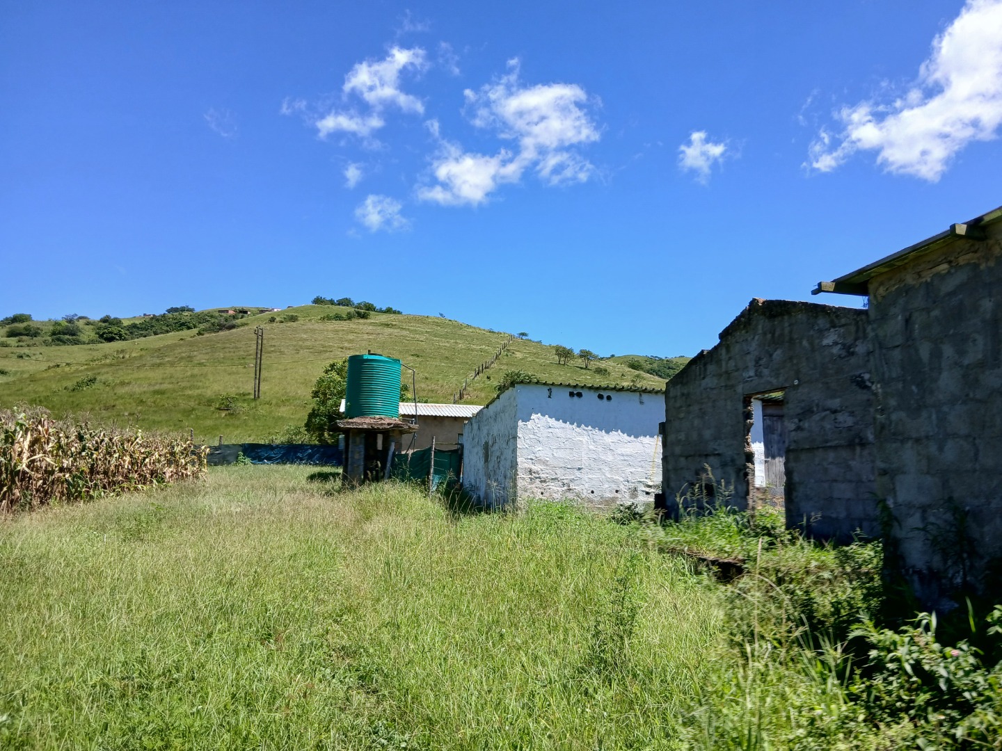 The vast erf size provides ample space for various uses, from cultivating crops, as evidenced by the existing cornfields, to creating a private estate. Enjoy breathtaking scenic views of rolling green hills under clear blue skies, offering a tranquil backdrop to your future home. A large water storage tank is present on the property, supporting potential agricultural or domestic needs. The land includes open parking for one vehicle and is partially bordered by a simple fence, defining its generous boundaries.