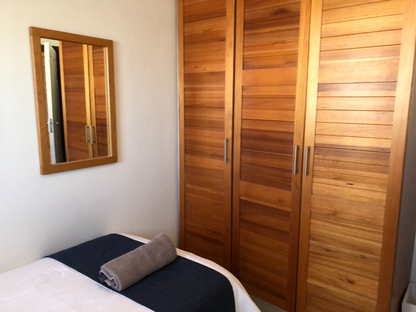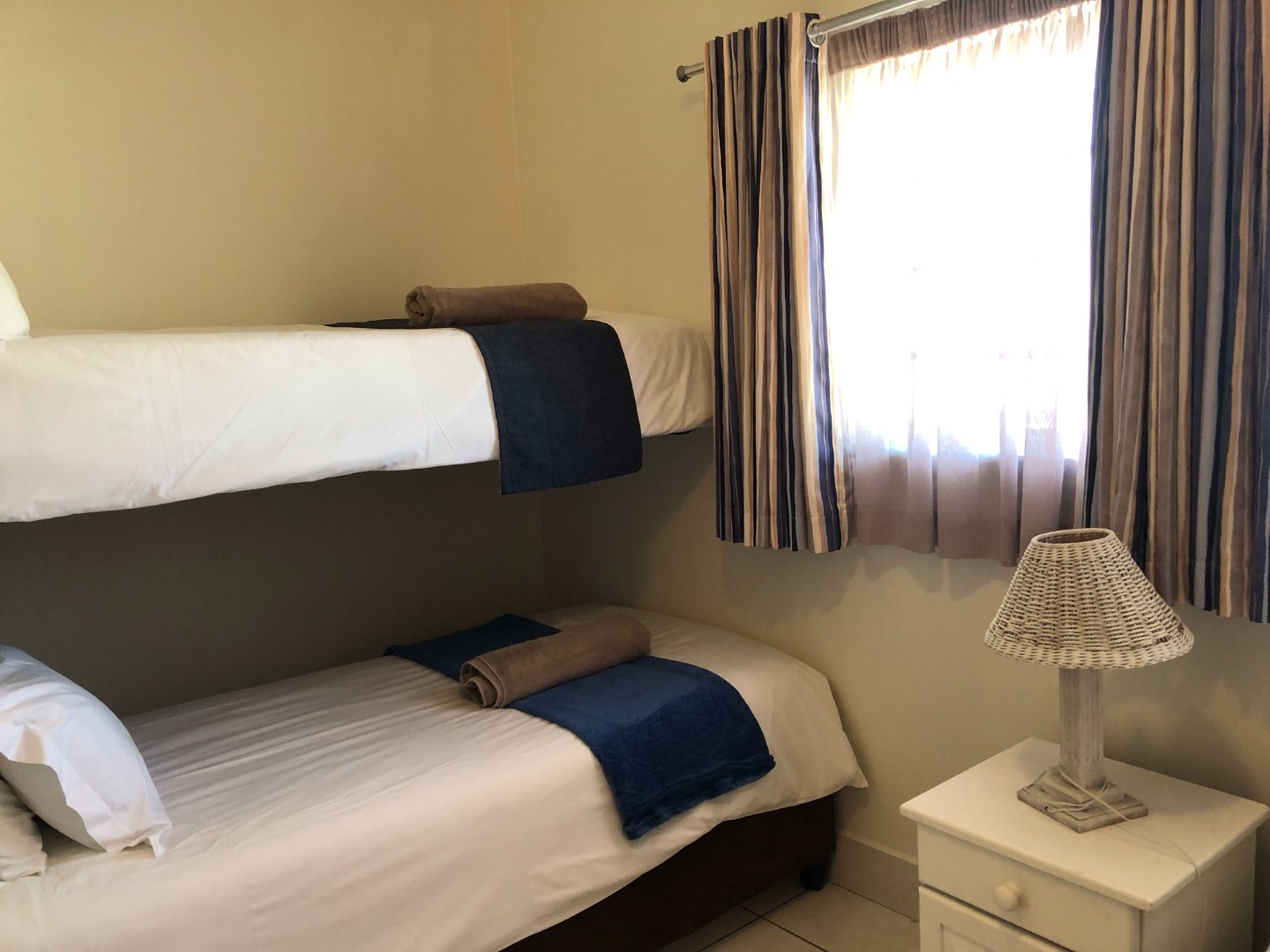 The unit has a family / guest bedroom with bunk beds and single bed with built in cupboards and separate bathroom