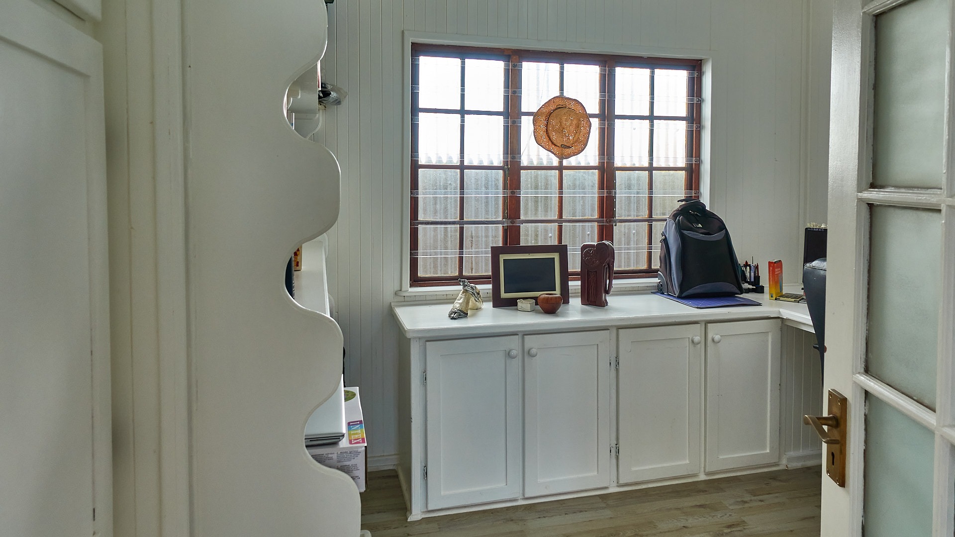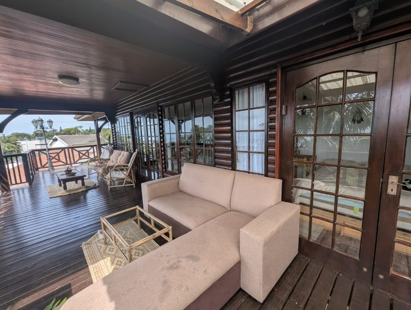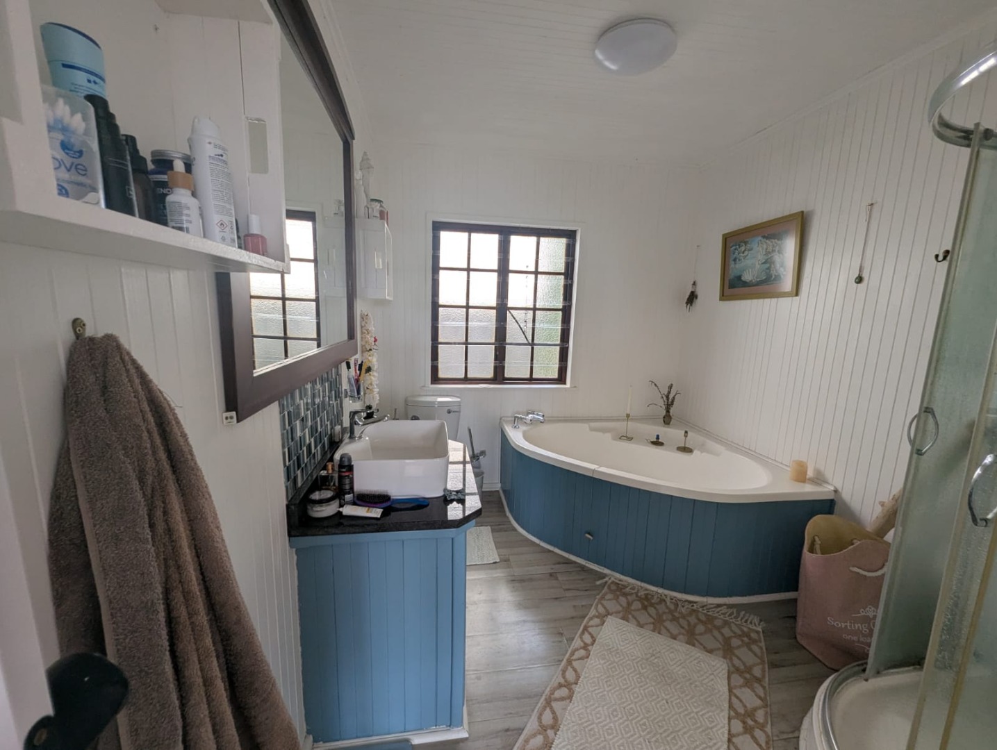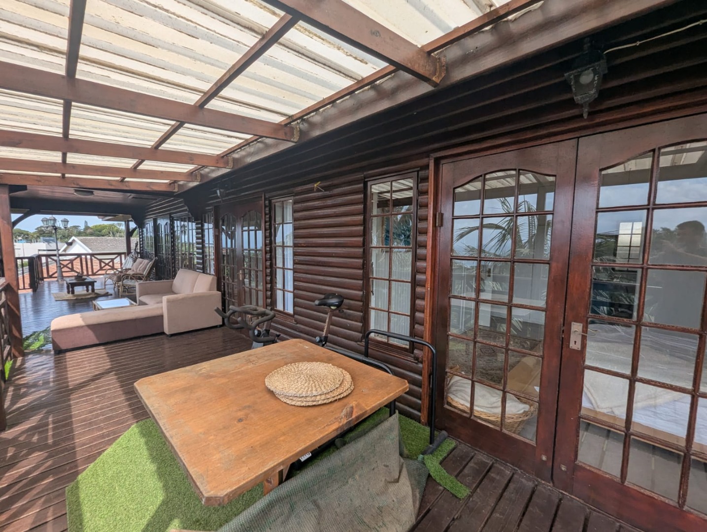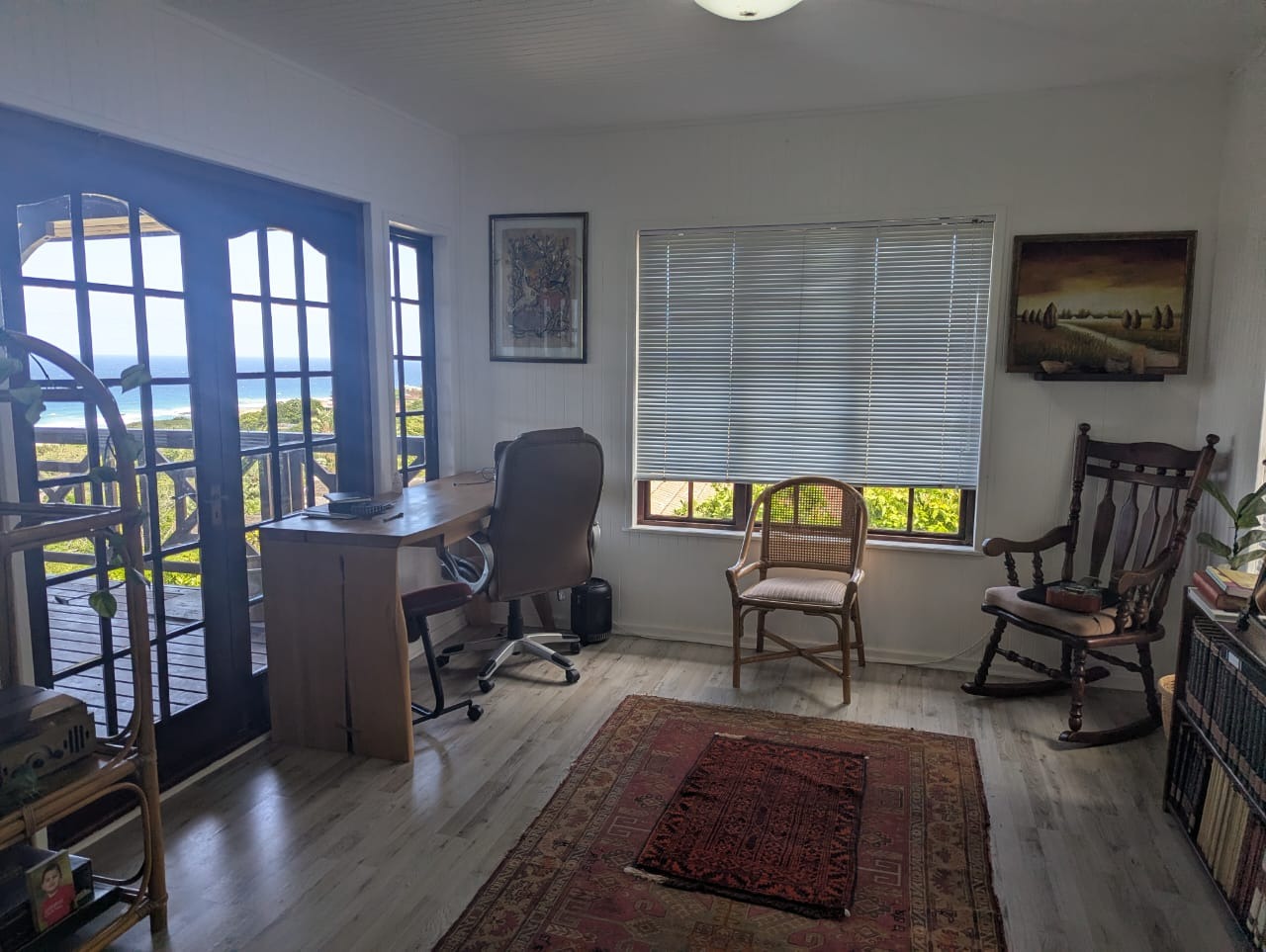Down the passage, you will find two generous bedrooms and a dedicated office, ideal for working from home or as a study or additional guest space. The main bedroom features a picture-perfect, modern en-suite bathroom, and both the main bedroom and second bedroom open via double doors onto the covered wooden patio. This stunning wooden balcony runs the entire length of the home, offering breathtaking 180-degree ocean views and an exceptional entertainment area, while also wrapping around one side of the house. The garden is large, spacious, and easy to maintain.