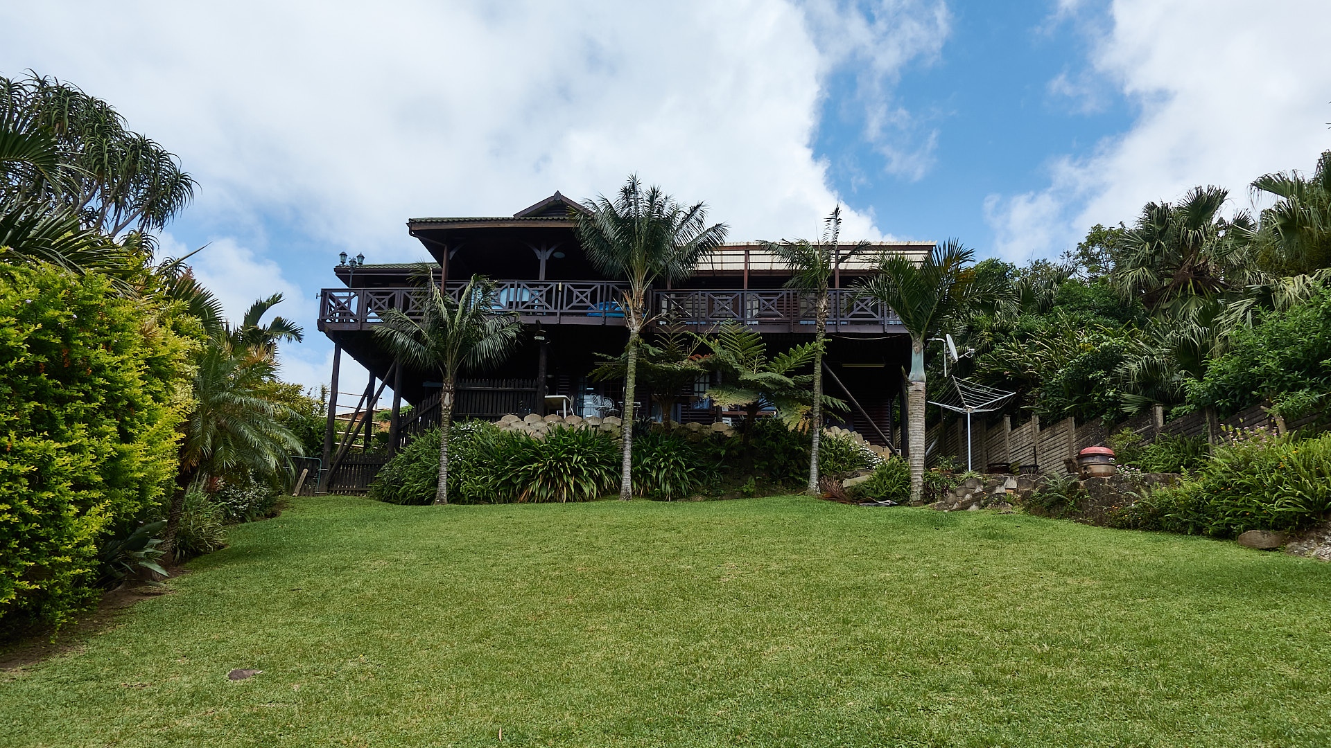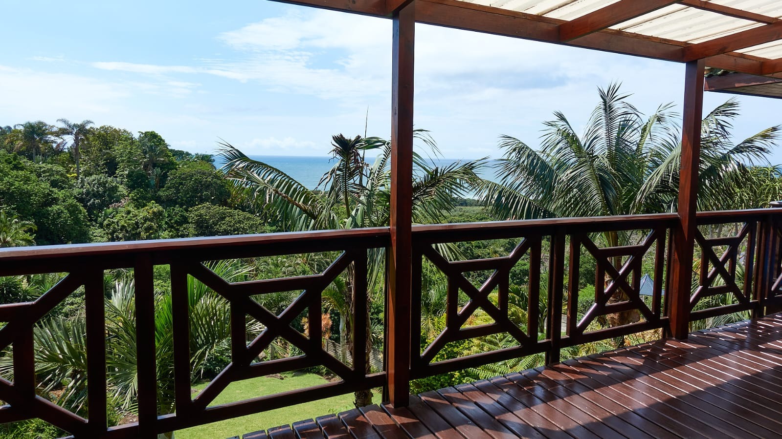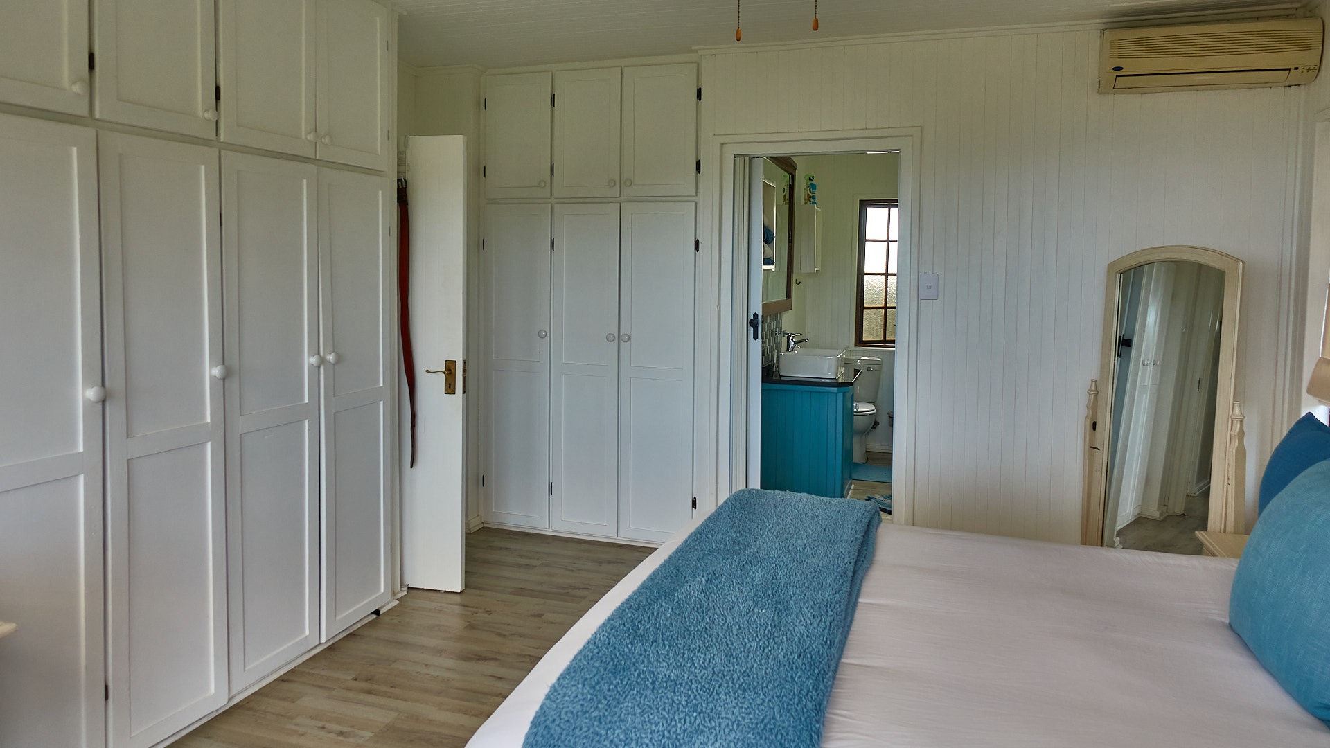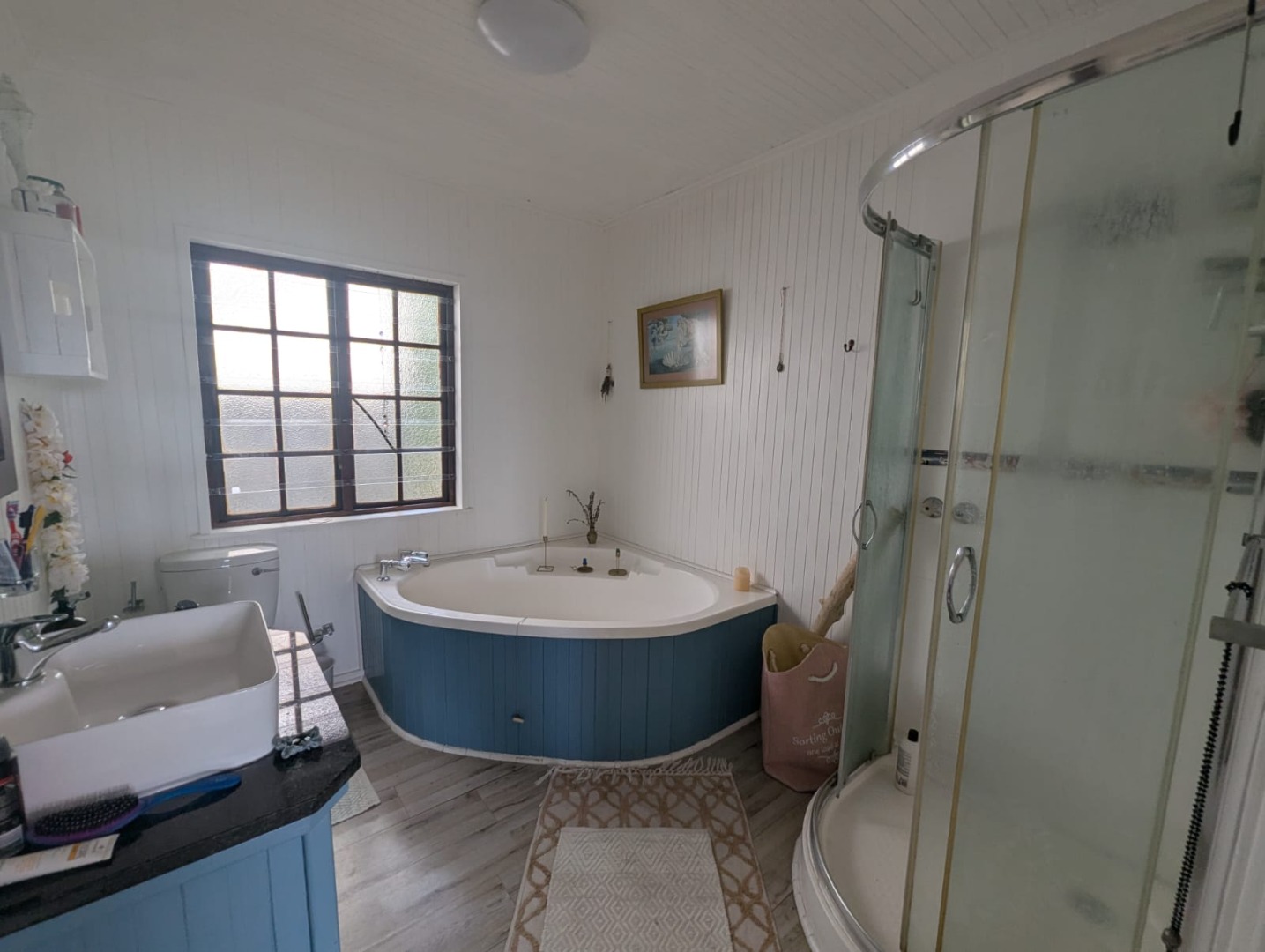 Down the passage, you will find two generous bedrooms and a dedicated office, ideal for working from home or as a study or additional guest space. The main bedroom features a picture-perfect, modern en-suite bathroom, and both the main bedroom and second bedroom open via double doors onto the covered wooden patio. This stunning wooden balcony runs the entire length of the home, offering breathtaking 180-degree ocean views and an exceptional entertainment area, while also wrapping around one side of the house. The garden is large, spacious, and easy to maintain.