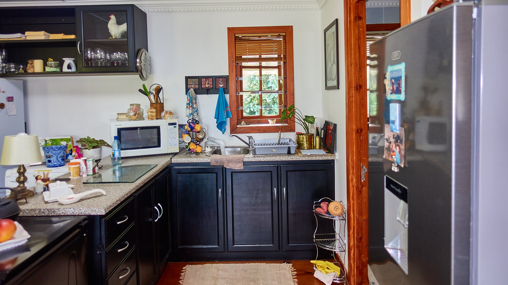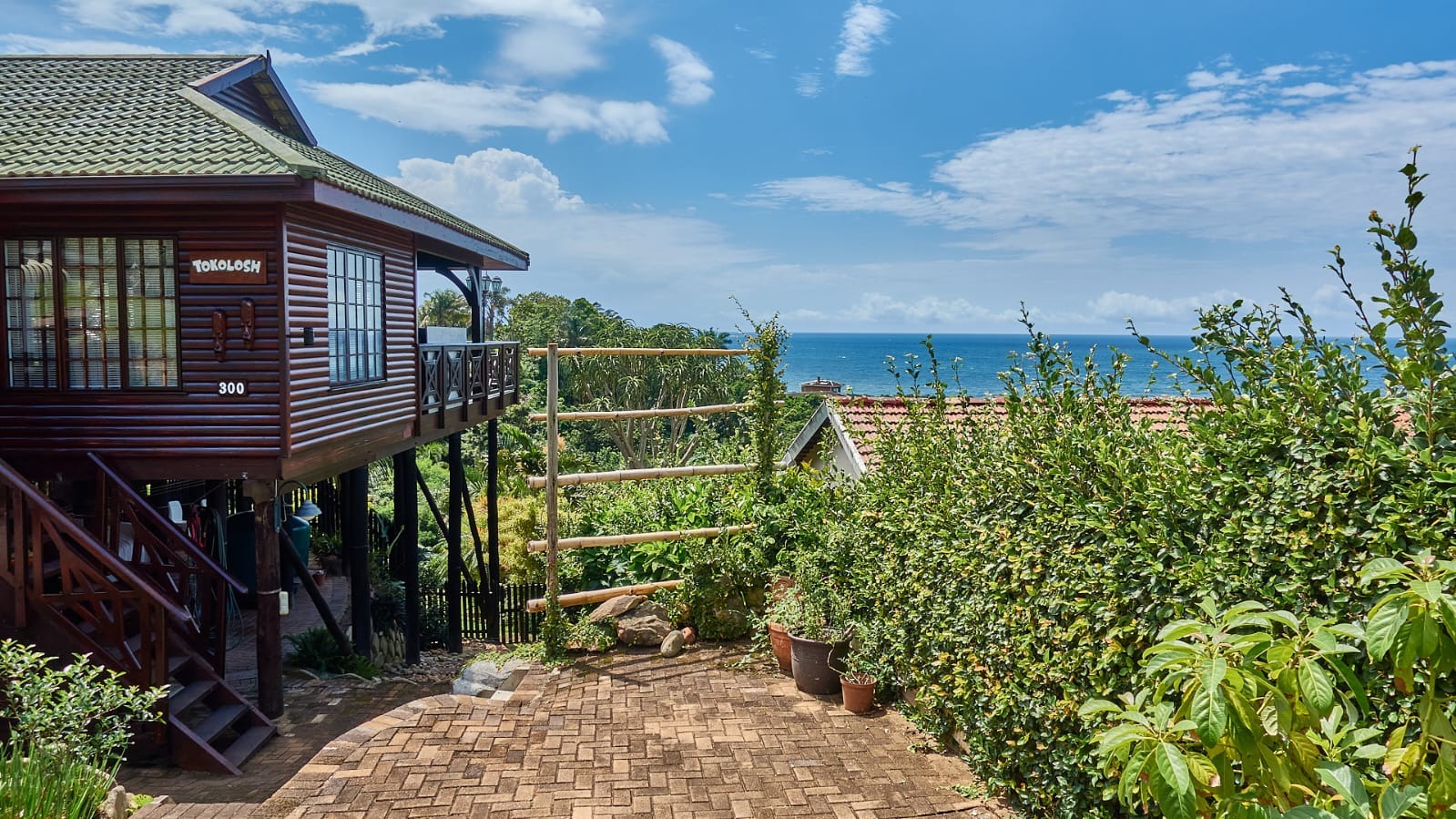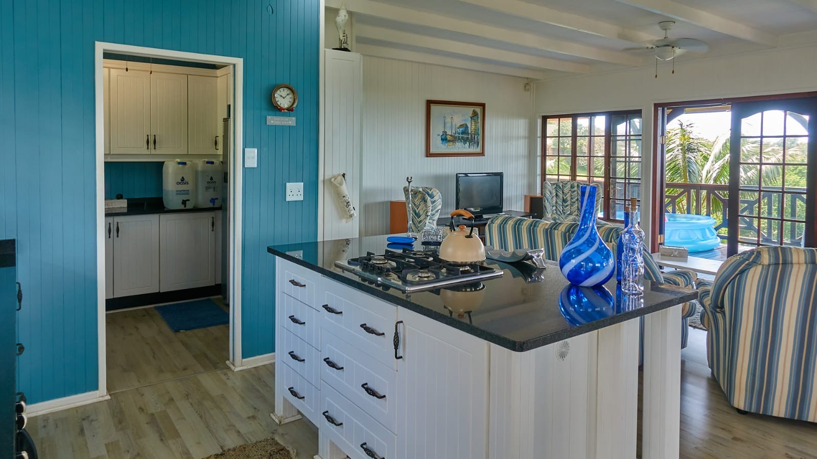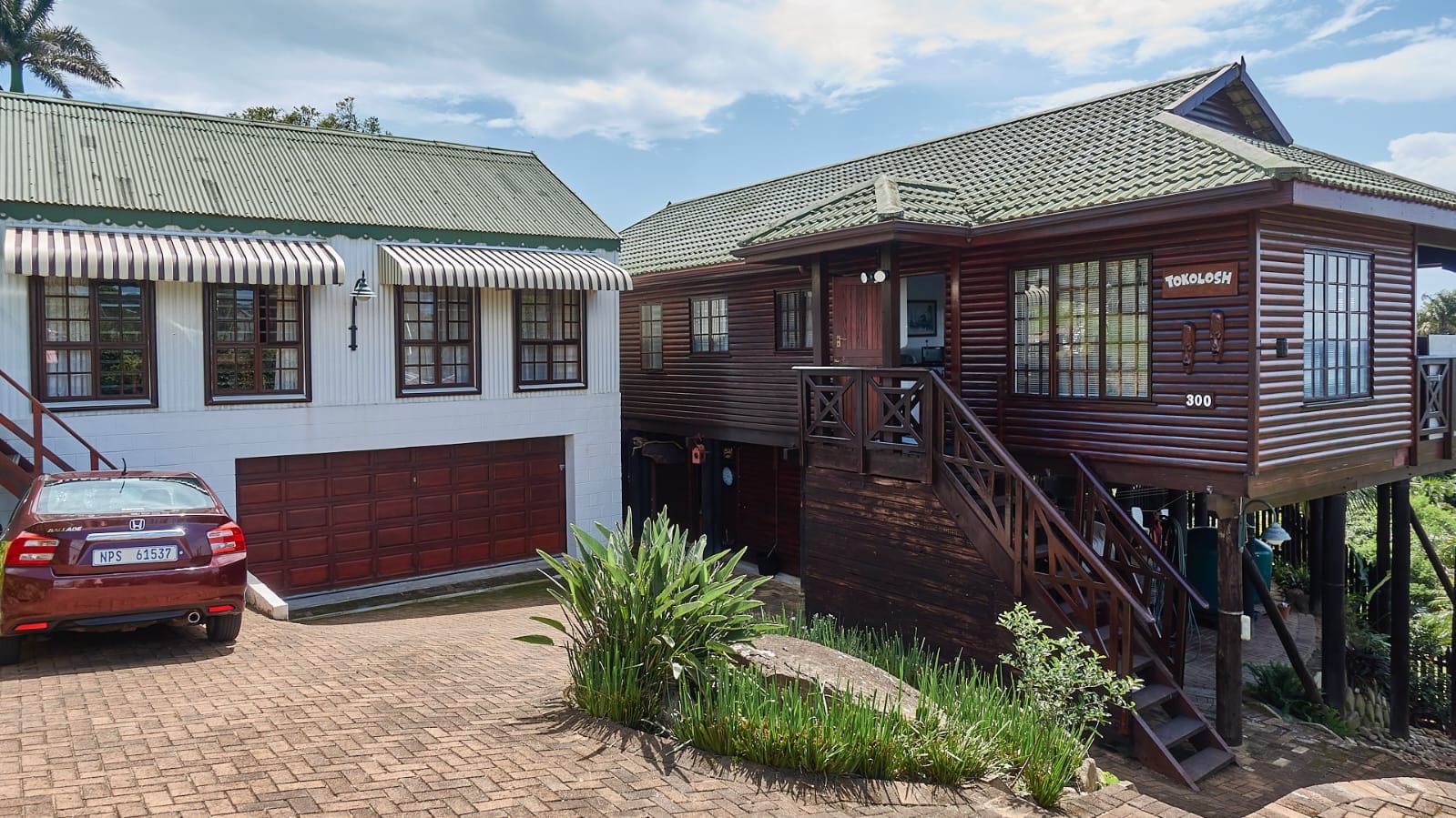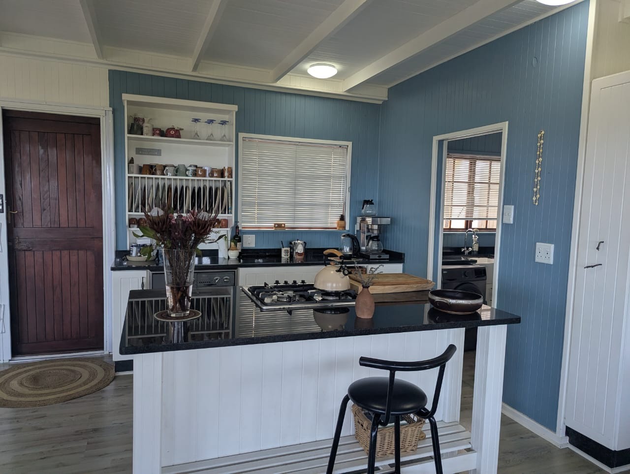 Entering this spectacular home will quite literally take your breath away. A true beach house masterpiece, this exceptional log home offers an unparalleled coastal lifestyle with uninterrupted ocean views and an atmosphere that feels like a permanent holiday. As you enter the upper level, you are welcomed by a striking blue-and-white open-plan kitchen, dining, and lounge area, where the endless blue of the ocean immediately captures your attention. Large double doors open onto an expansive wooden patio, seamlessly inviting the ocean into your living space. The modern kitchen boasts granite countertops and a separate scullery—beautifully designed and as functional as it is elegant.