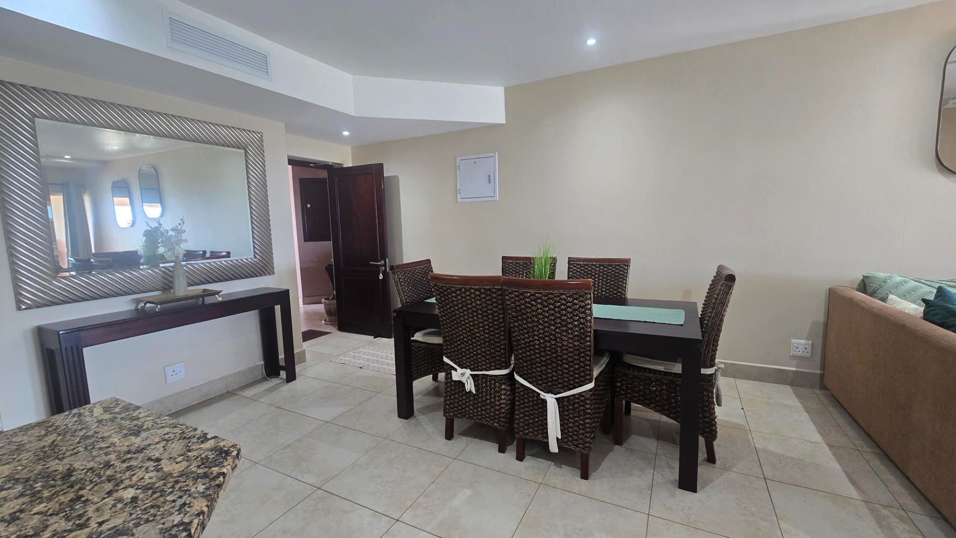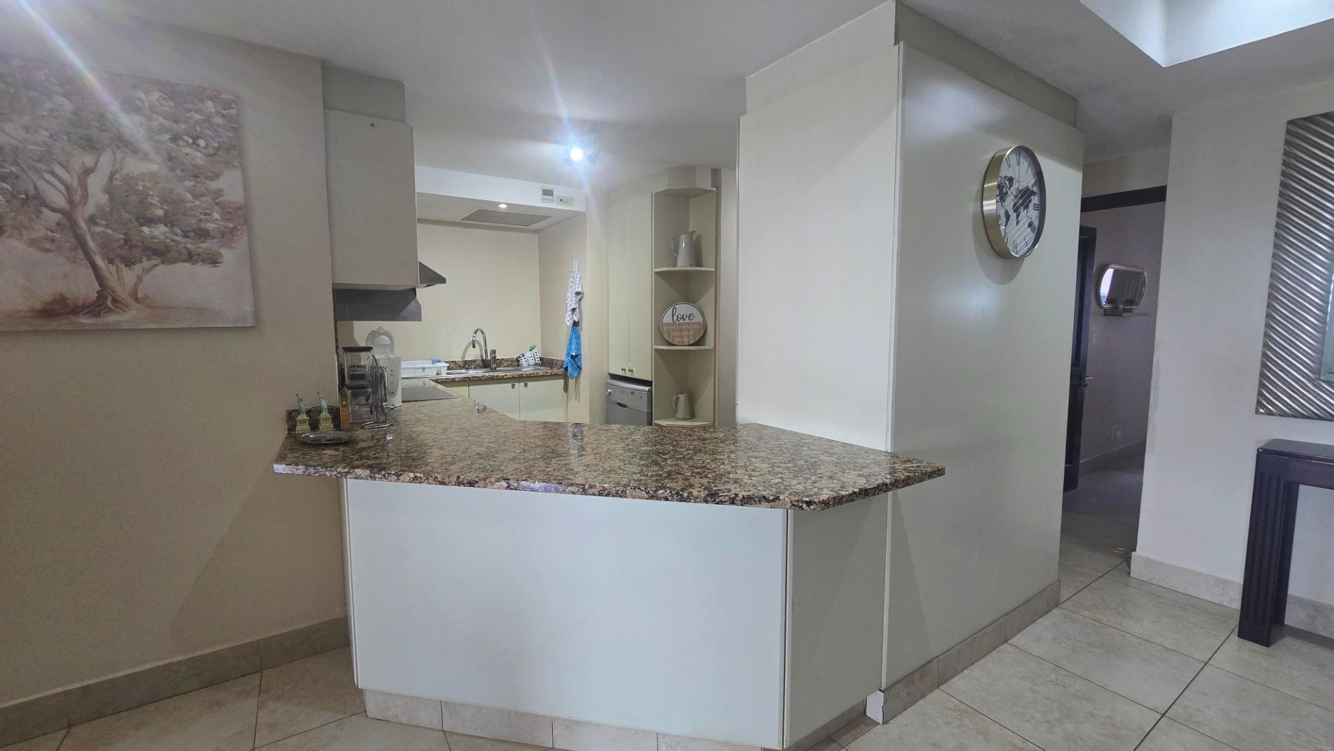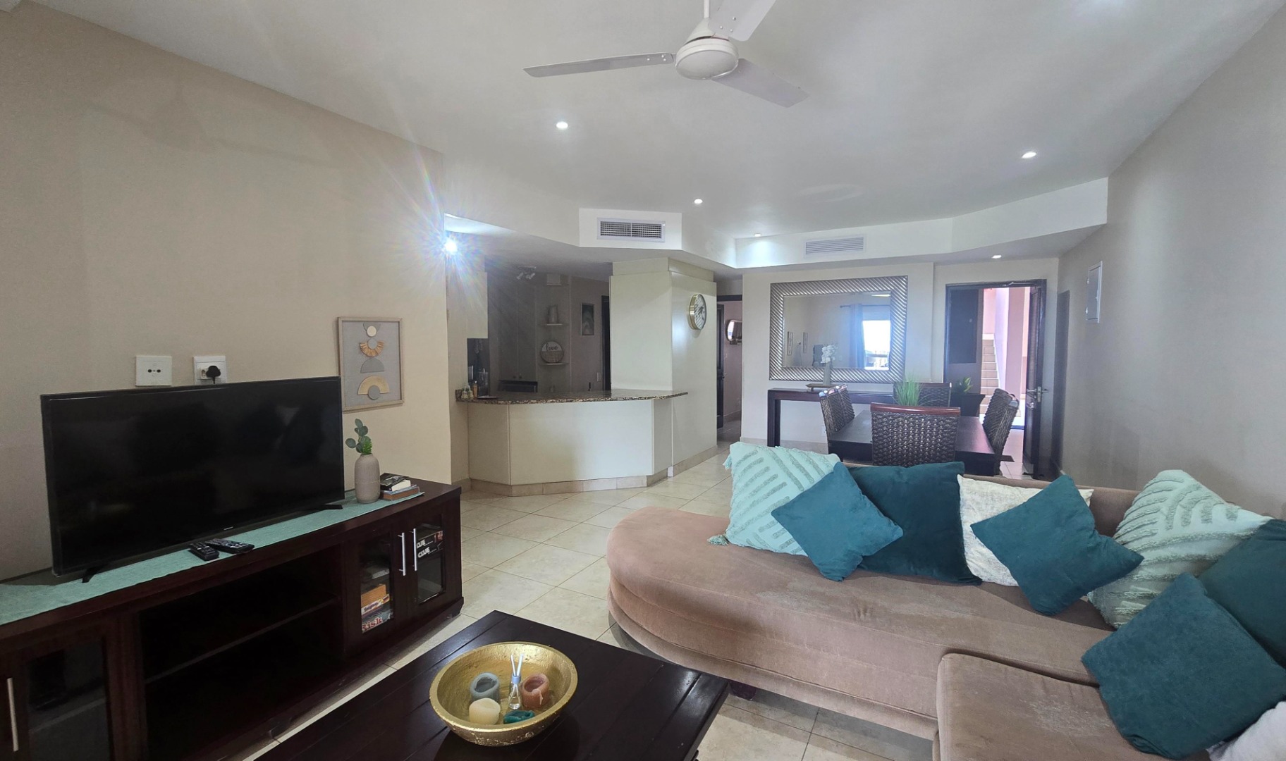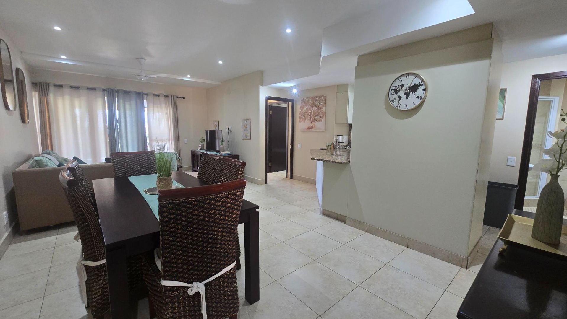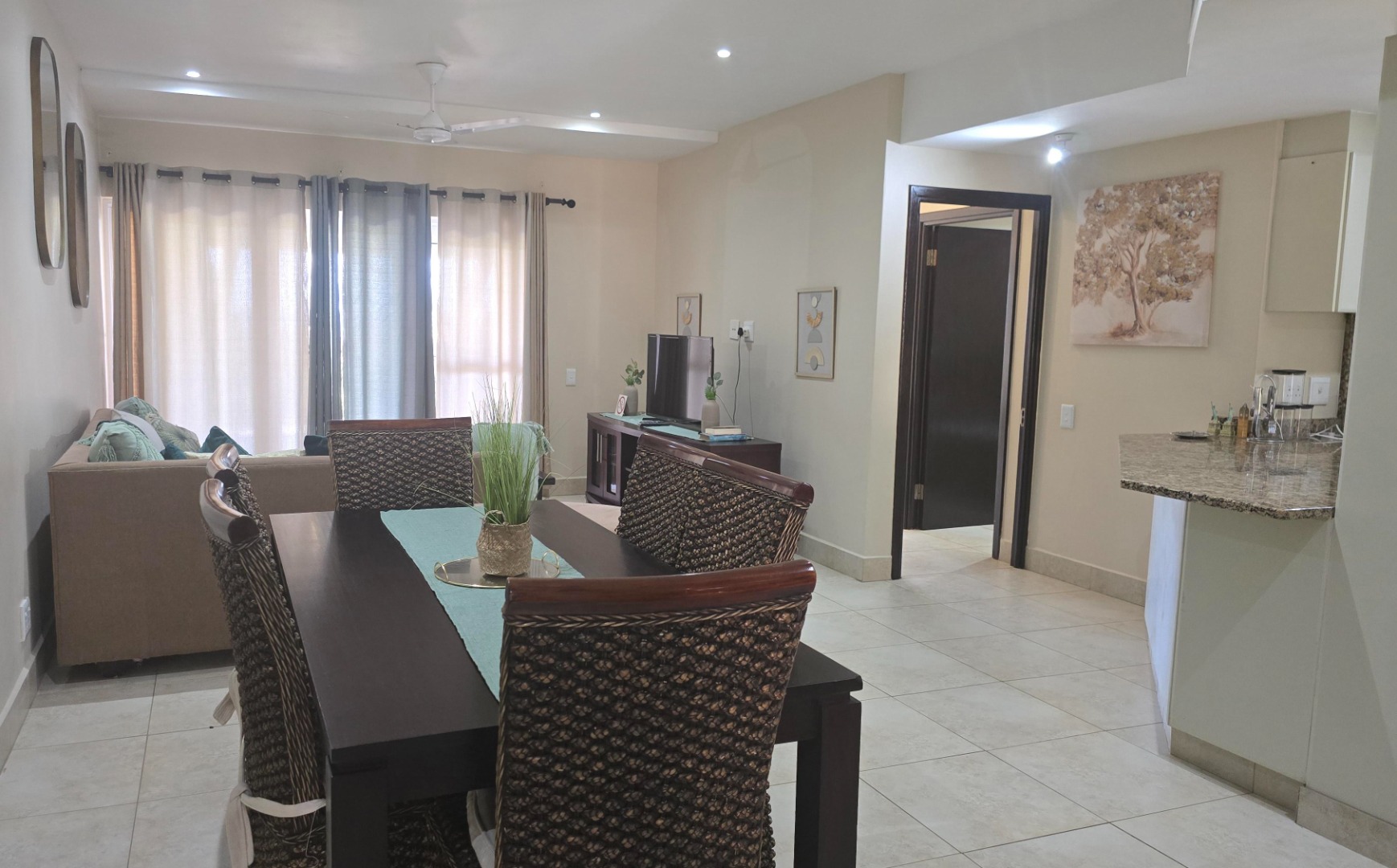 Discover comfortable coastal living in this inviting 3-bedroom, 2-bathroom rental property located in a secure gated community in Shelly Beach, Margate. This residence offers a spacious 125 sqm floor plan, featuring an open-plan living and dining area that flows seamlessly, enhanced by tiled flooring, modern recessed lighting, and ceiling fans for year-round comfort. The well-appointed kitchen boasts granite countertops, providing a functional and stylish space for daily living.