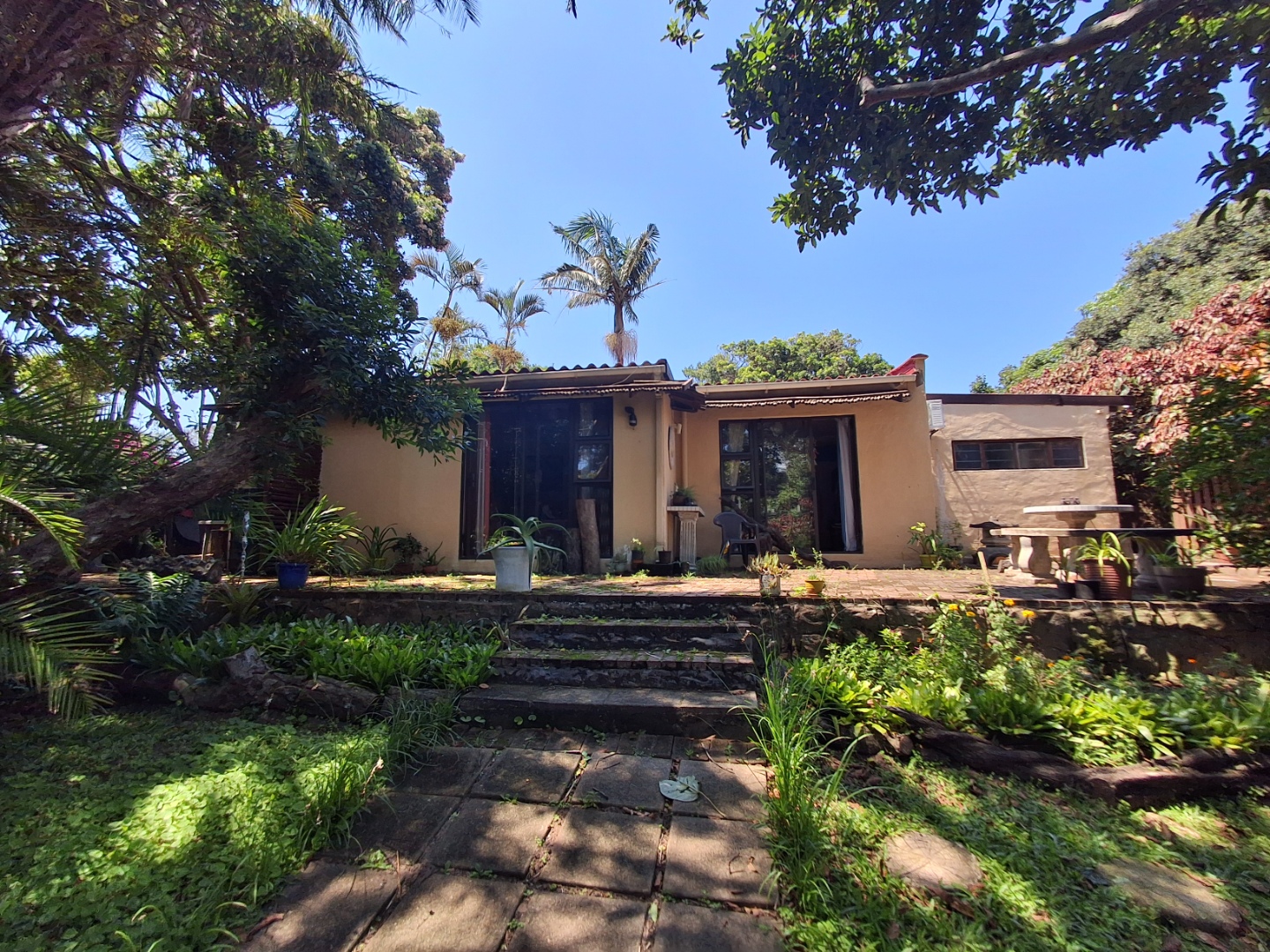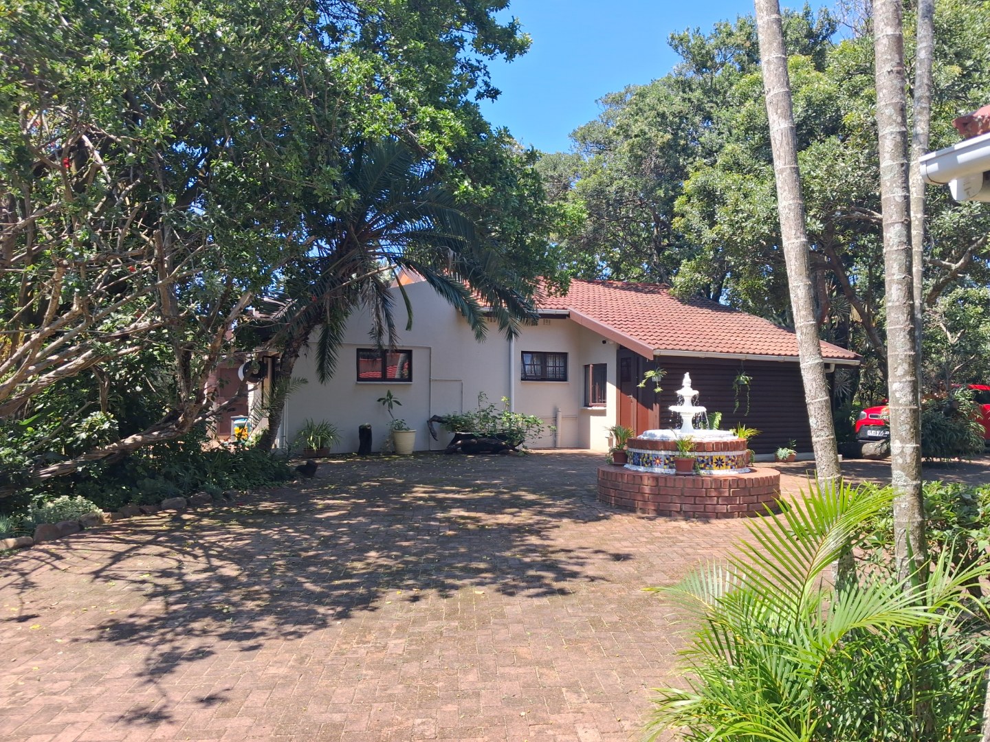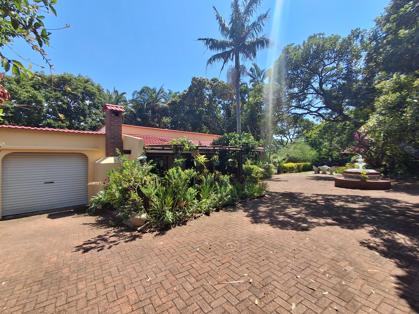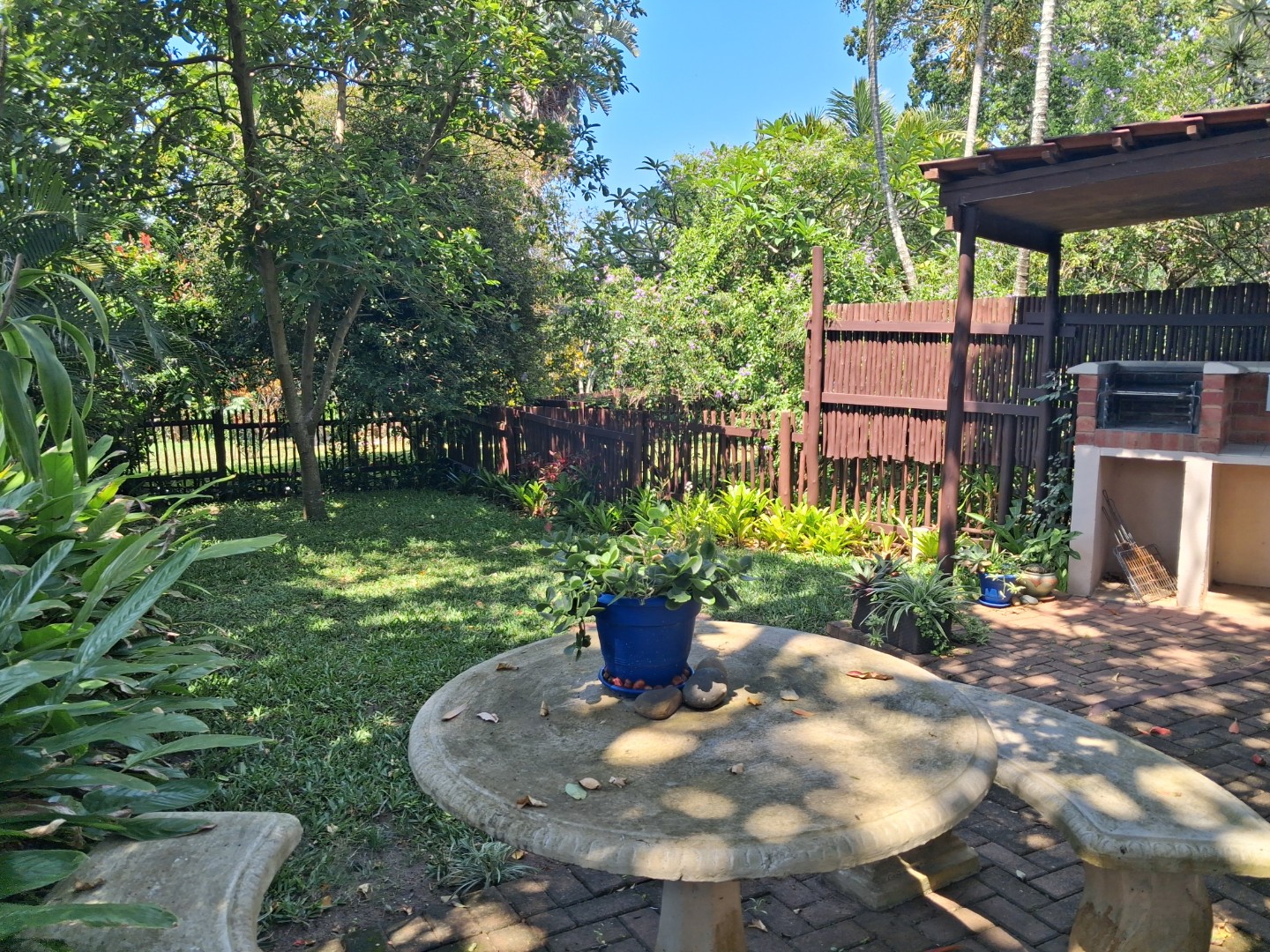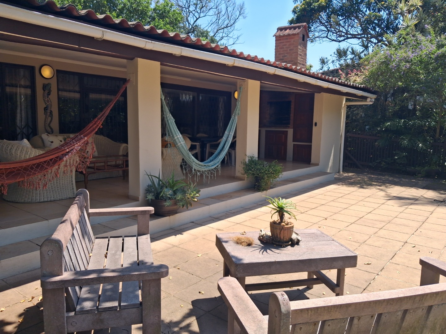 Outdoor living is a highlight, with a large, inviting tiled patio perfect for relaxation and social gatherings, as depicted in the photos. The mature, lush garden, complete with diverse trees and flowering plants, creates a private natural setting. Enjoy sunny days by the swimming pool or host a braai with the built-in braai facility. Ample paving, a single garage, and six additional parking spaces cater to all vehicle needs. Pets are welcome, making it an ideal family retreat.