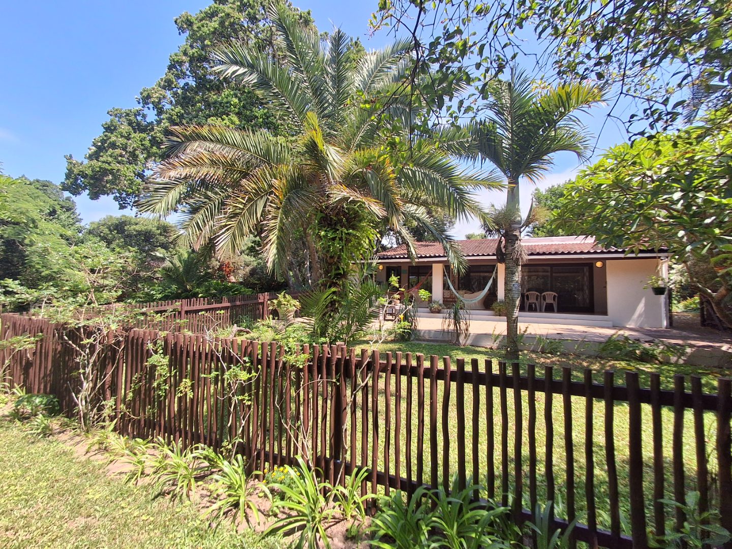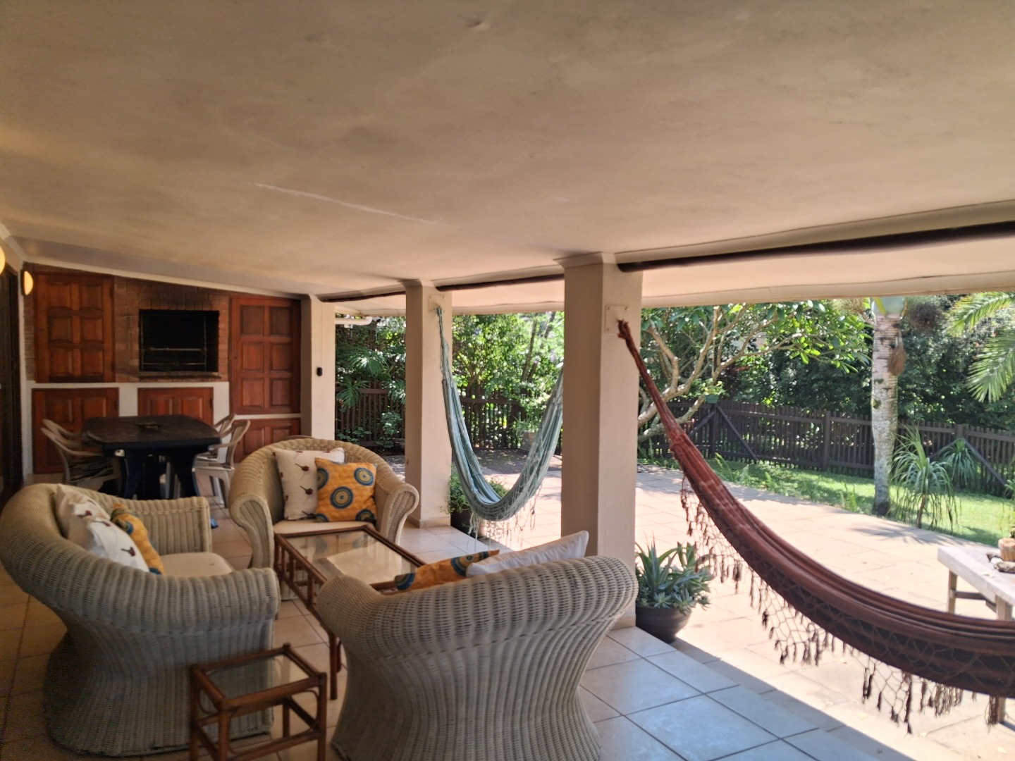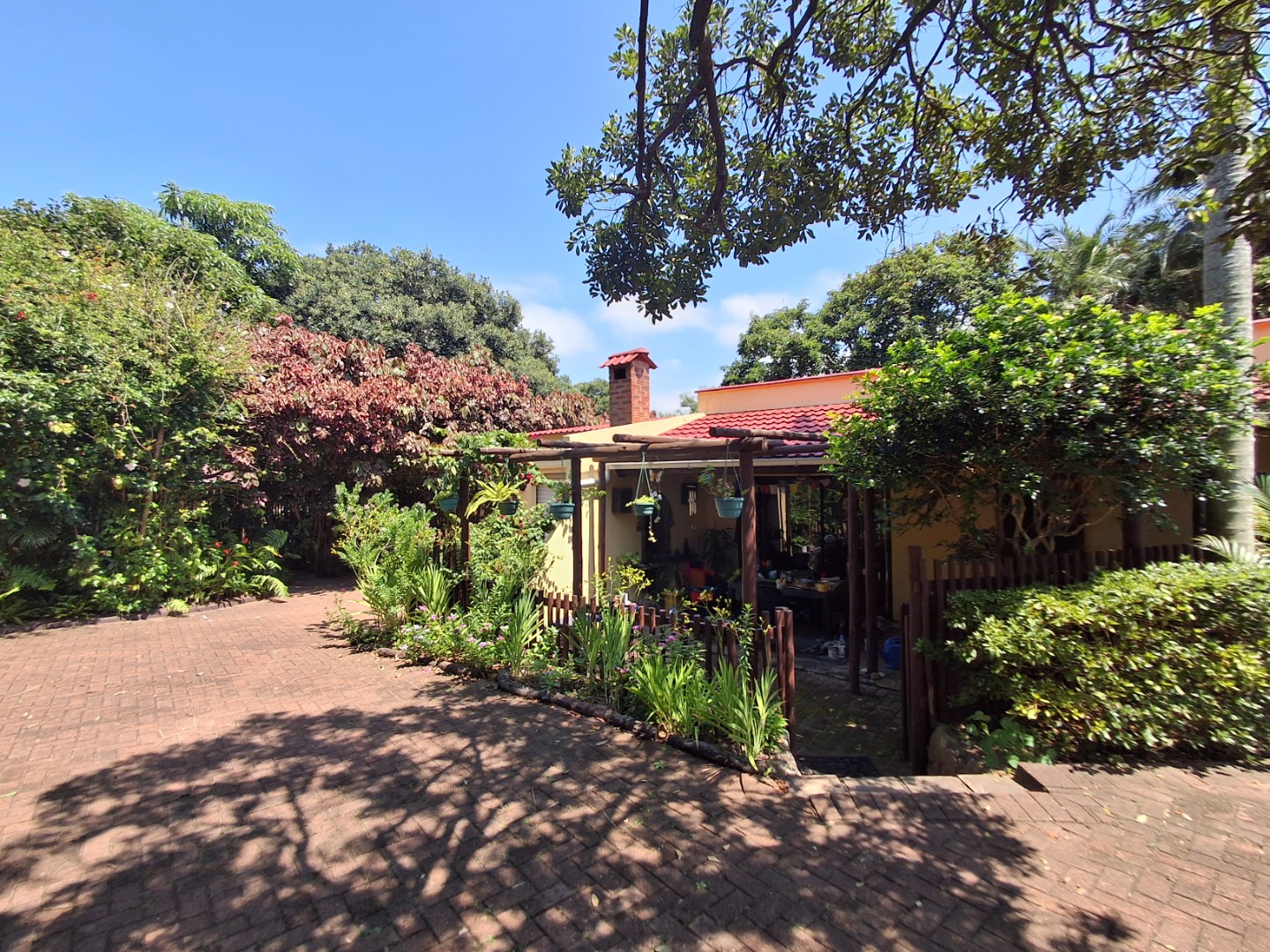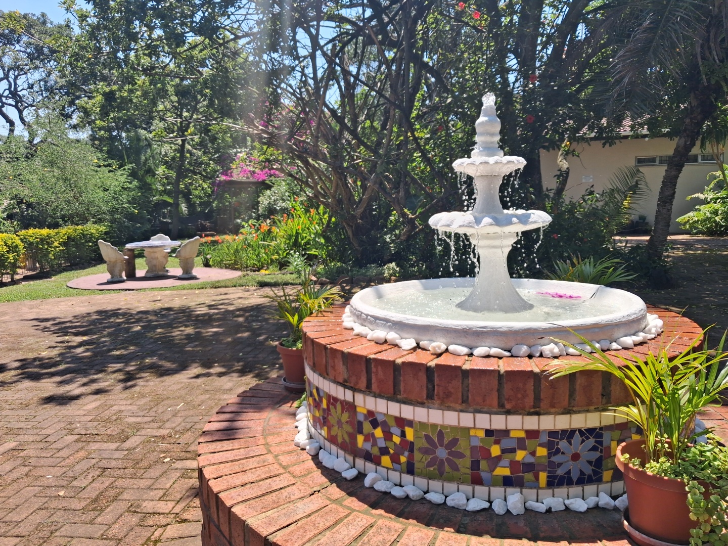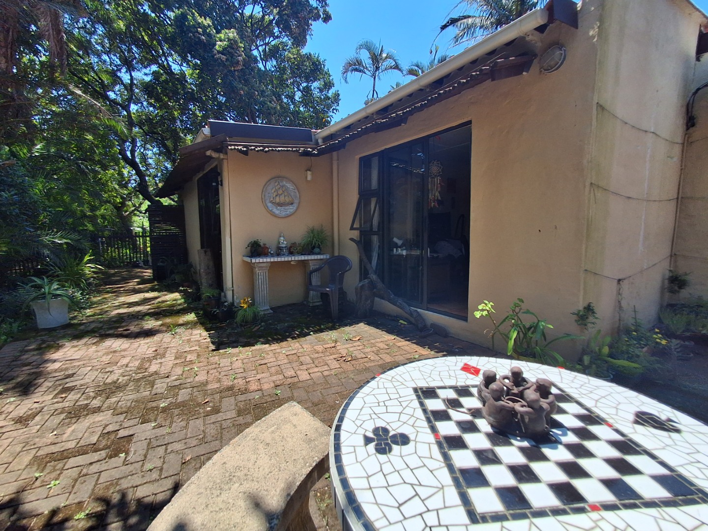 Outdoor living is a highlight, with a large, inviting tiled patio perfect for relaxation and social gatherings, as depicted in the photos. The mature, lush garden, complete with diverse trees and flowering plants, creates a private natural setting. Enjoy sunny days by the swimming pool or host a braai with the built-in braai facility. Ample paving, a single garage, and six additional parking spaces cater to all vehicle needs. Pets are welcome, making it an ideal family retreat.