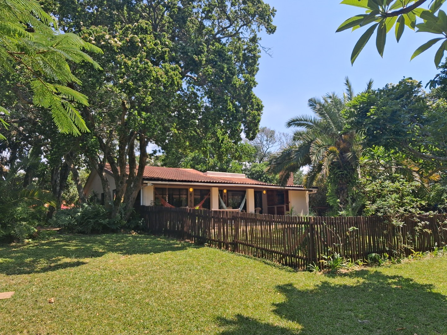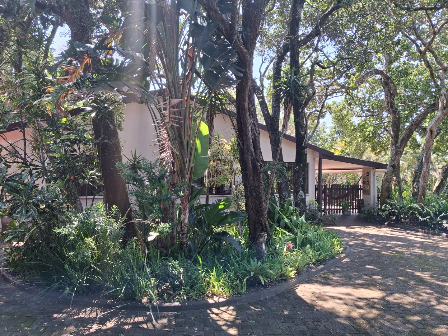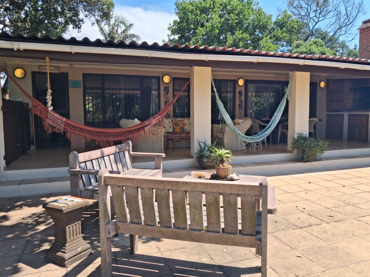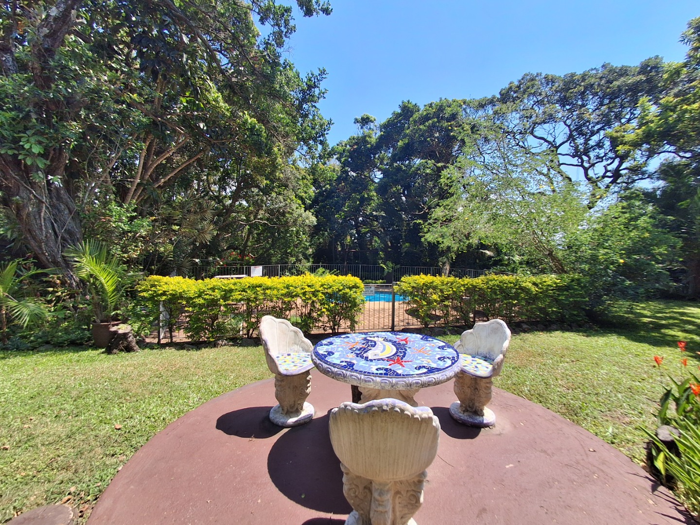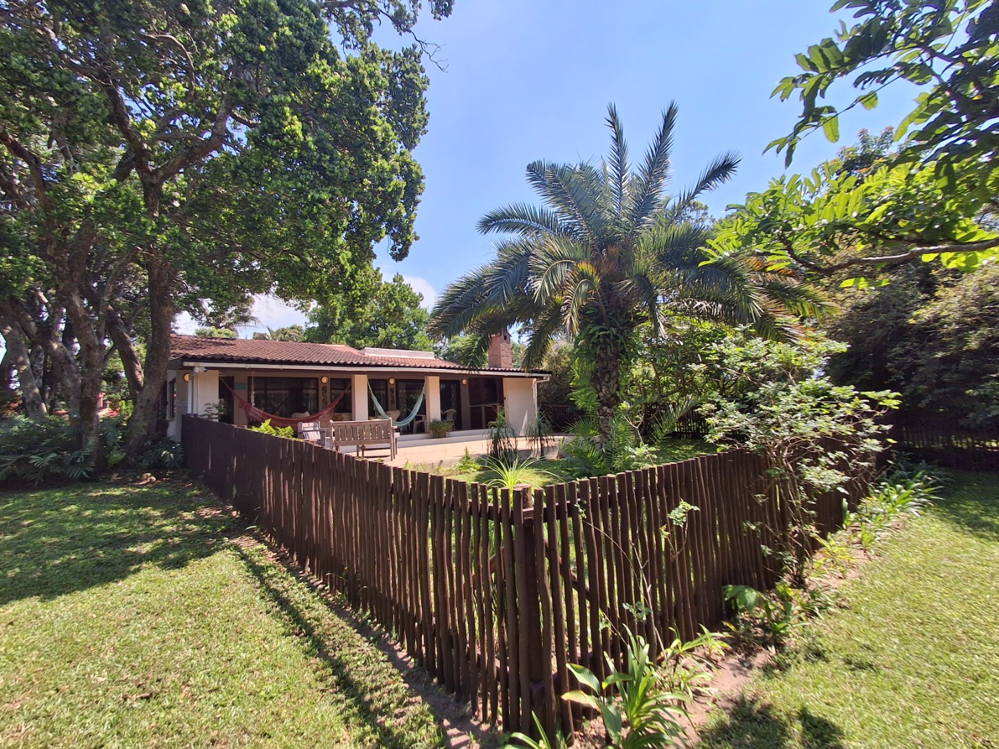 Outdoor living is a highlight, with a large, inviting tiled patio perfect for relaxation and social gatherings, as depicted in the photos. The mature, lush garden, complete with diverse trees and flowering plants, creates a private natural setting. Enjoy sunny days by the swimming pool or host a braai with the built-in braai facility. Ample paving, a single garage, and six additional parking spaces cater to all vehicle needs. Pets are welcome, making it an ideal family retreat.