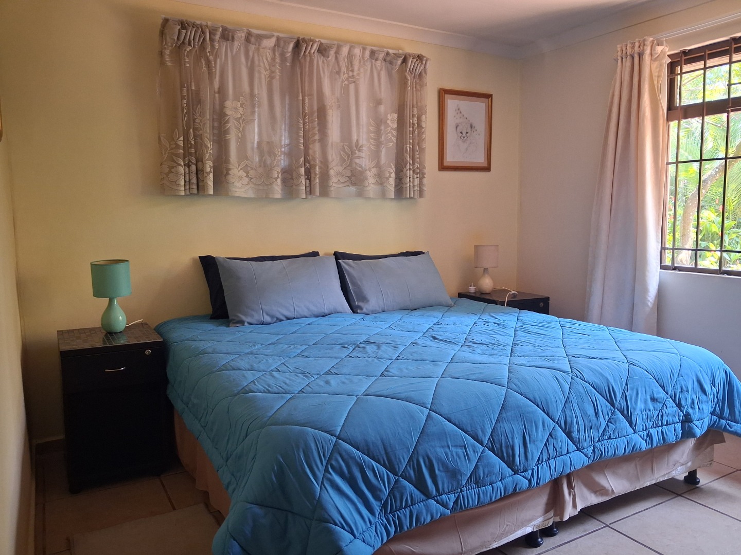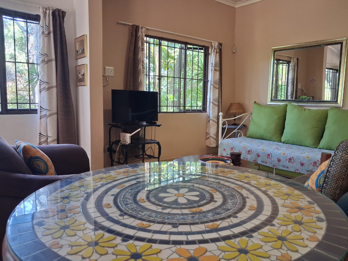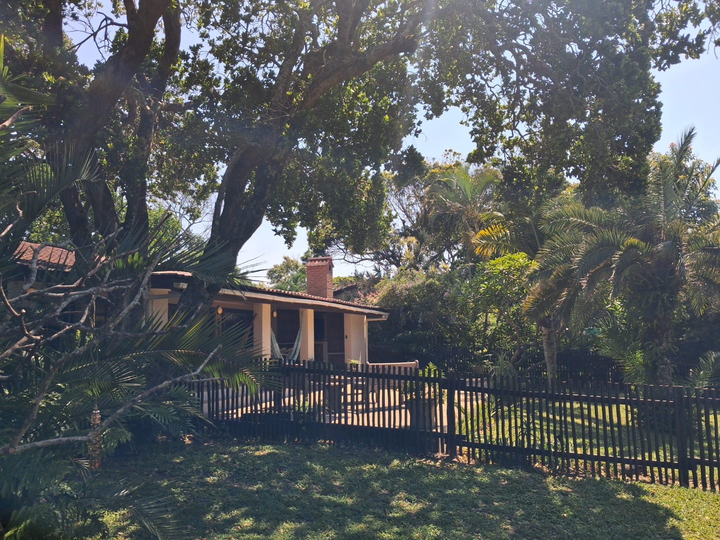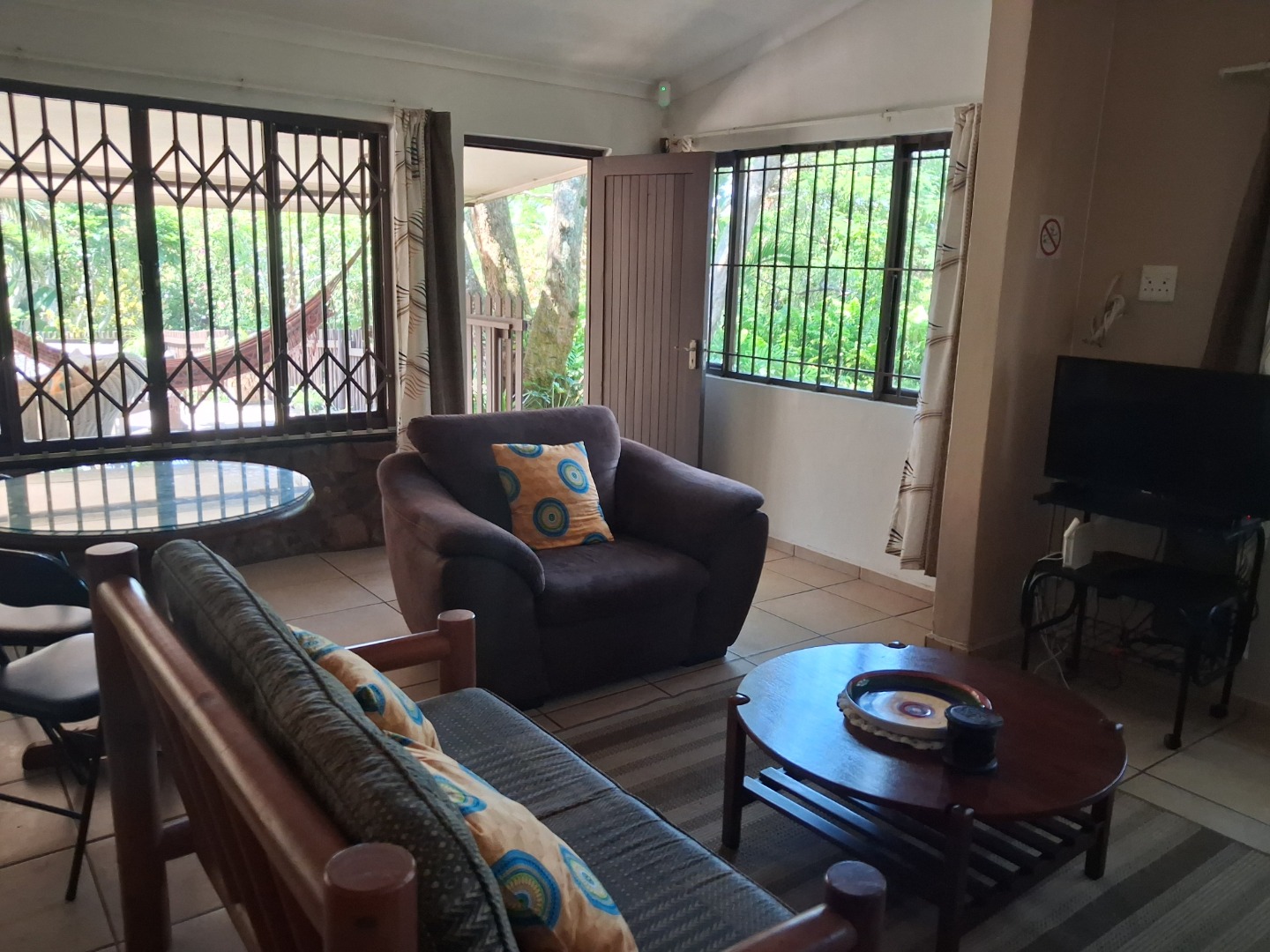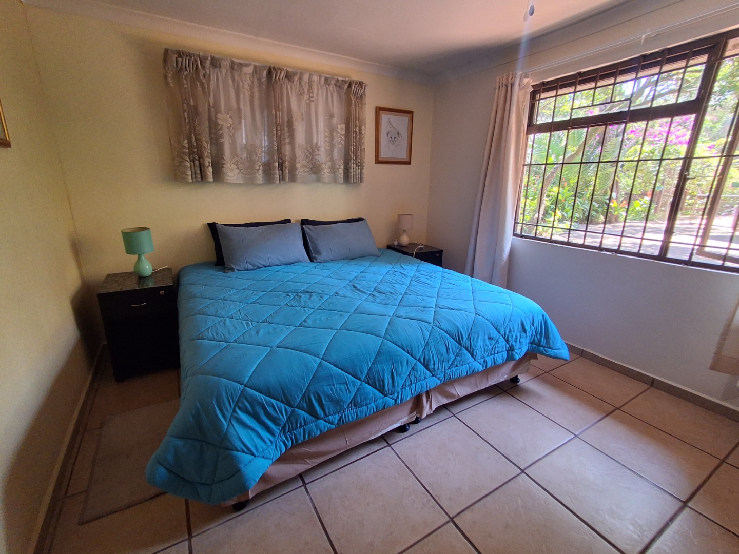 Outdoor living is a highlight, with a large, inviting tiled patio perfect for relaxation and social gatherings, as depicted in the photos. The mature, lush garden, complete with diverse trees and flowering plants, creates a private natural setting. Enjoy sunny days by the swimming pool or host a braai with the built-in braai facility. Ample paving, a single garage, and six additional parking spaces cater to all vehicle needs. Pets are welcome, making it an ideal family retreat.