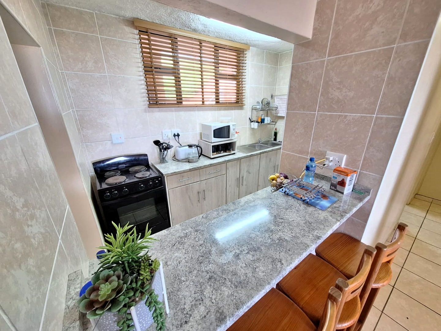 Beautiful kitchen with a breakfast nook. The open plan concept allows for uninterrupted entertainment area, with the lounge opening onto the covered patio. From here you will be spoiled with the most beautiful sea views.