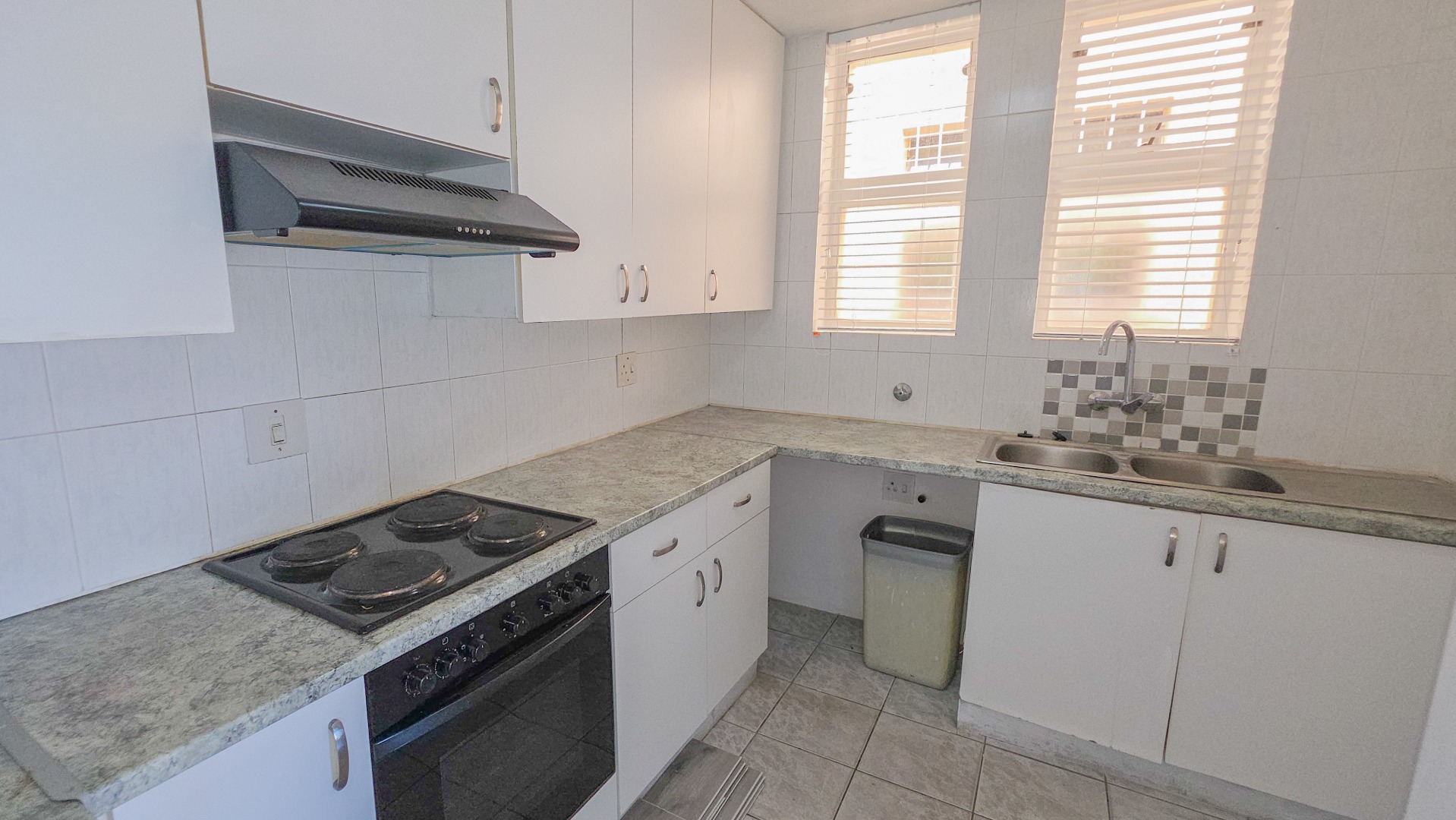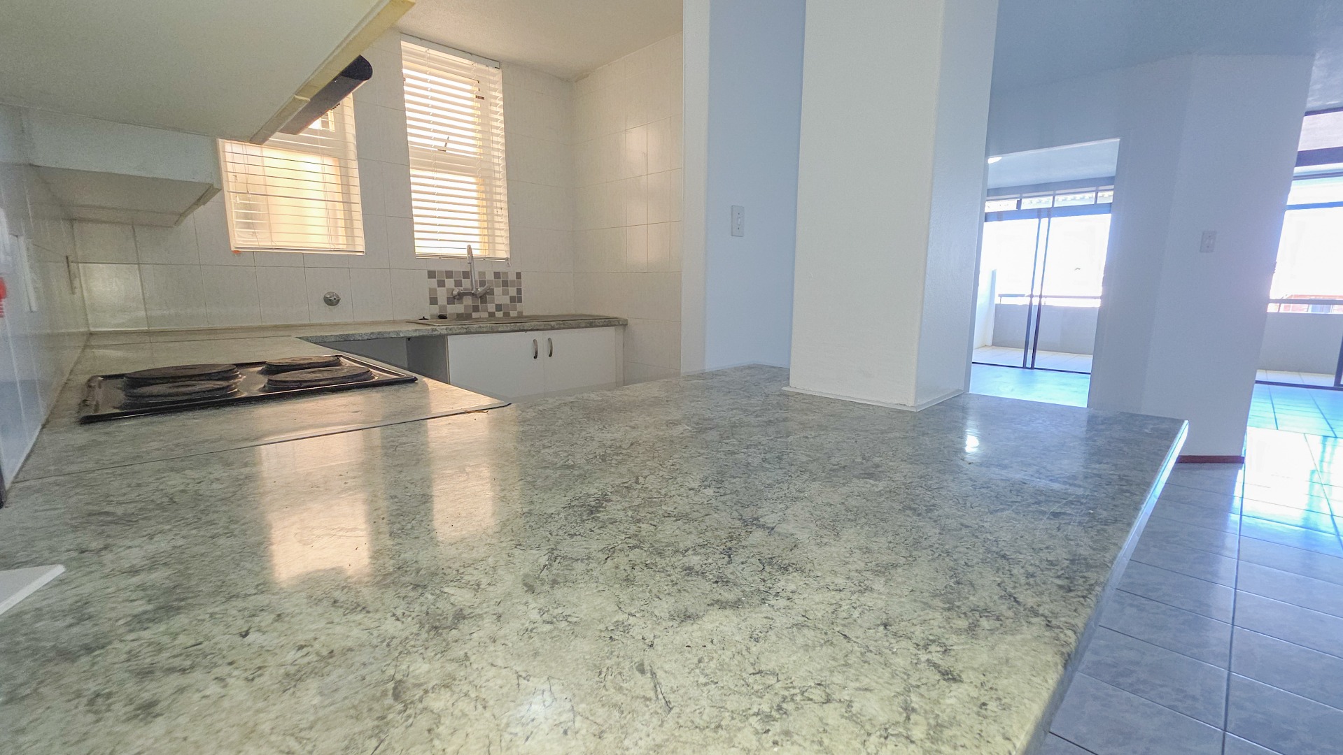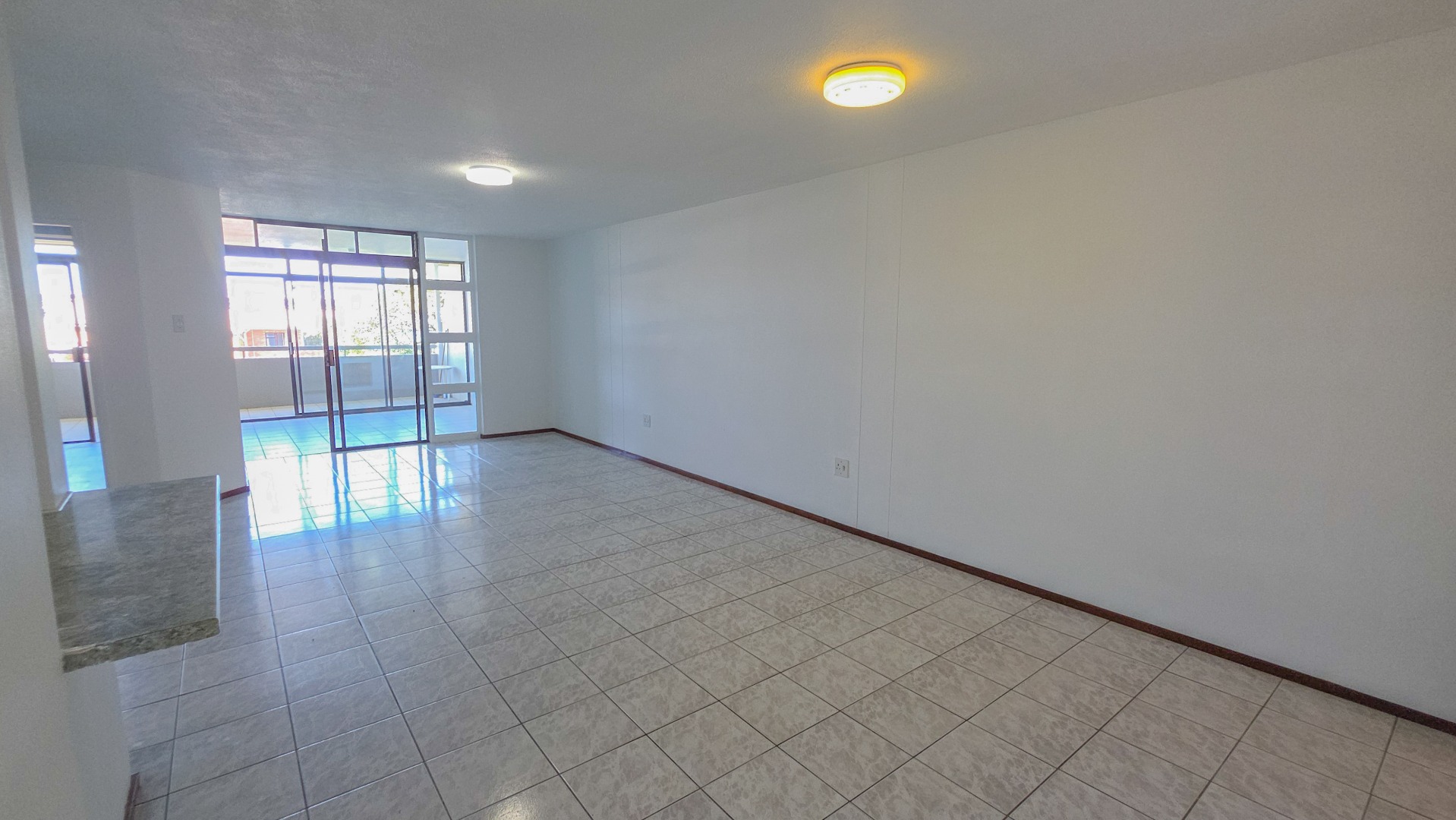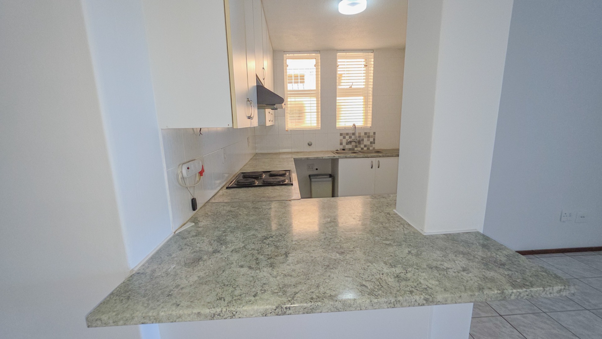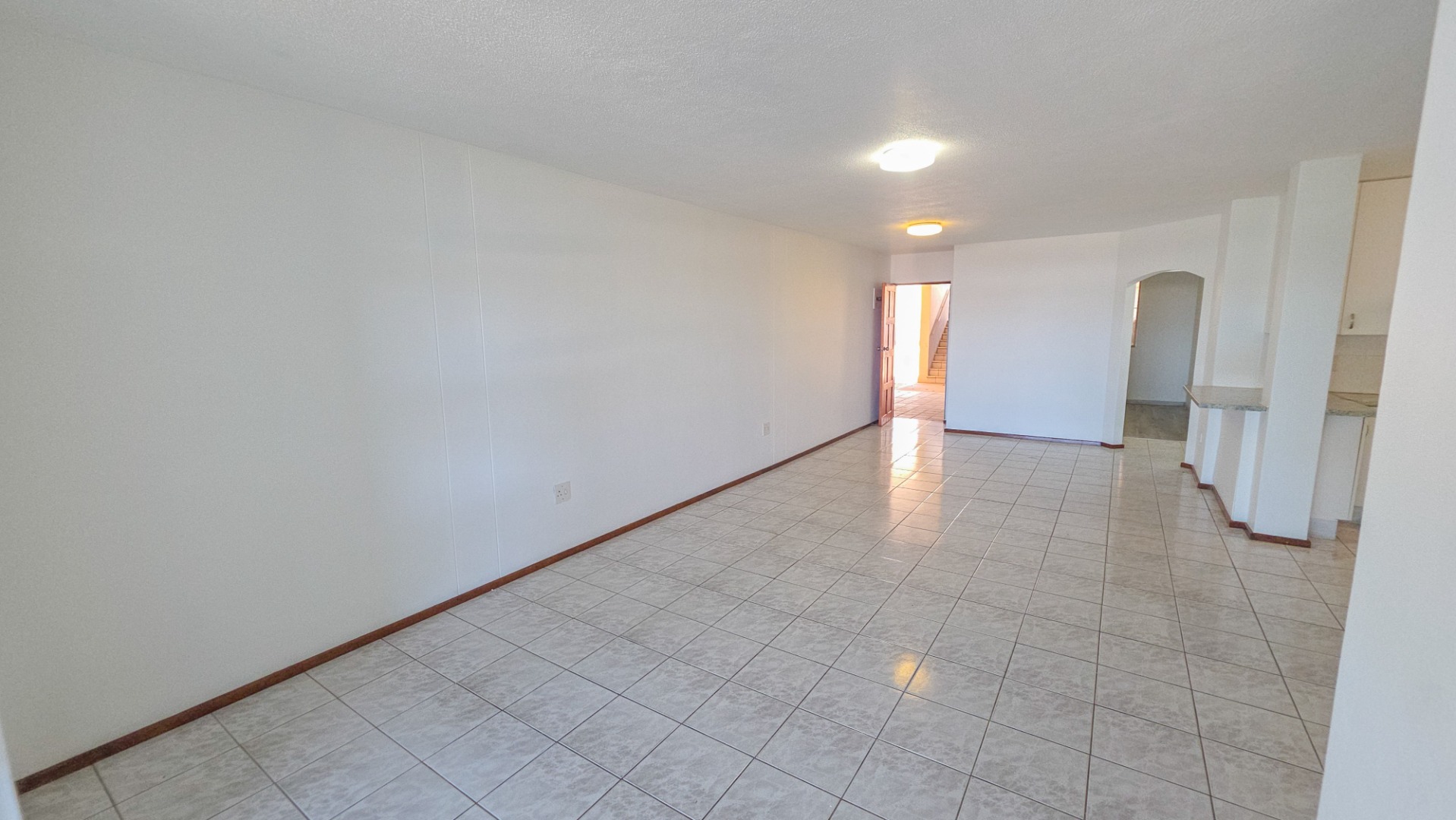 The open plan living area connects the lounge, dining space, and kitchen into one flowing environment where family time and entertaining come together effortlessly. Light tiled flooring and freshly painted walls enhance the bright interior, while large sliding doors draw in natural light and extend the living space outdoors. The kitchen sits at the center of the home with clean finishes, generous storage, and a breakfast counter suited to both busy mornings and relaxed conversations.