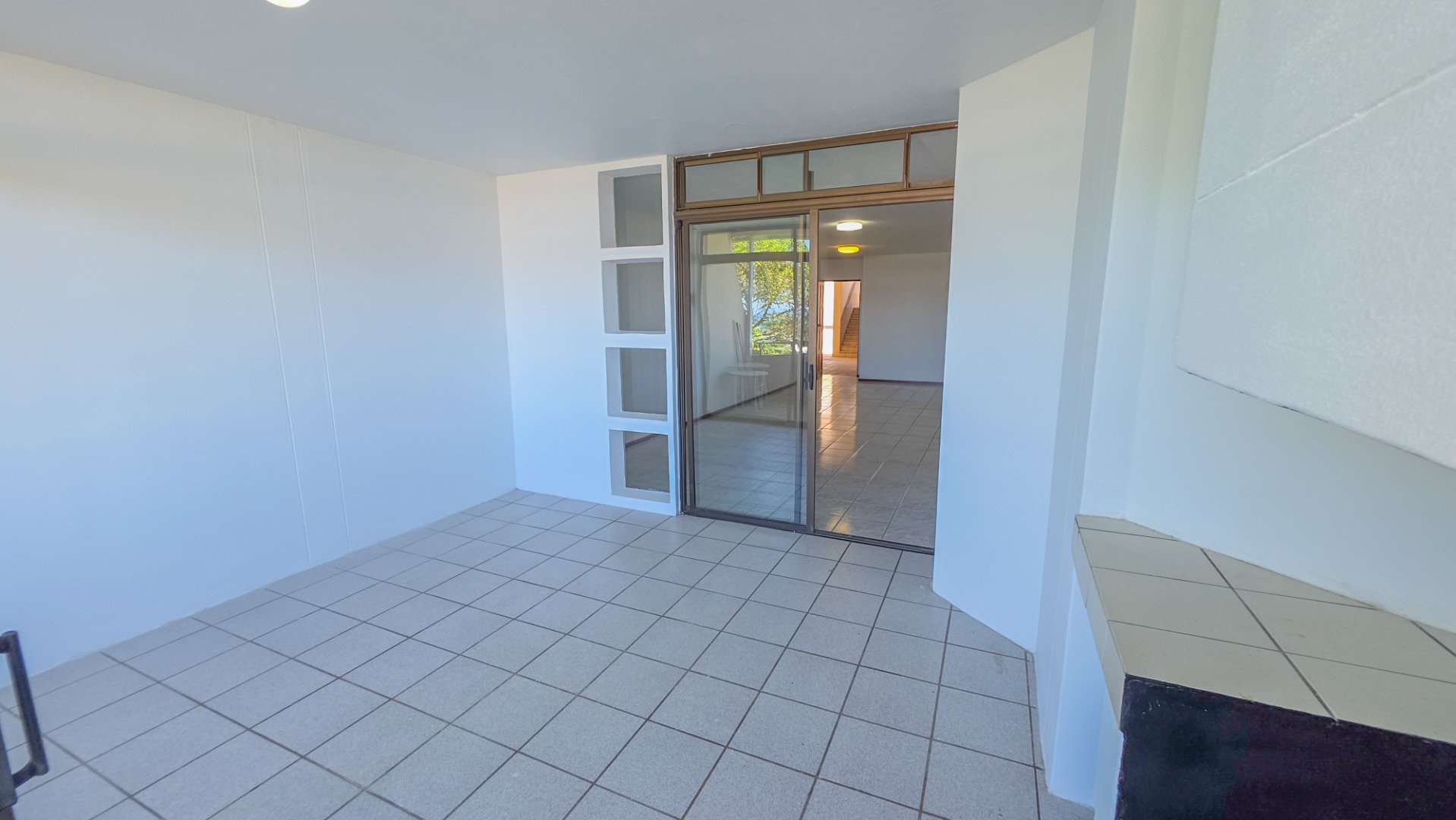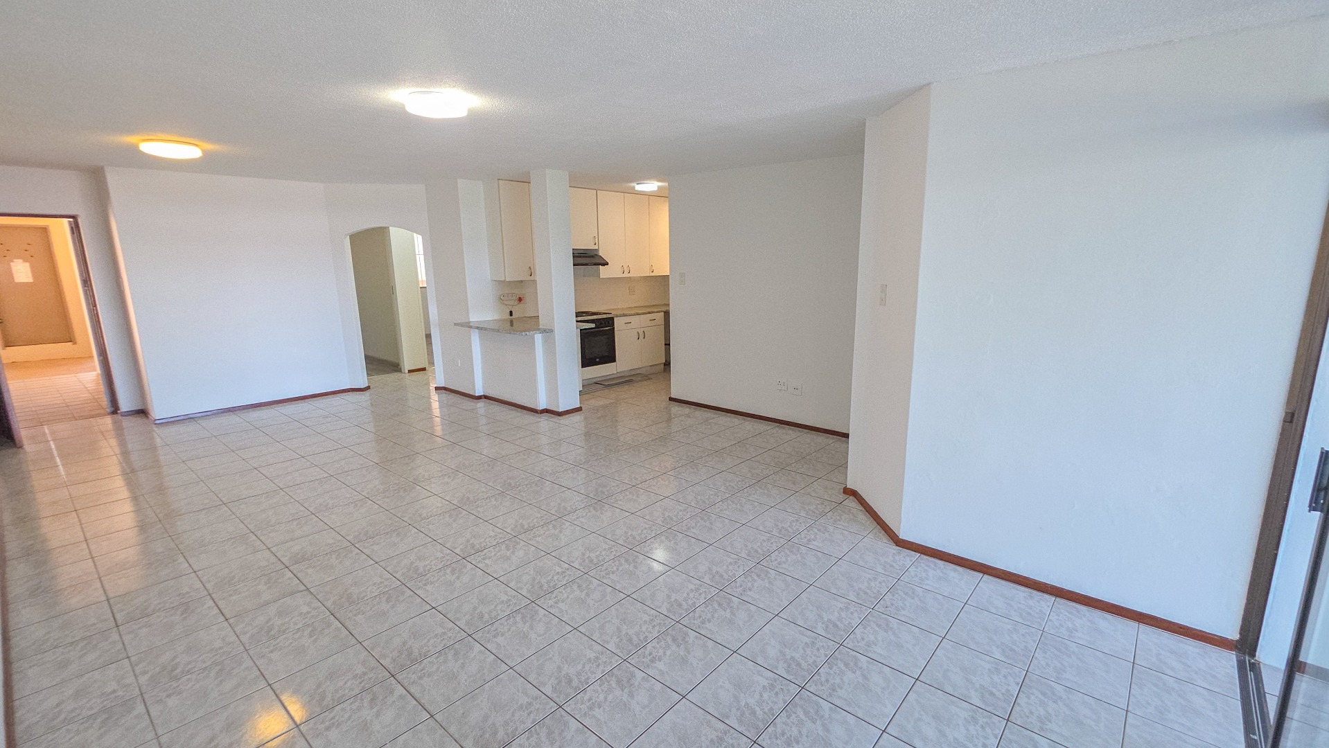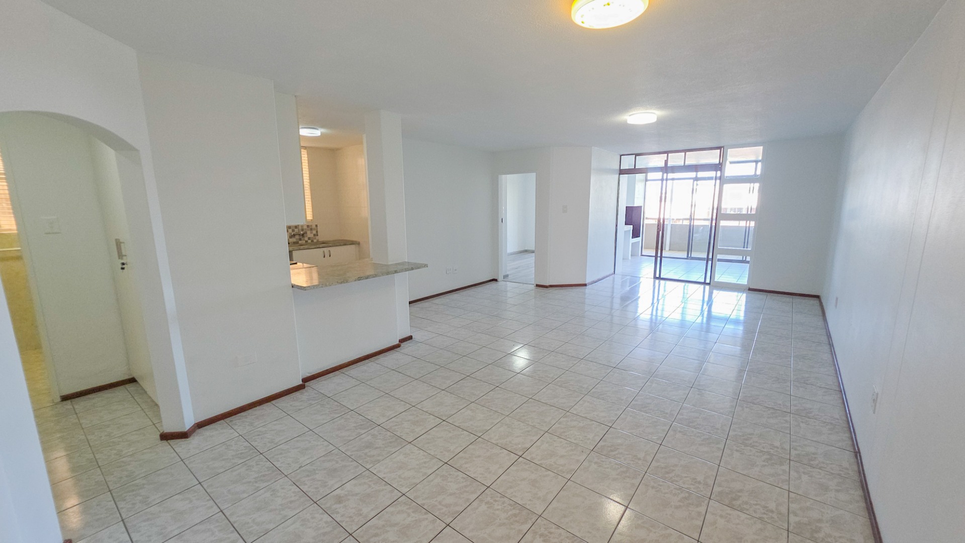 The open plan living area connects the lounge, dining space, and kitchen into one flowing environment where family time and entertaining come together effortlessly. Light tiled flooring and freshly painted walls enhance the bright interior, while large sliding doors draw in natural light and extend the living space outdoors. The kitchen sits at the center of the home with clean finishes, generous storage, and a breakfast counter suited to both busy mornings and relaxed conversations.