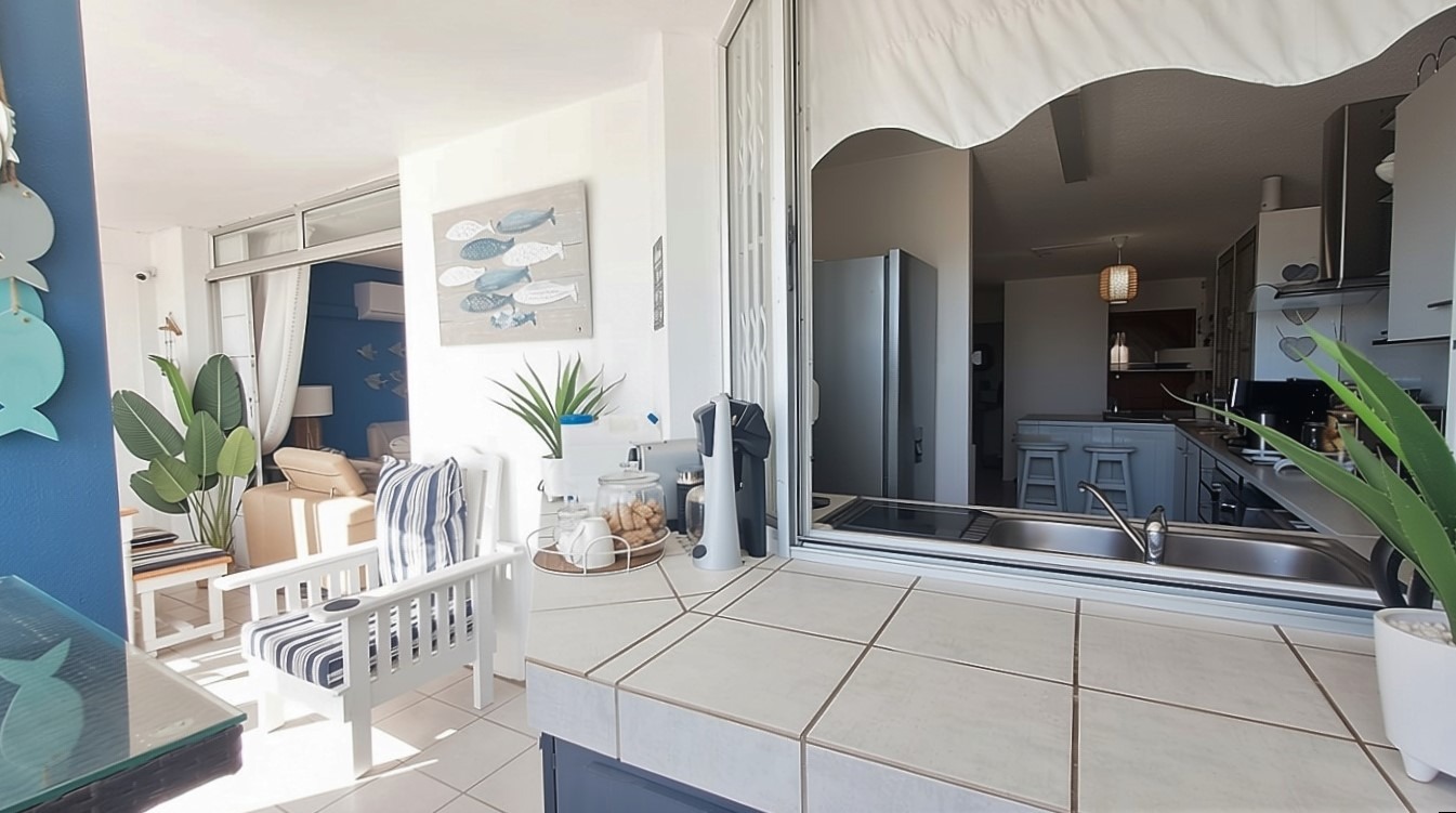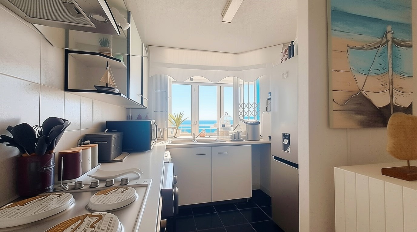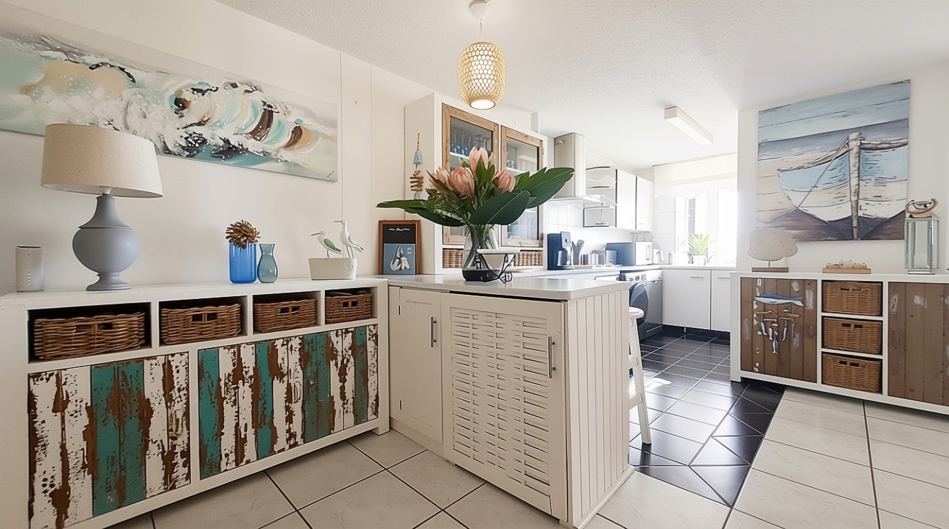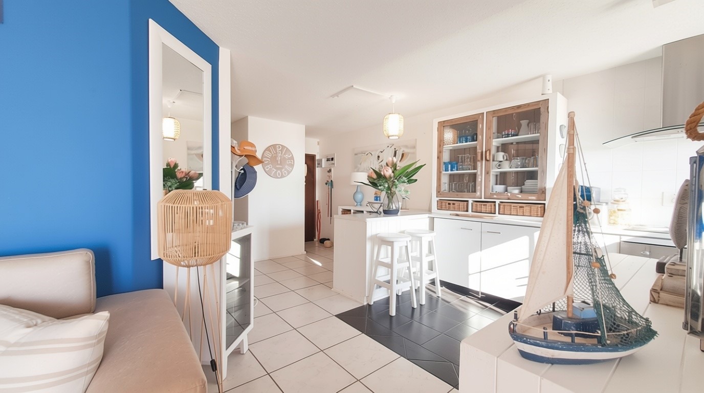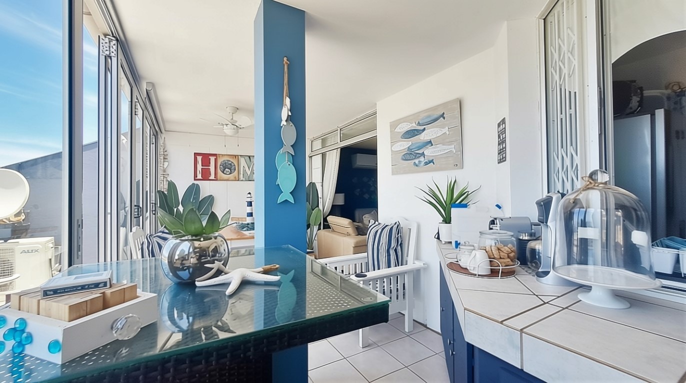 The open-plan layout seamlessly connects the lounge, dining area, and a well-appointed kitchen, creating a bright and airy atmosphere. A distinct nautical theme enhances the coastal ambiance throughout, complemented by abundant natural light. Modern comforts include air conditioning and special doors, ensuring a pleasant environment year-round.
