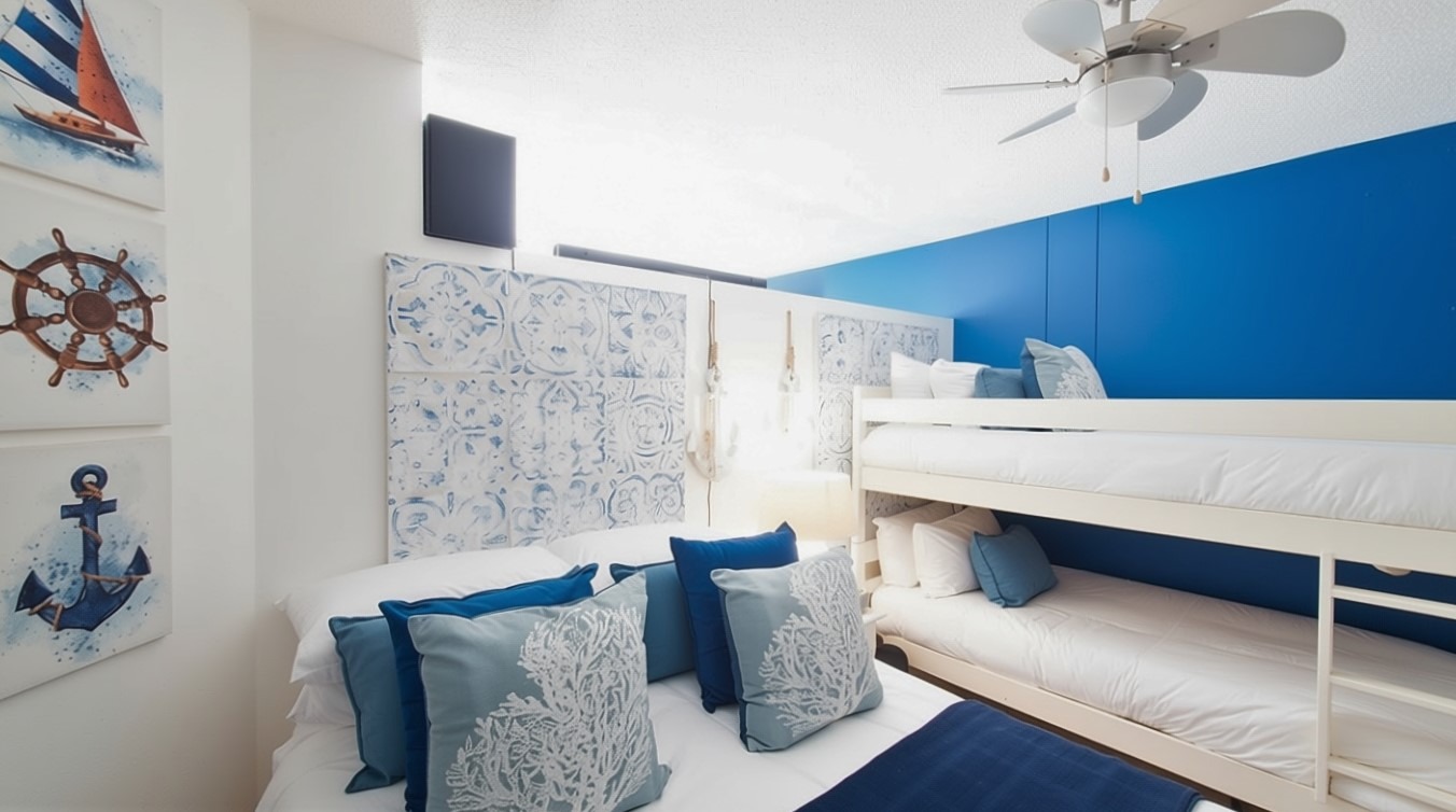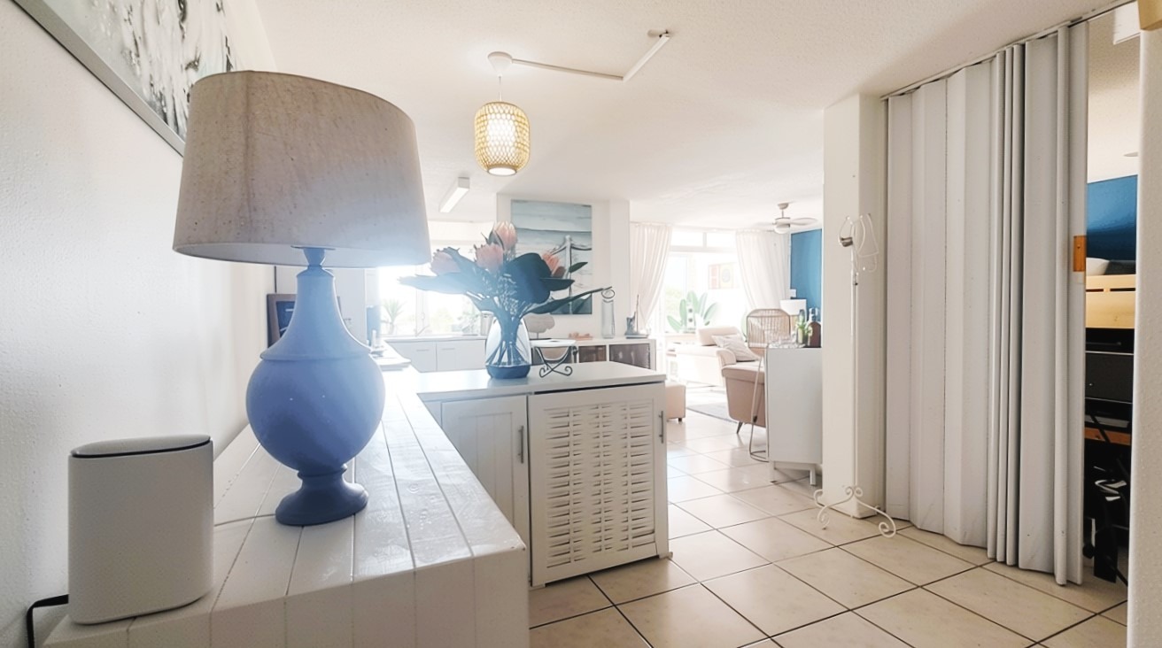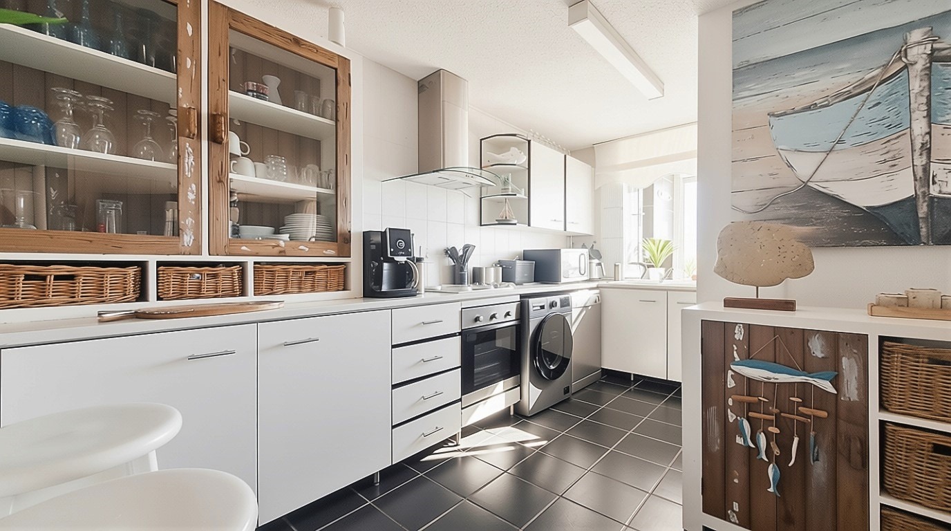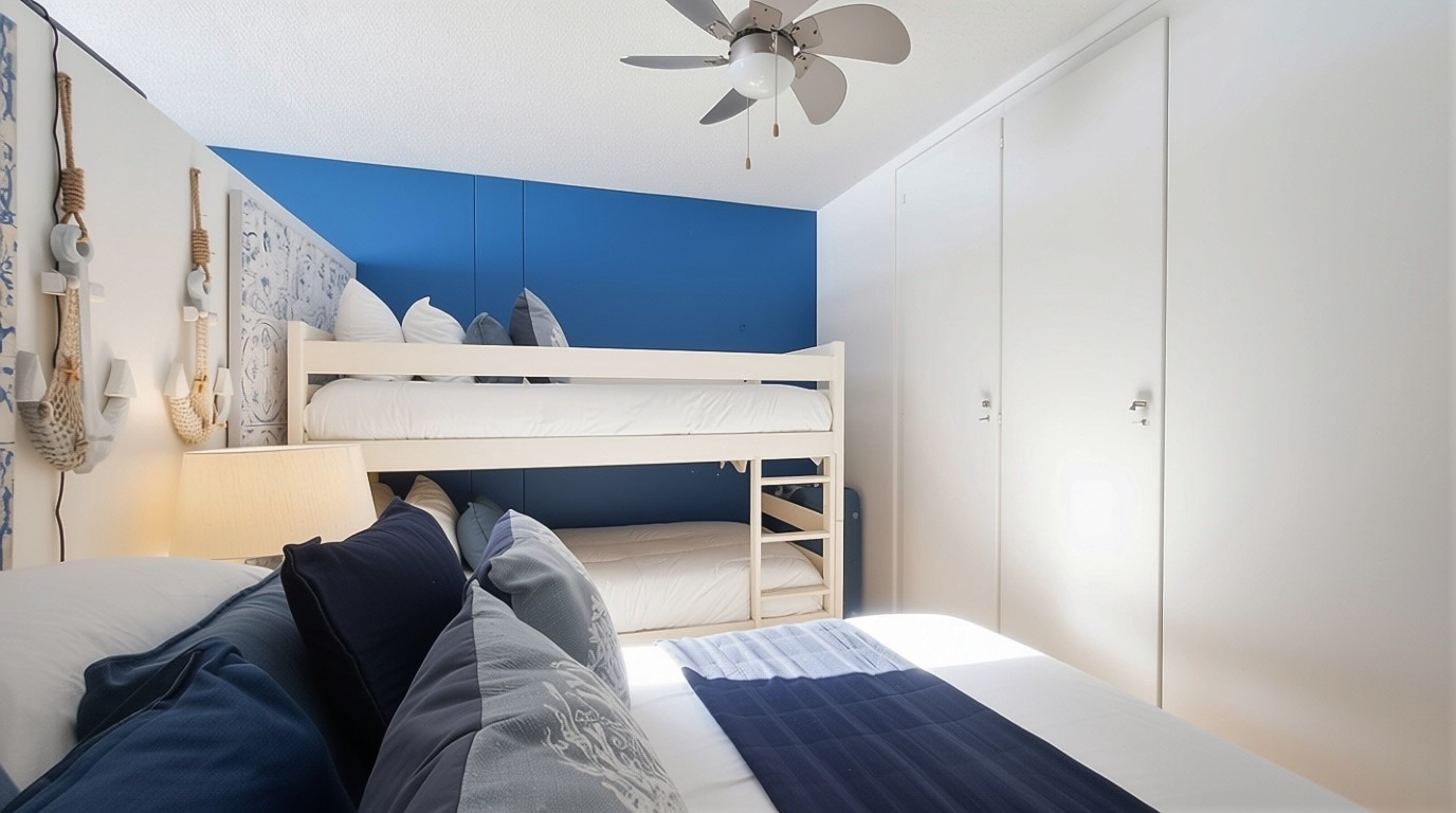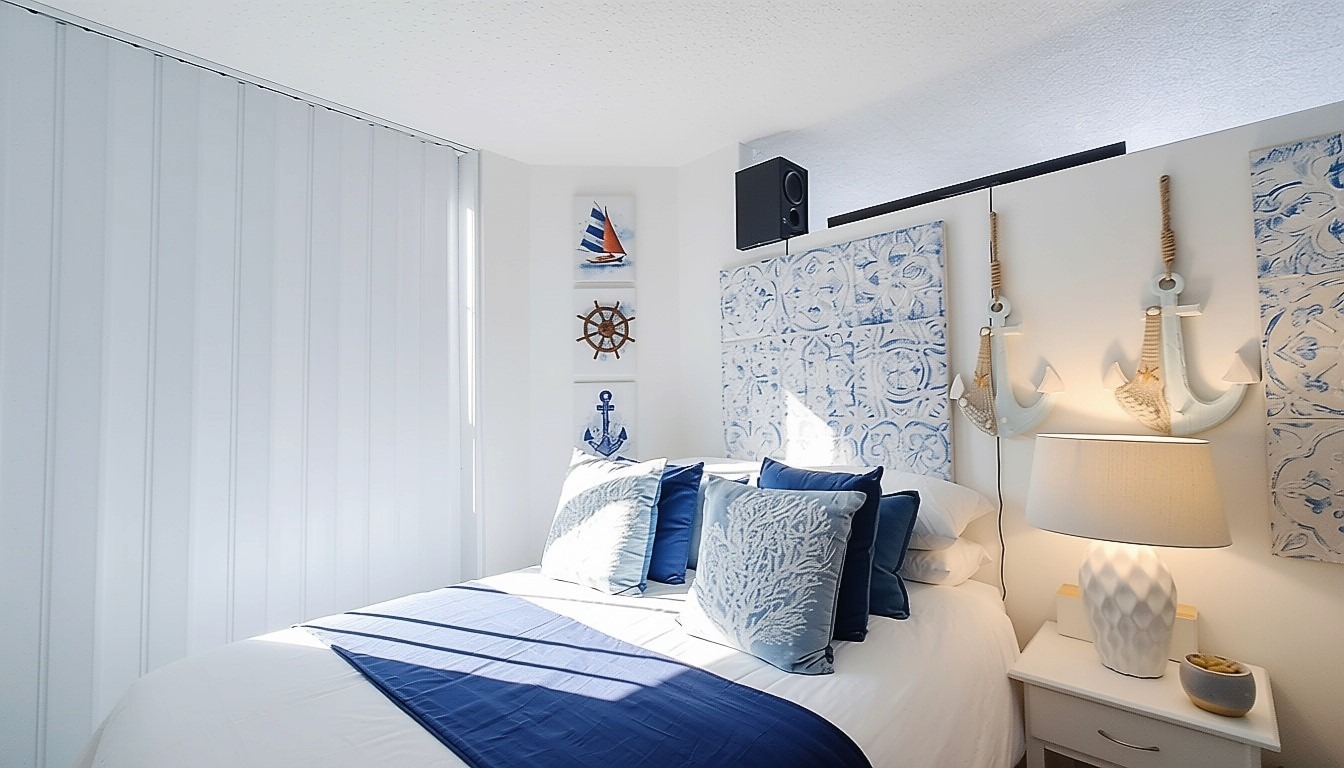 The open-plan layout seamlessly connects the lounge, dining area, and a well-appointed kitchen, creating a bright and airy atmosphere. A distinct nautical theme enhances the coastal ambiance throughout, complemented by abundant natural light. Modern comforts include air conditioning and special doors, ensuring a pleasant environment year-round.