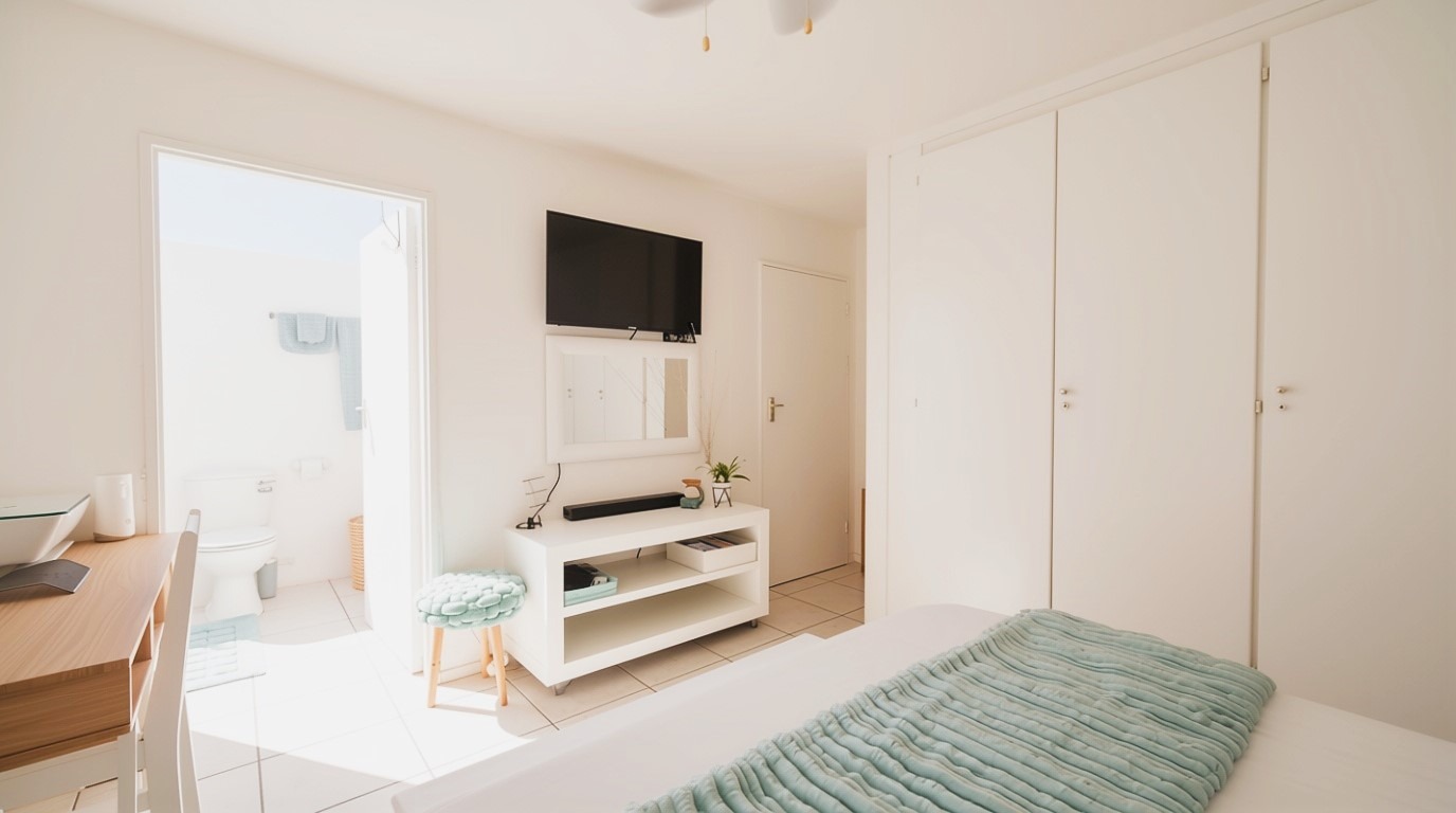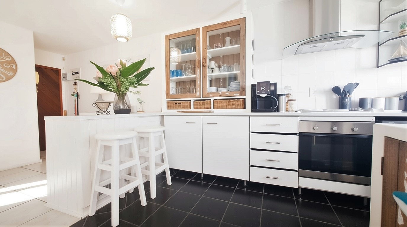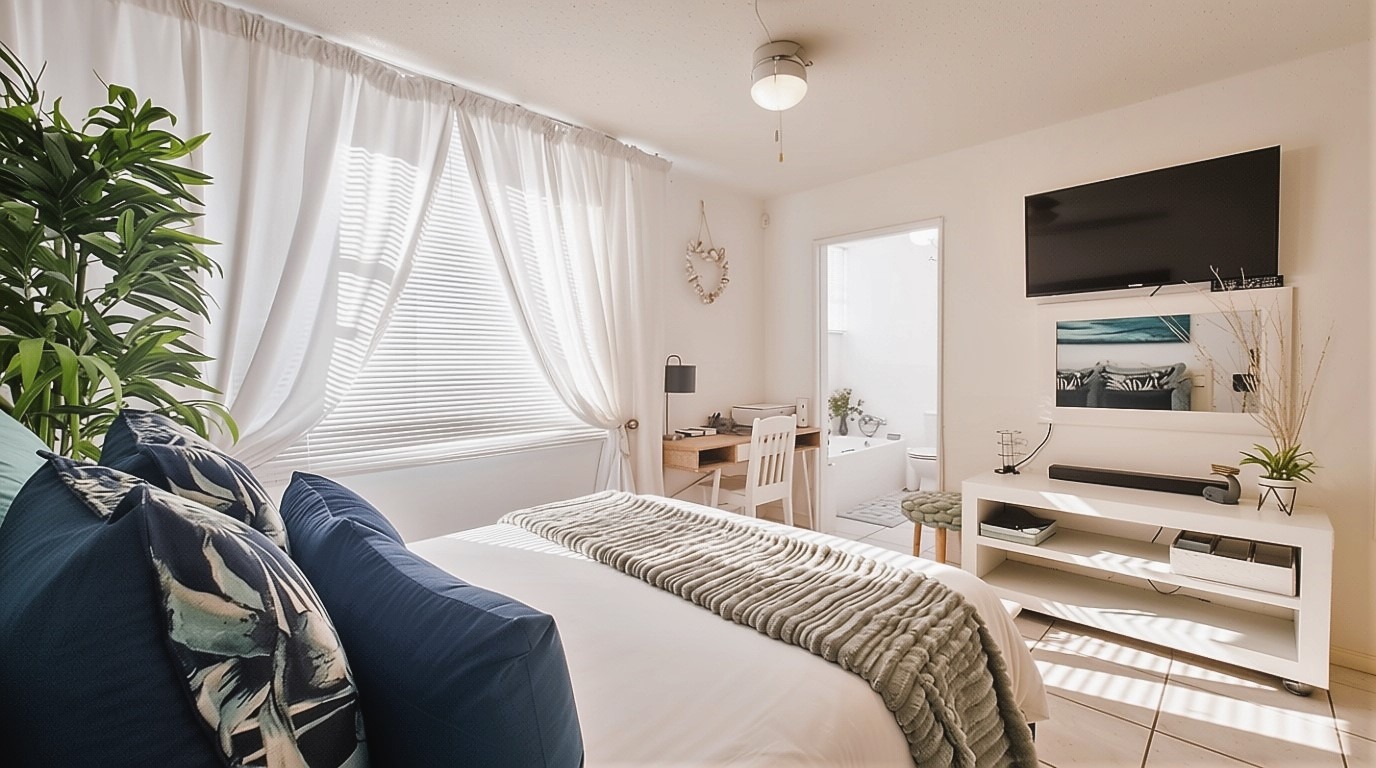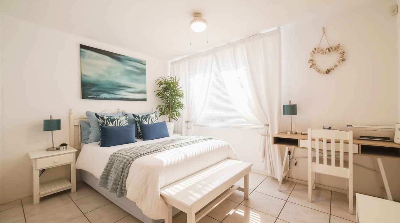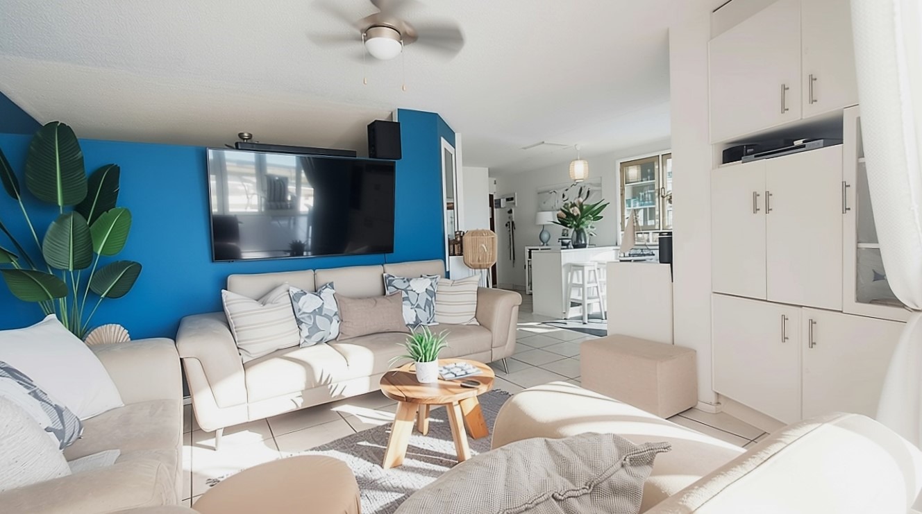 The open-plan layout seamlessly connects the lounge, dining area, and a well-appointed kitchen, creating a bright and airy atmosphere. A distinct nautical theme enhances the coastal ambiance throughout, complemented by abundant natural light. Modern comforts include air conditioning and special doors, ensuring a pleasant environment year-round.