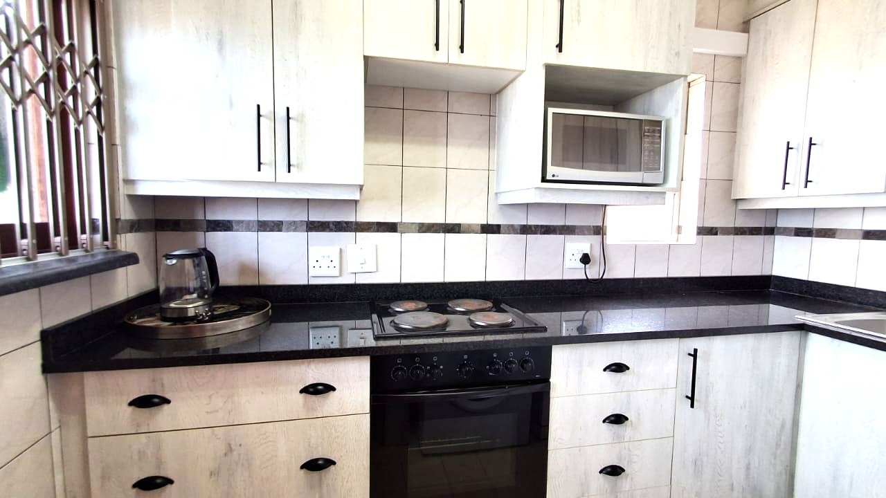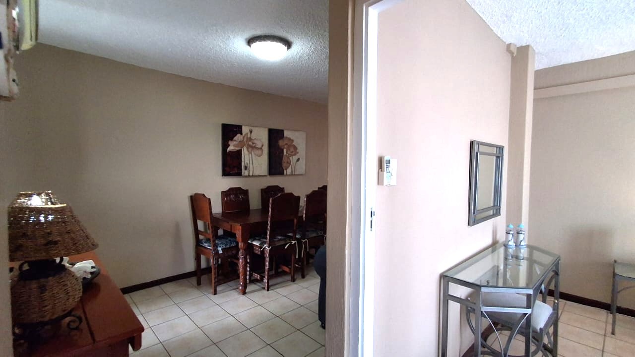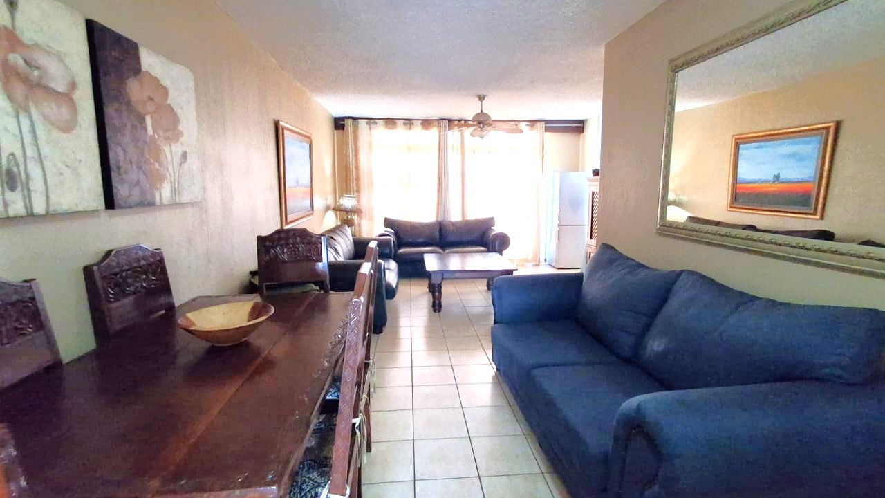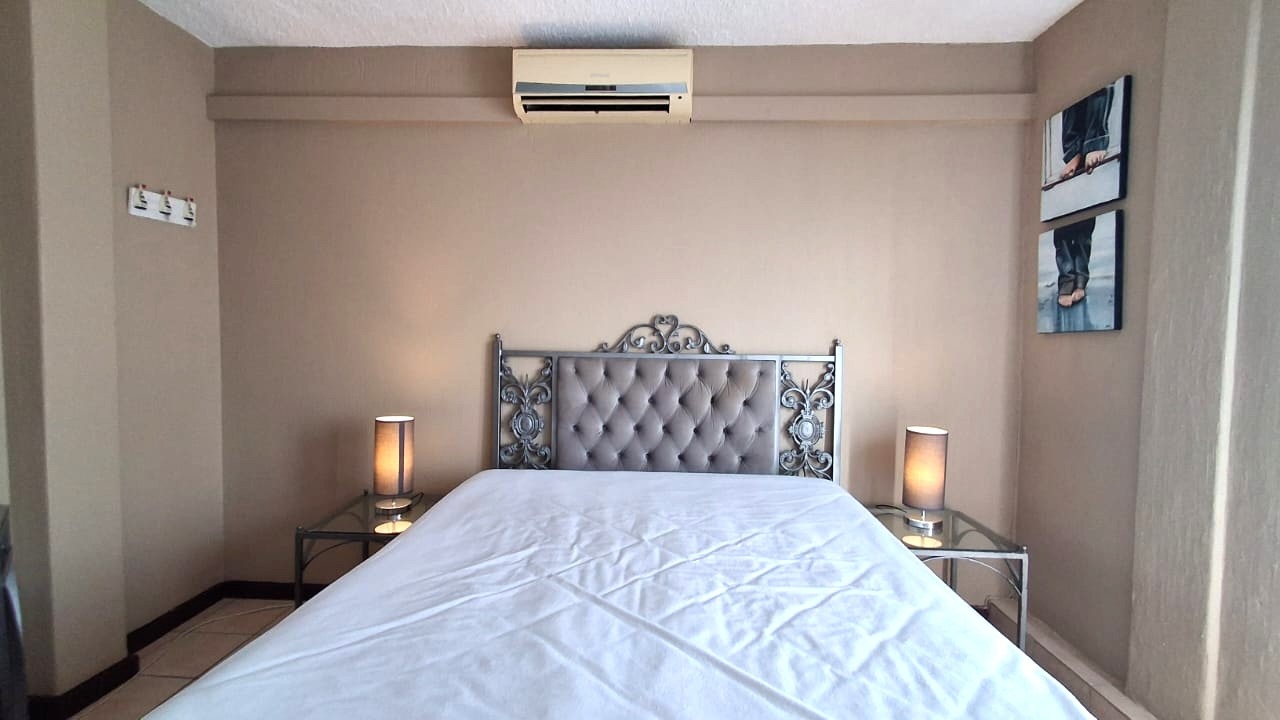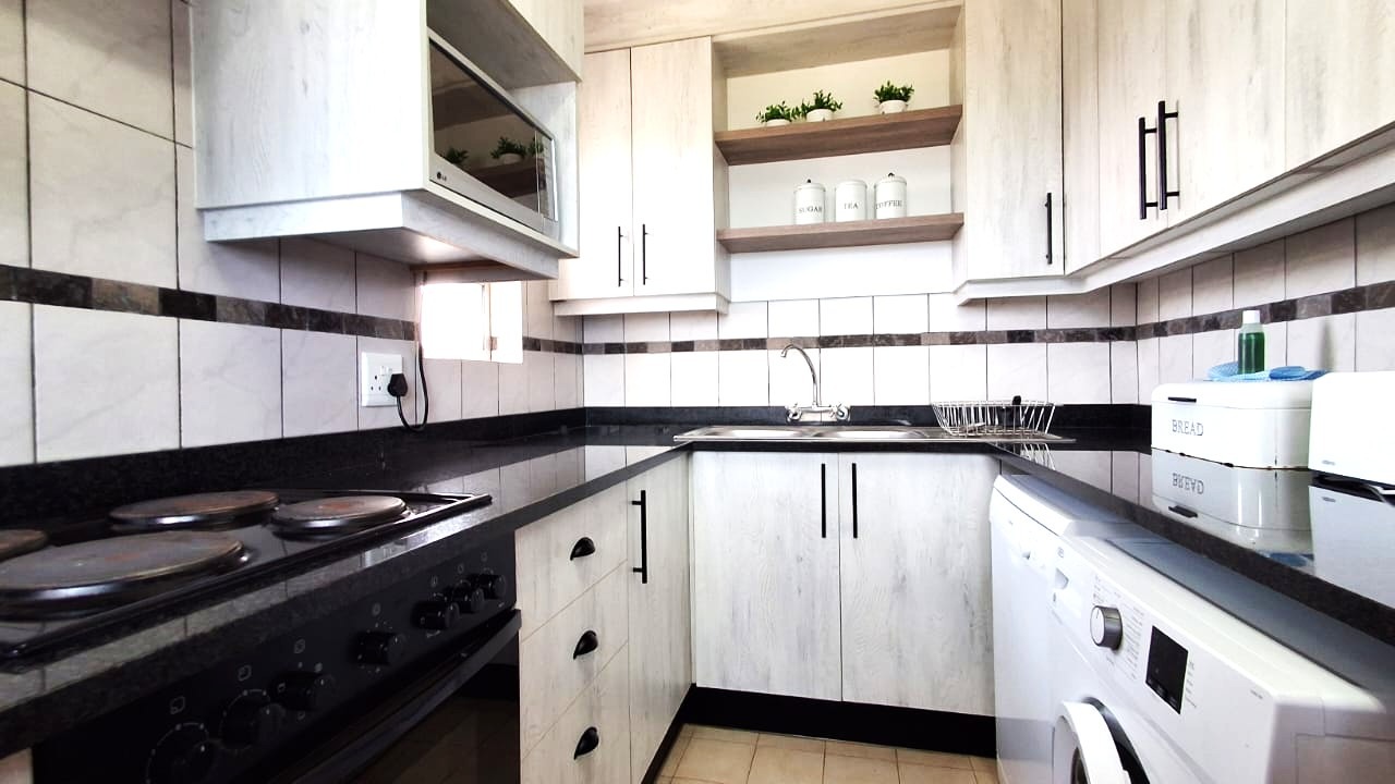 The interior features a well-appointed layout designed for ease and comfort. The apartment includes two bedrooms and a single bathroom, alongside a spacious lounge area. A modern kitchen, equipped with light wood-look cabinetry, dark granite countertops, and integrated appliances, an oven and hob. Tiled flooring extends throughout the unit, complemented by air conditioning for climate control and ceiling fans for additional airflow.
