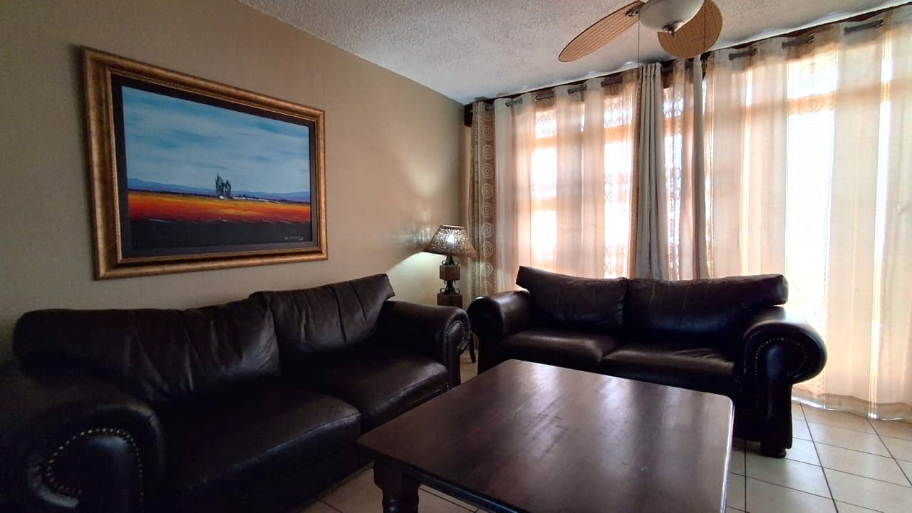 The interior features a well-appointed layout designed for ease and comfort. The apartment includes two bedrooms and a single bathroom, alongside a spacious lounge area. A modern kitchen, equipped with light wood-look cabinetry, dark granite countertops, and integrated appliances, an oven and hob. Tiled flooring extends throughout the unit, complemented by air conditioning for climate control and ceiling fans for additional airflow.