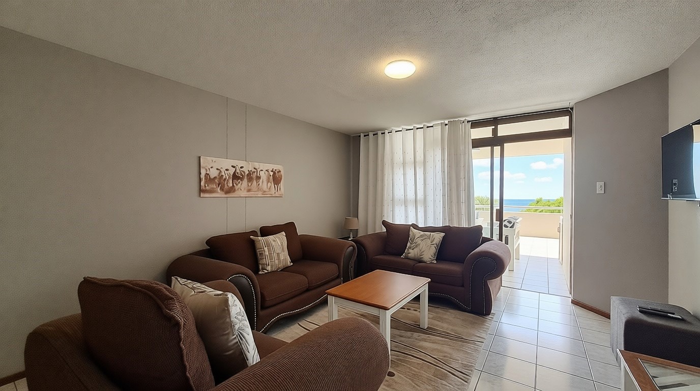The spacious living area extends to a generous outdoor patio or balcony, perfect for entertaining. Here, you'll find a built-in braai and comfortable seating, all while enjoying panoramic sea views. The complex also boasts a communal pool, ideal for relaxation and aquatic activities. With 1 dedicated parking space and visitor parking.