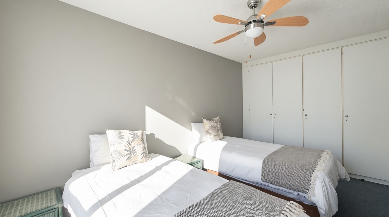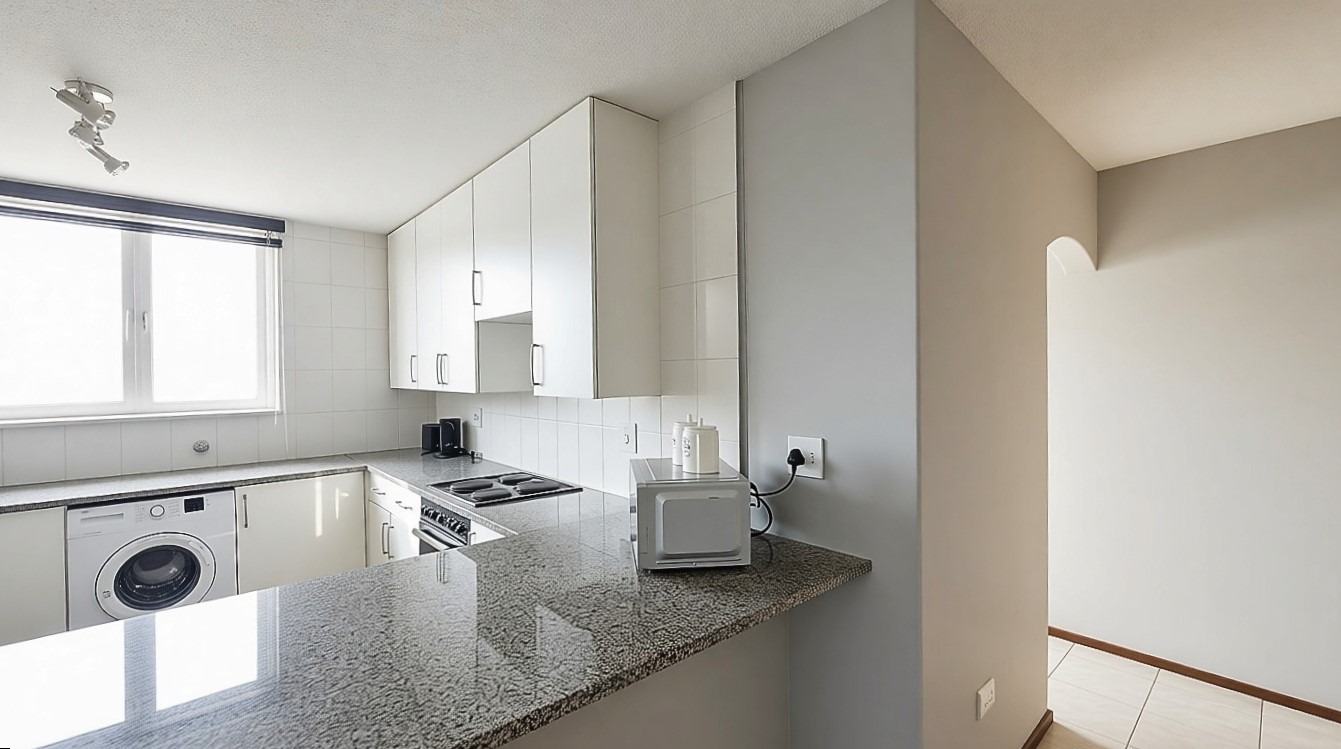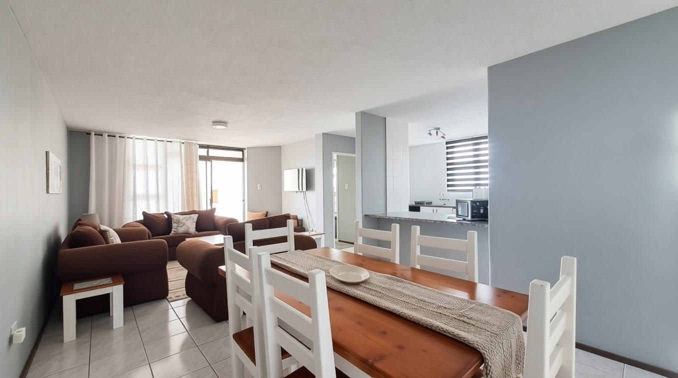Discover coastal living in this inviting 3-bedroom, 2-bathroom apartment located in the vibrant Manaba Beach, Margate. This furnished residence offers an open-plan layout, seamlessly connecting the living, dining, and kitchen areas, all bathed in natural light. The modern kitchen features white cabinetry, granite-look countertops, a breakfast bar, and an integrated washing machine, providing both style and functionality.