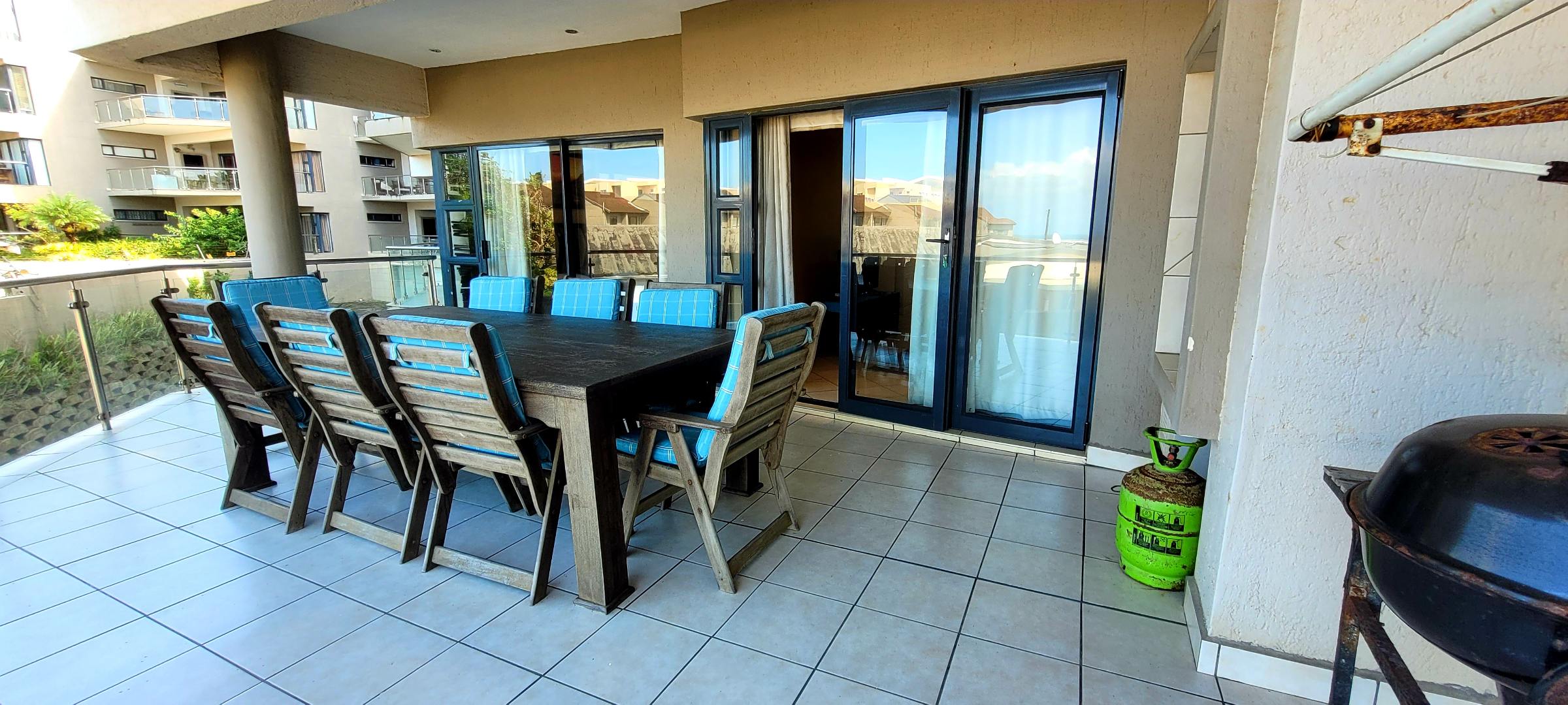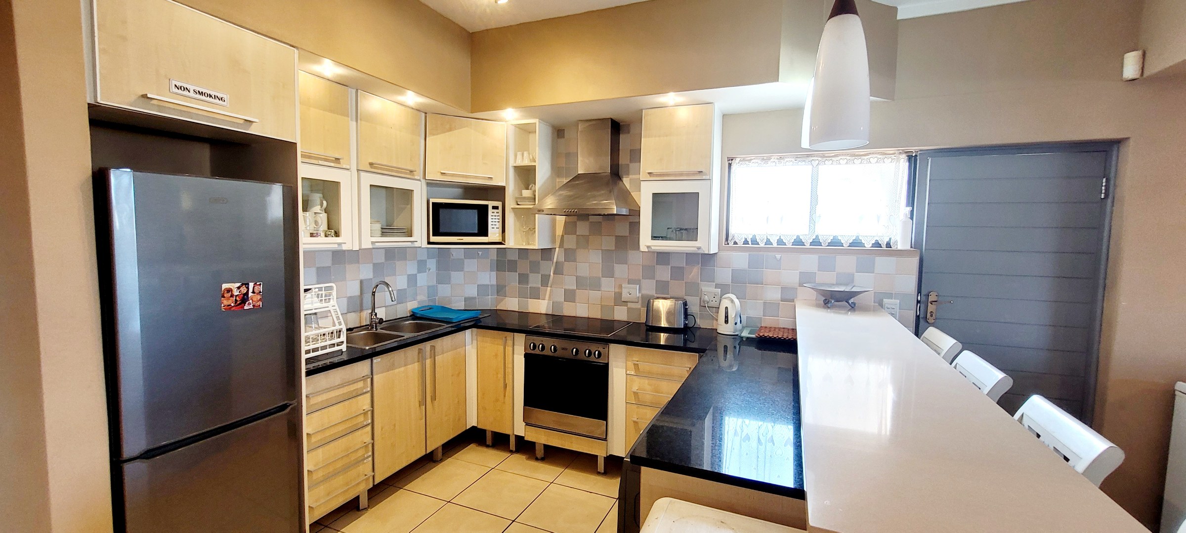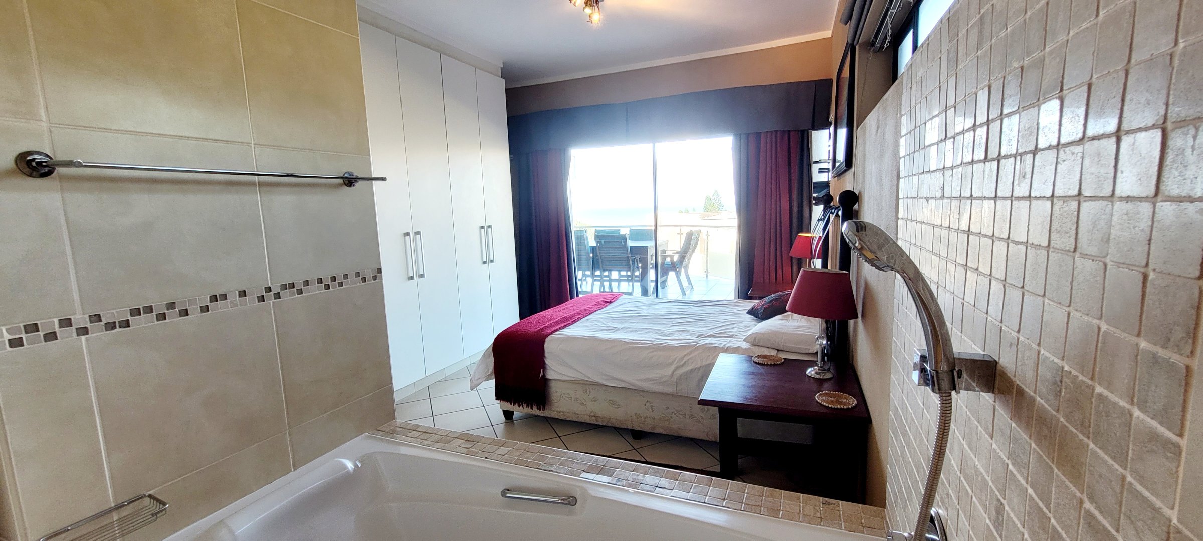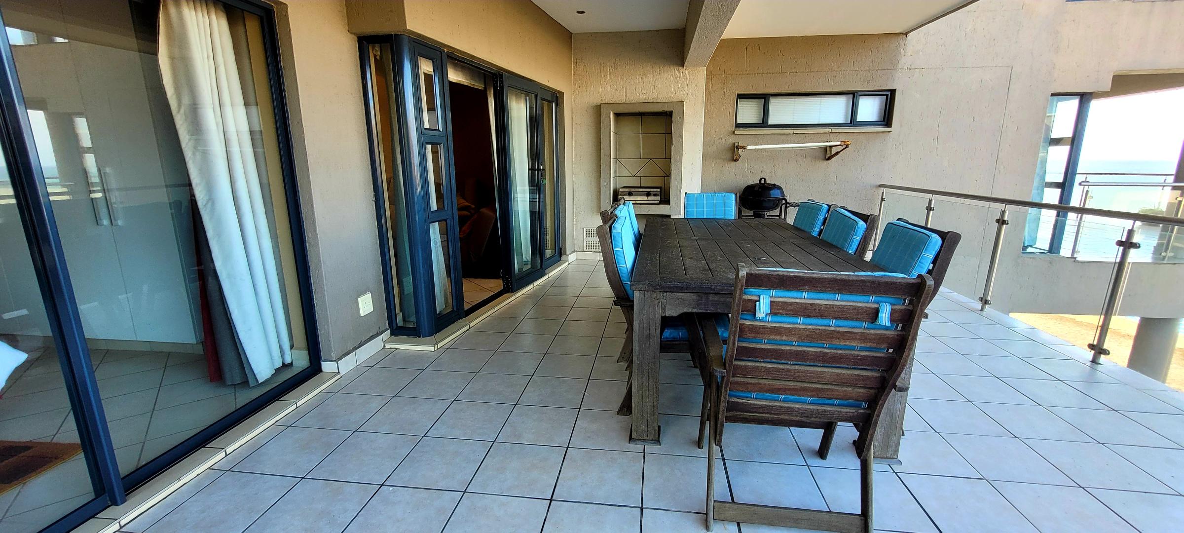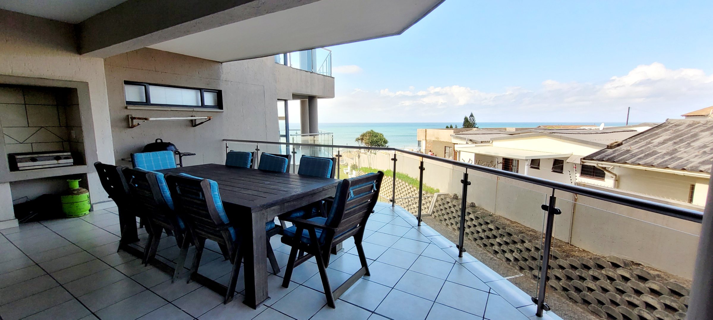 The apartment is spacious and modern and comes fully furnished. Upon entrance you will note that the apartment is fully tiled and offers an open-plan kitchen/dining/lounge area. The kitchen has ample built-in cupboards with lovely granite counter tops, an electric stove/oven and undercounter space for all machines. The breakfast nook caters for 4 people with a higher level granite top and modern lights hanging from the ceiling. From the lounge there are stacking doors that lead out onto the patio/braai area that overlooks the swimming pool and ocean. There are three spacious bedrooms with built-in cupboards. The main bedroom has a lovely en-suite full bathroom and a sliding door that leads out onto the patio. The second bathroom is also a full bathroom that is neatly tiled. Definitely the apartment that suites the whole family.