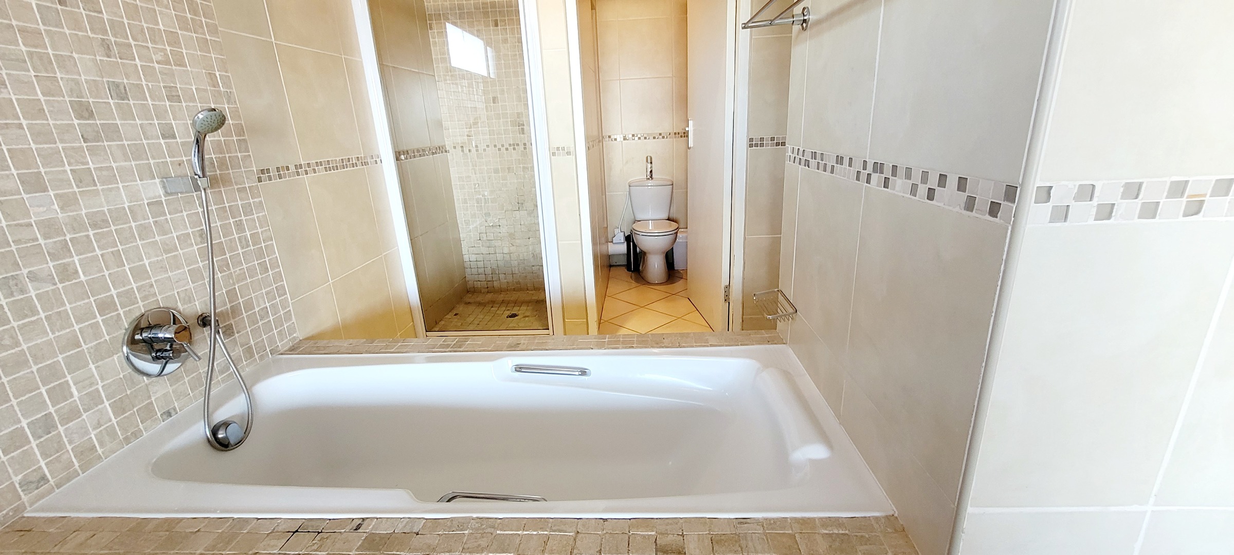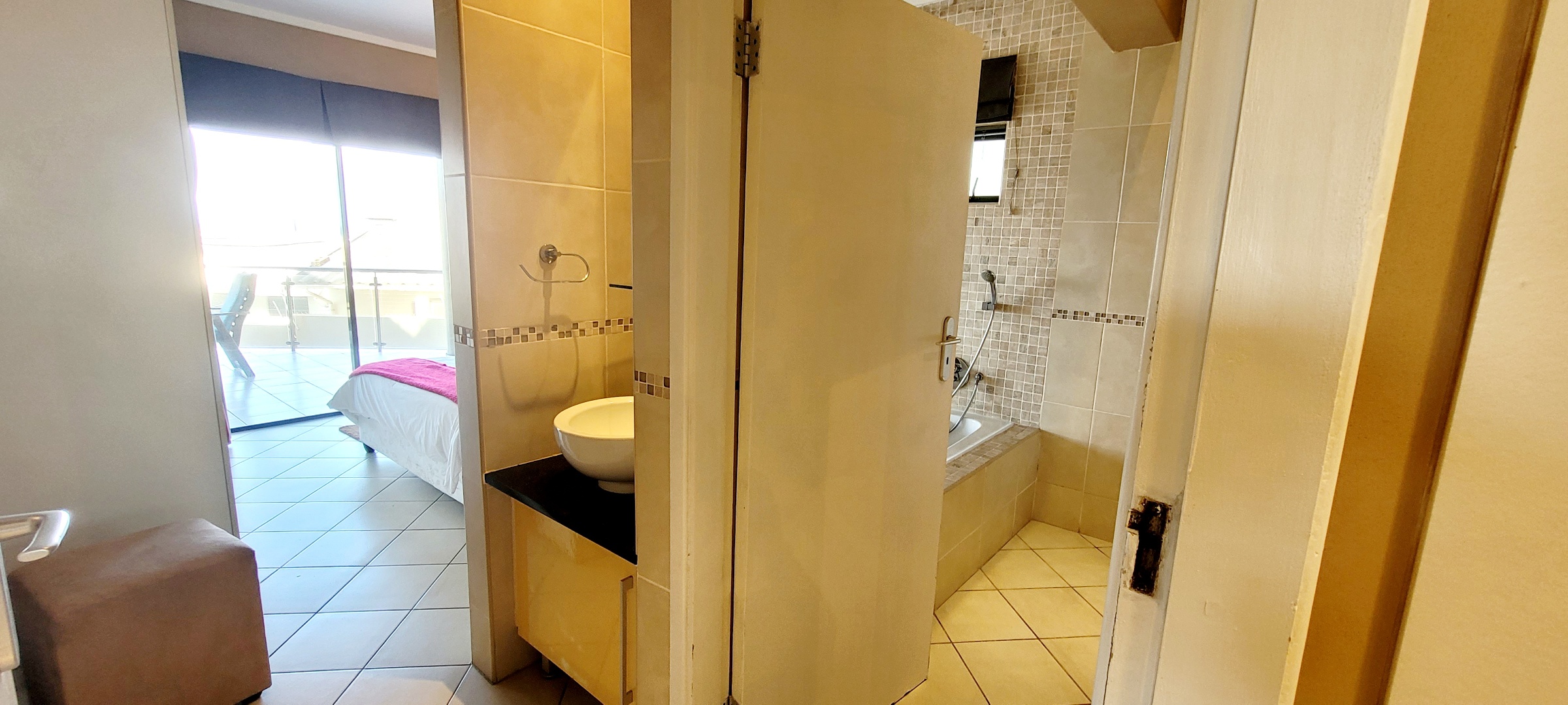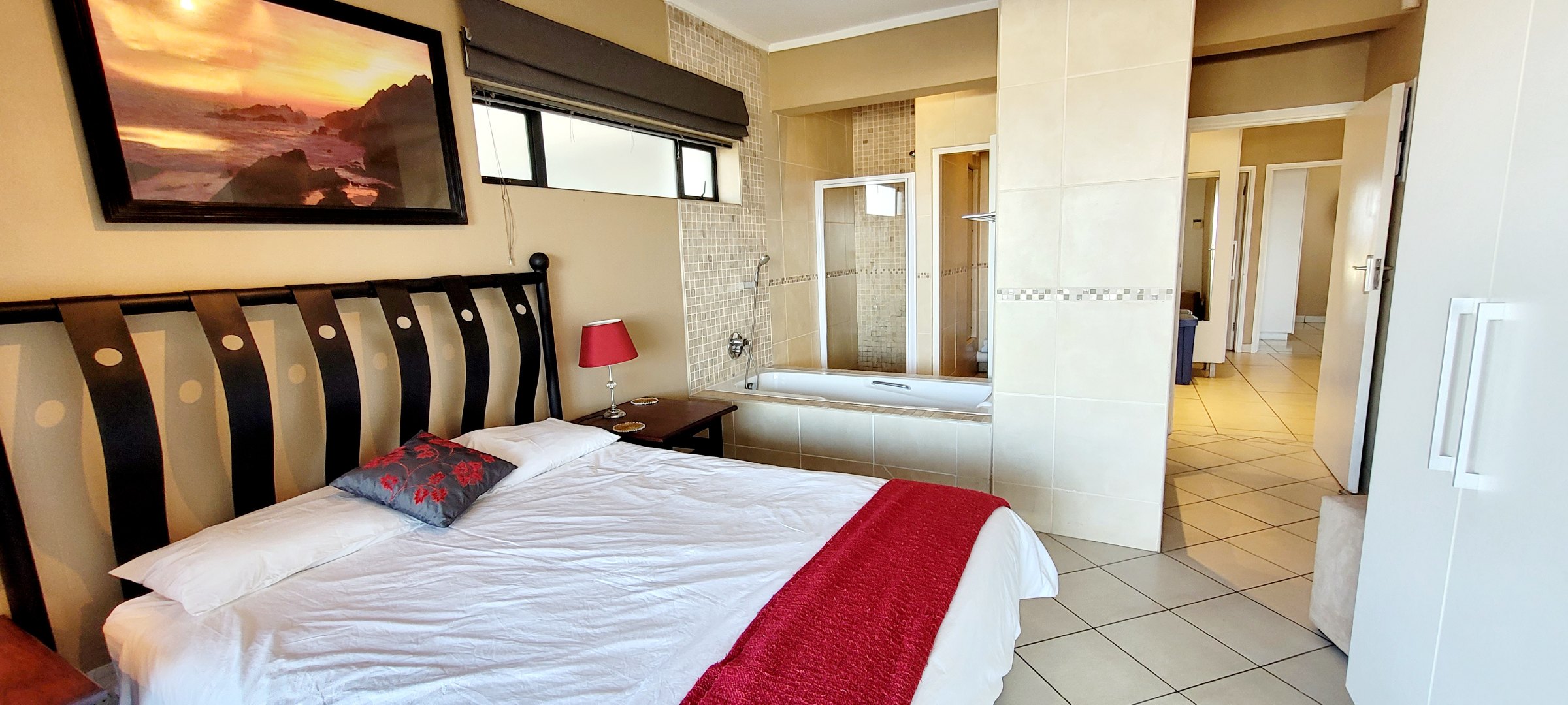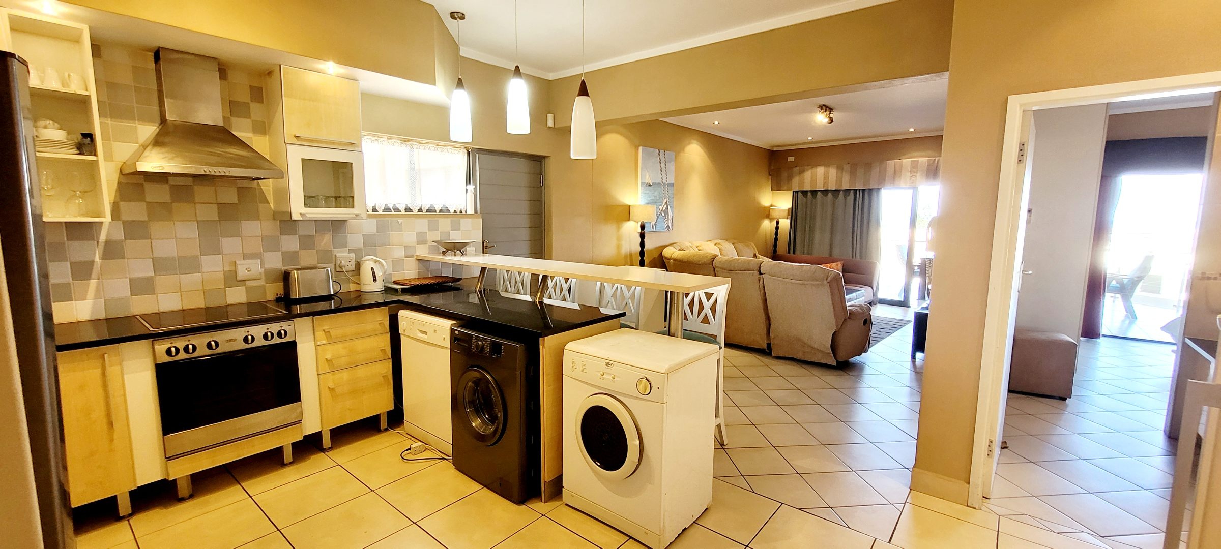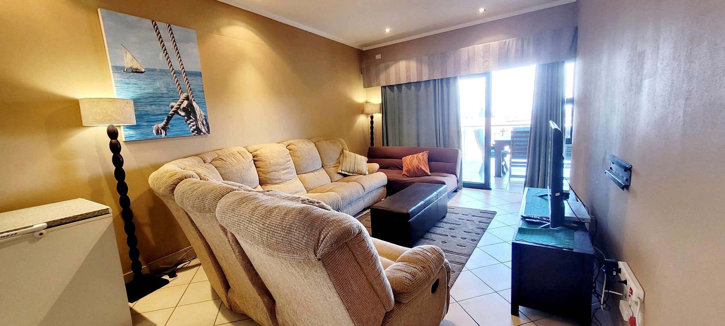 The apartment is spacious and modern and comes fully furnished. Upon entrance you will note that the apartment is fully tiled and offers an open-plan kitchen/dining/lounge area. The kitchen has ample built-in cupboards with lovely granite counter tops, an electric stove/oven and undercounter space for all machines. The breakfast nook caters for 4 people with a higher level granite top and modern lights hanging from the ceiling. From the lounge there are stacking doors that lead out onto the patio/braai area that overlooks the swimming pool and ocean. There are three spacious bedrooms with built-in cupboards. The main bedroom has a lovely en-suite full bathroom and a sliding door that leads out onto the patio. The second bathroom is also a full bathroom that is neatly tiled. Definitely the apartment that suites the whole family.