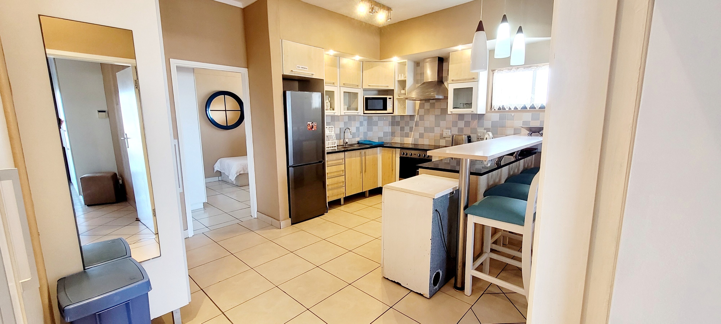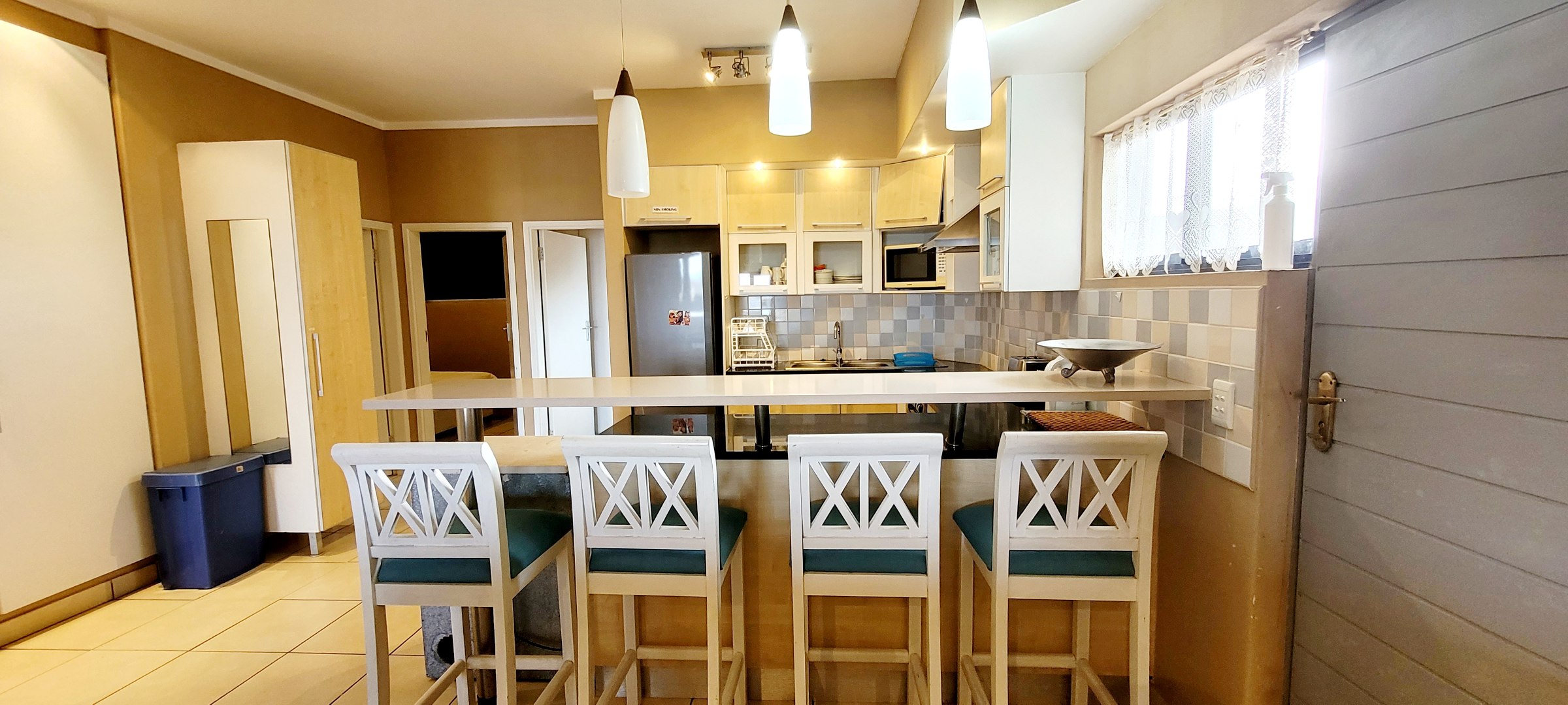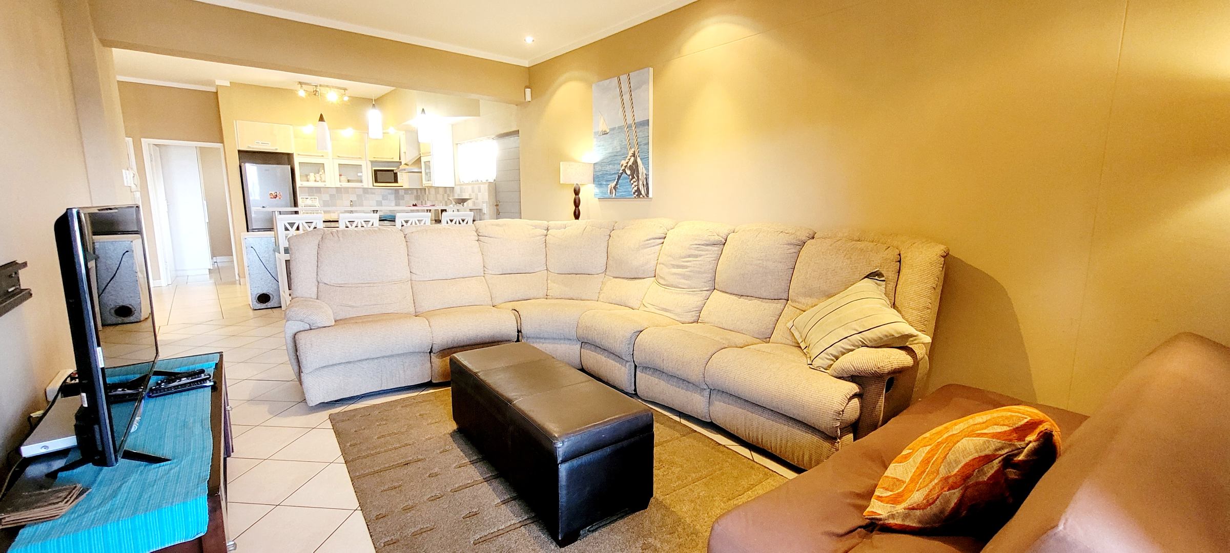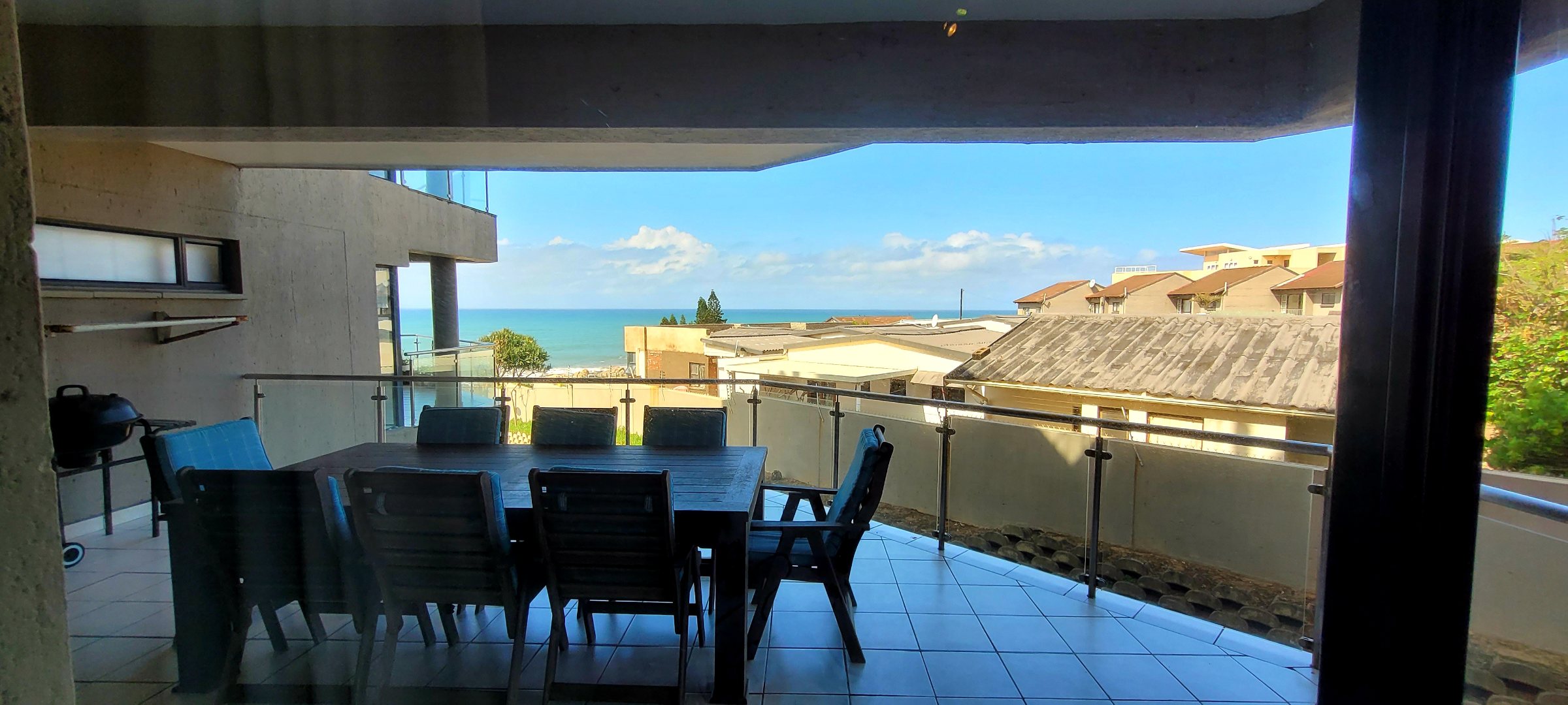 The apartment is spacious and modern and comes fully furnished. Upon entrance you will note that the apartment is fully tiled and offers an open-plan kitchen/dining/lounge area. The kitchen has ample built-in cupboards with lovely granite counter tops, an electric stove/oven and undercounter space for all machines. The breakfast nook caters for 4 people with a higher level granite top and modern lights hanging from the ceiling. From the lounge there are stacking doors that lead out onto the patio/braai area that overlooks the swimming pool and ocean. There are three spacious bedrooms with built-in cupboards. The main bedroom has a lovely en-suite full bathroom and a sliding door that leads out onto the patio. The second bathroom is also a full bathroom that is neatly tiled. Definitely the apartment that suites the whole family.