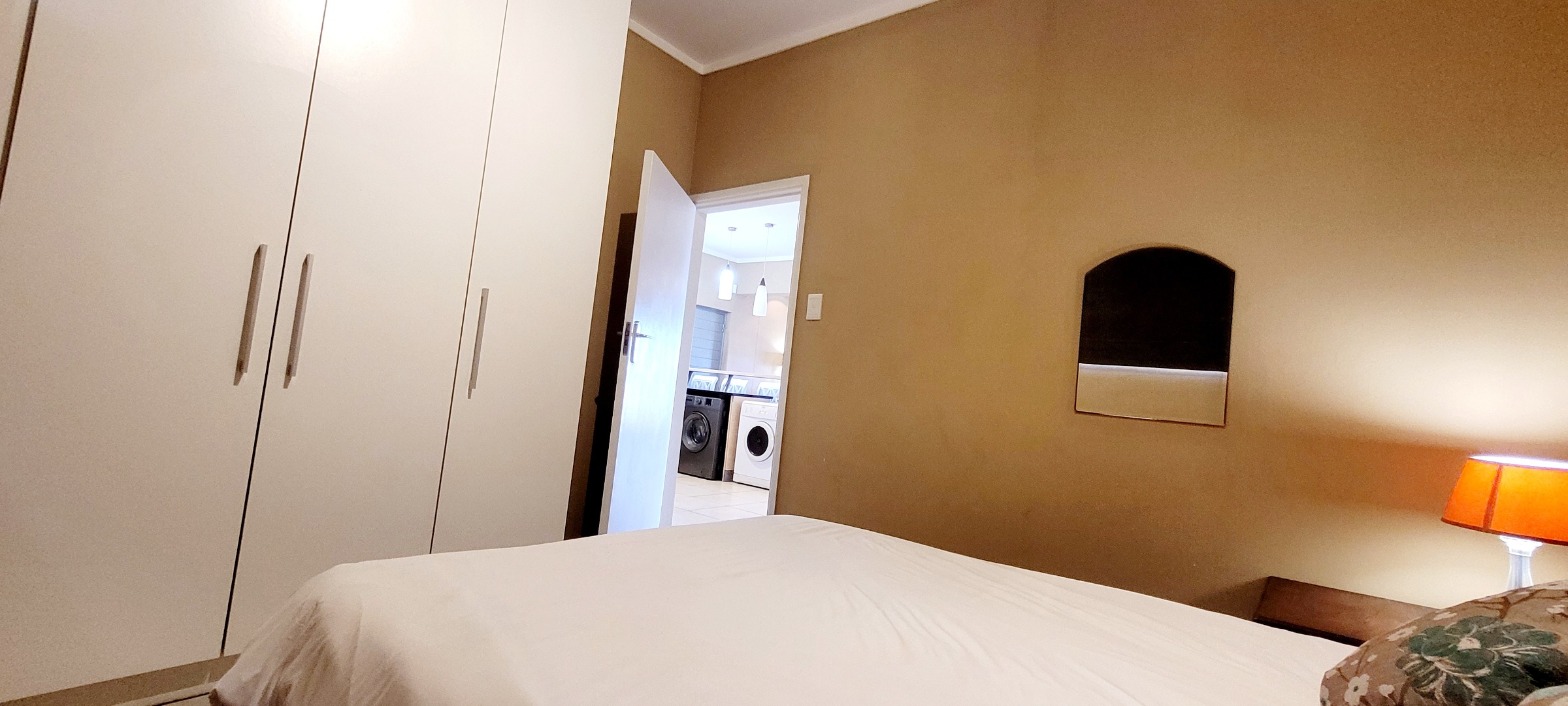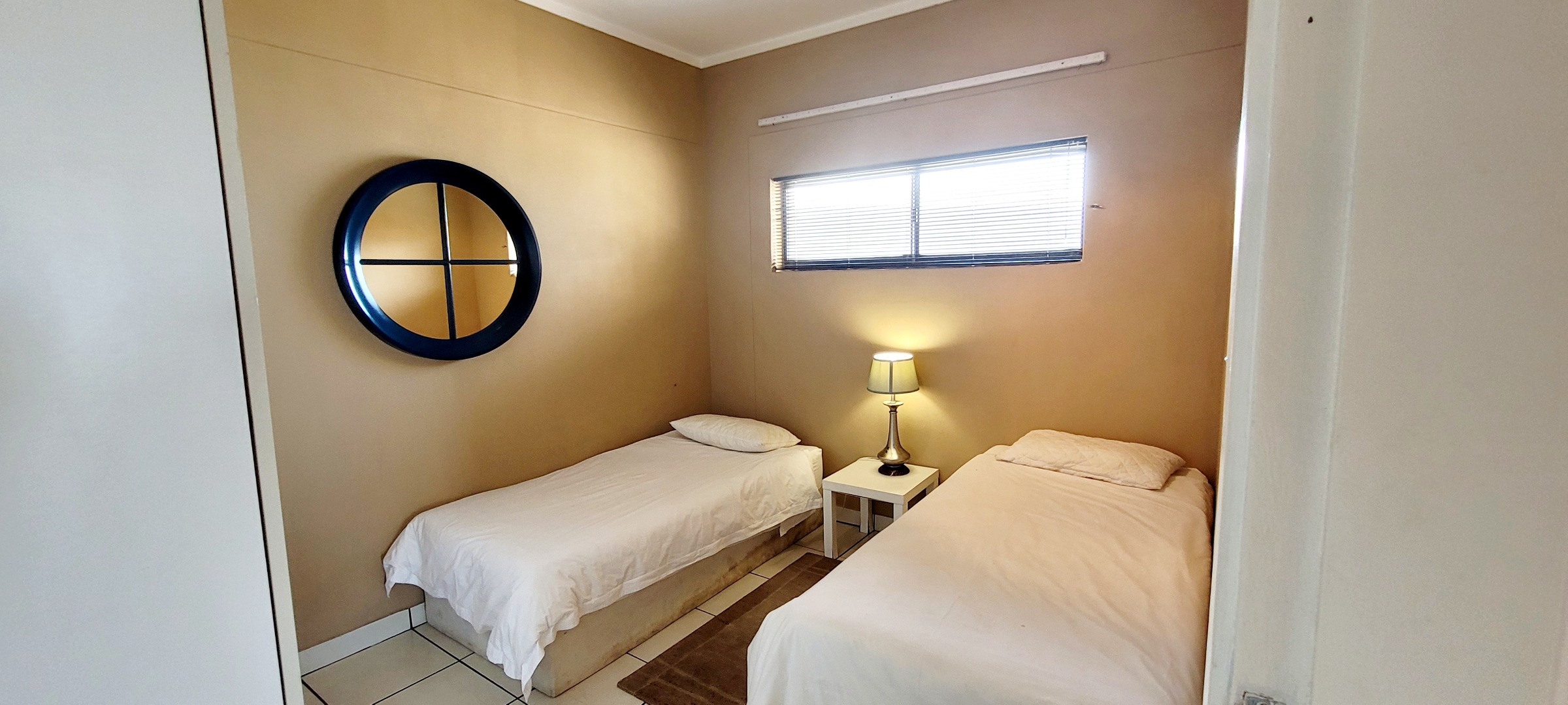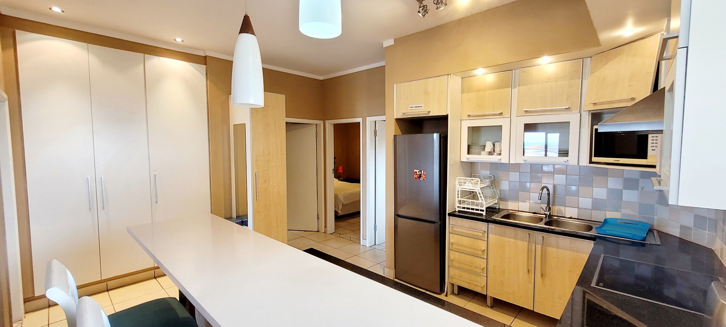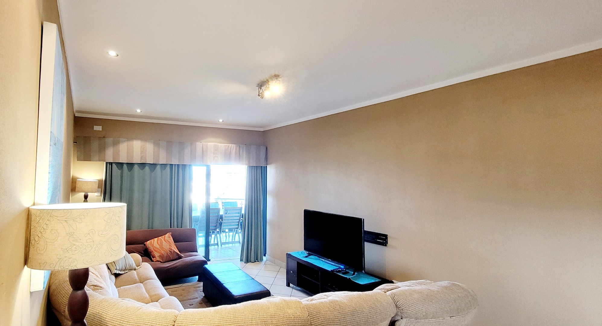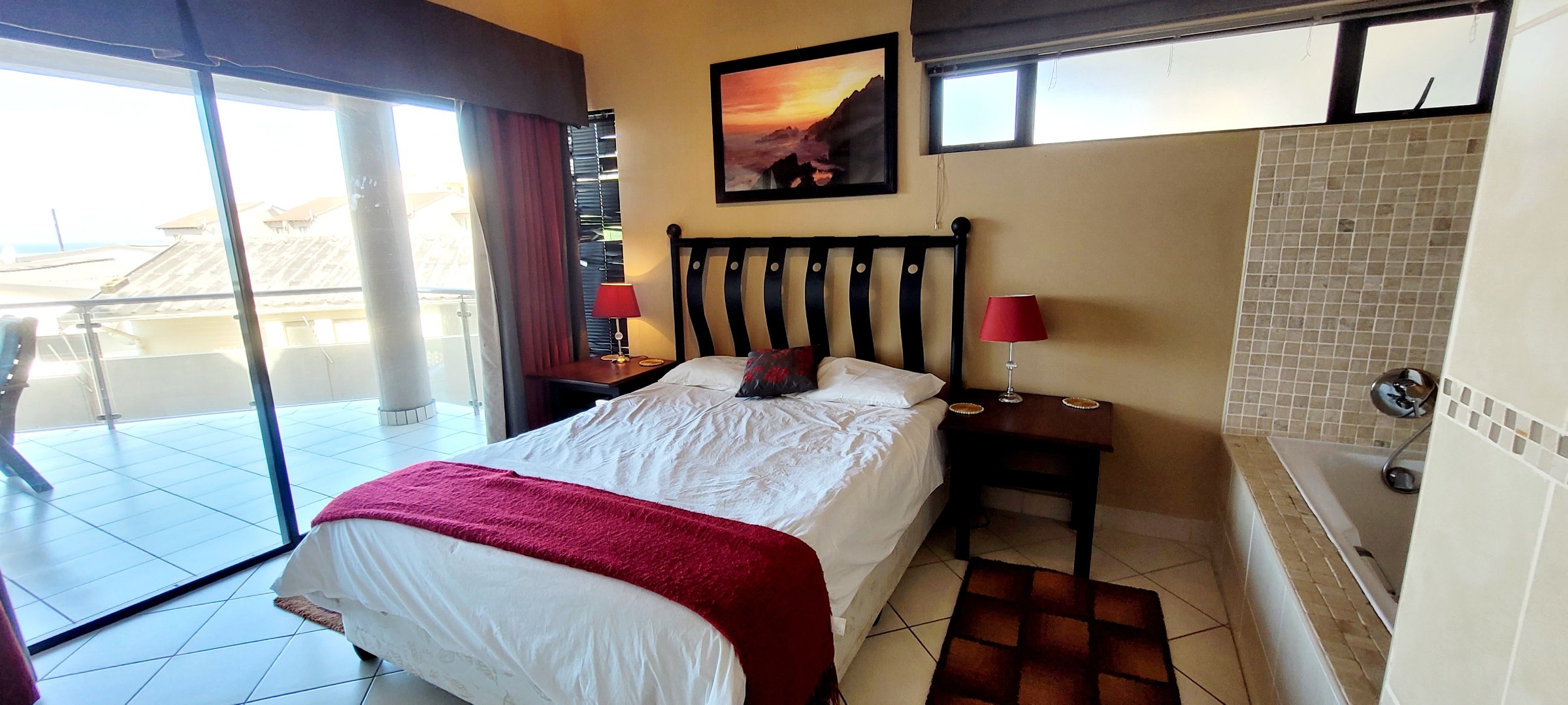 The apartment is spacious and modern and comes fully furnished. Upon entrance you will note that the apartment is fully tiled and offers an open-plan kitchen/dining/lounge area. The kitchen has ample built-in cupboards with lovely granite counter tops, an electric stove/oven and undercounter space for all machines. The breakfast nook caters for 4 people with a higher level granite top and modern lights hanging from the ceiling. From the lounge there are stacking doors that lead out onto the patio/braai area that overlooks the swimming pool and ocean. There are three spacious bedrooms with built-in cupboards. The main bedroom has a lovely en-suite full bathroom and a sliding door that leads out onto the patio. The second bathroom is also a full bathroom that is neatly tiled. Definitely the apartment that suites the whole family.